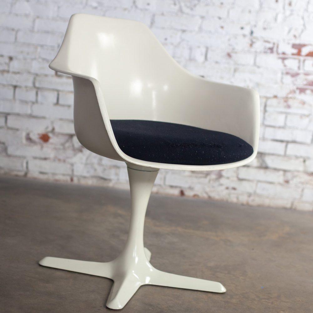 This handsome armchair is SINGLE and ready to MINGLE!!!! Mingle its way right into your heart… and home!!! LOL!! This is a FABULOUS Tulip chair by Burke comprised of a white fiberglass armed shell mounted on a white painted metal shaft with a four-prong base and loose seat pad wearing a black hopsacking fabric that honestly… has seen better days. It will need reupholstered BUT we never think of reupholstering as a negative because we LOVE new fabrics!!! Just think of the limitless options!! SO many great colors, patterns, and textures!! It is made and labeled by Burke Inc. in the style of Saarinen’s famed tulip fiberglass shell chairs. Burke modeled their fiberglass chairs after Saarinen’s tulip chair and Eames fiberglass shell chairs as a more affordable option for the masses. But they made them with changes and enhancements that have made them become collectable in their own right. Kind of a second cousin of sorts with lots of style and sass. It will be great in your bedroom dressing area, at a vanity or desk, in your sitting room next to an accent table, or maybe at the entry for a marvelous spot to sit and remove your shoes. And, whether you have a mid-century modern home, an industrial loft, a Modern setting, or any style in between… it will look fabulous anywhere you decide.