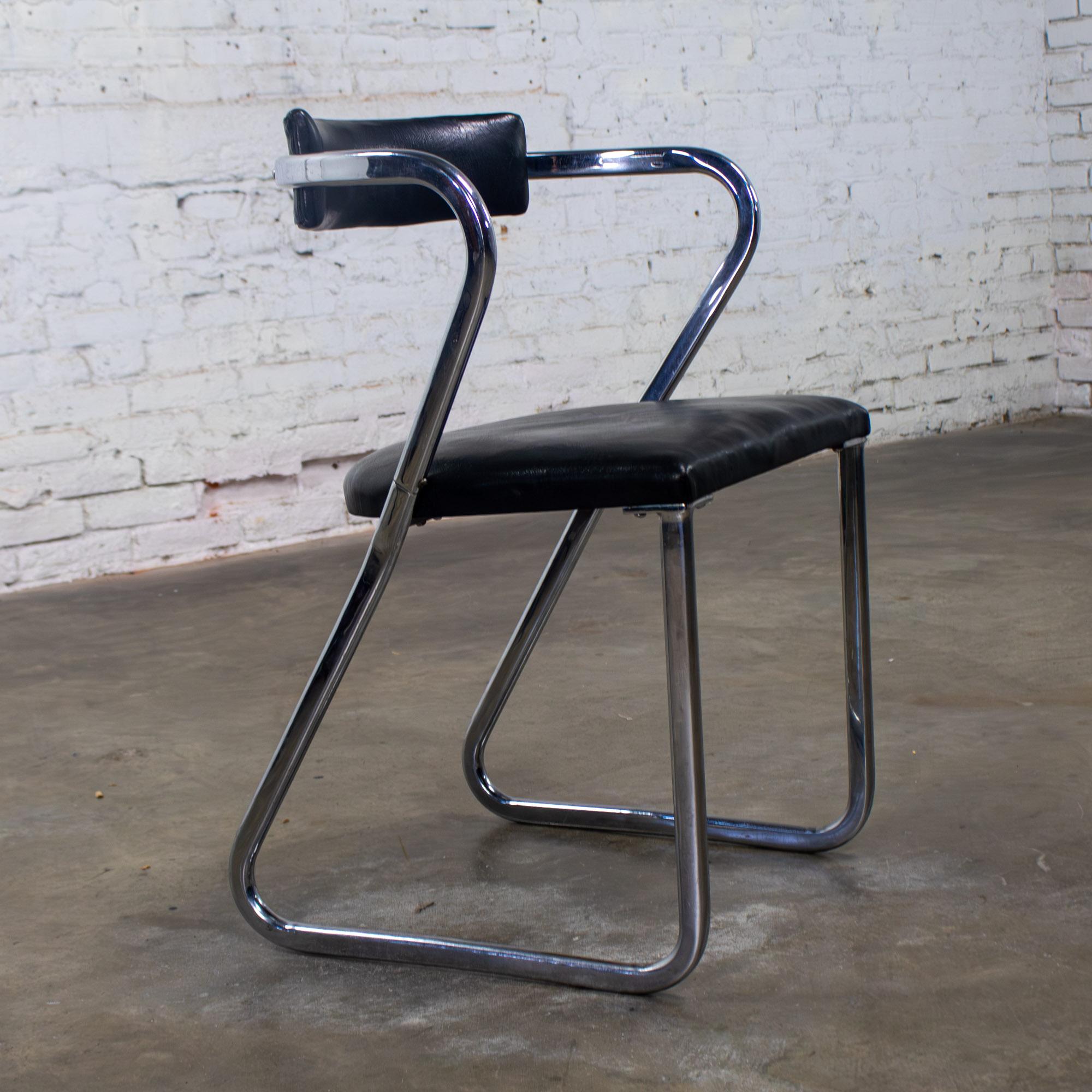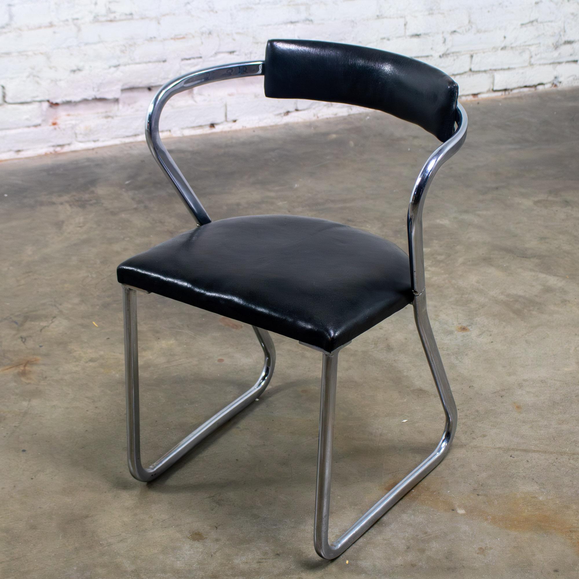 Fantastic vintage Art Deco Streamline & Art Moderne side chair composed of a chrome tube frame & black vinyl back & seat cushion manner of Gilbert Rohde. This piece has been attributed based upon archived research including online sources, vintage documentation and catalogs, designer literature, and other materials however, it is not signed or marked in any way. Beautiful condition, keeping in mind that this is vintage and not new so will have signs of use and wear even if it has been refinished or restored. Please see photos, zoom in for details, and see long description as they are part of the condition report. We attempt to portray any imperfections. Circa, 1920-1930’s.
