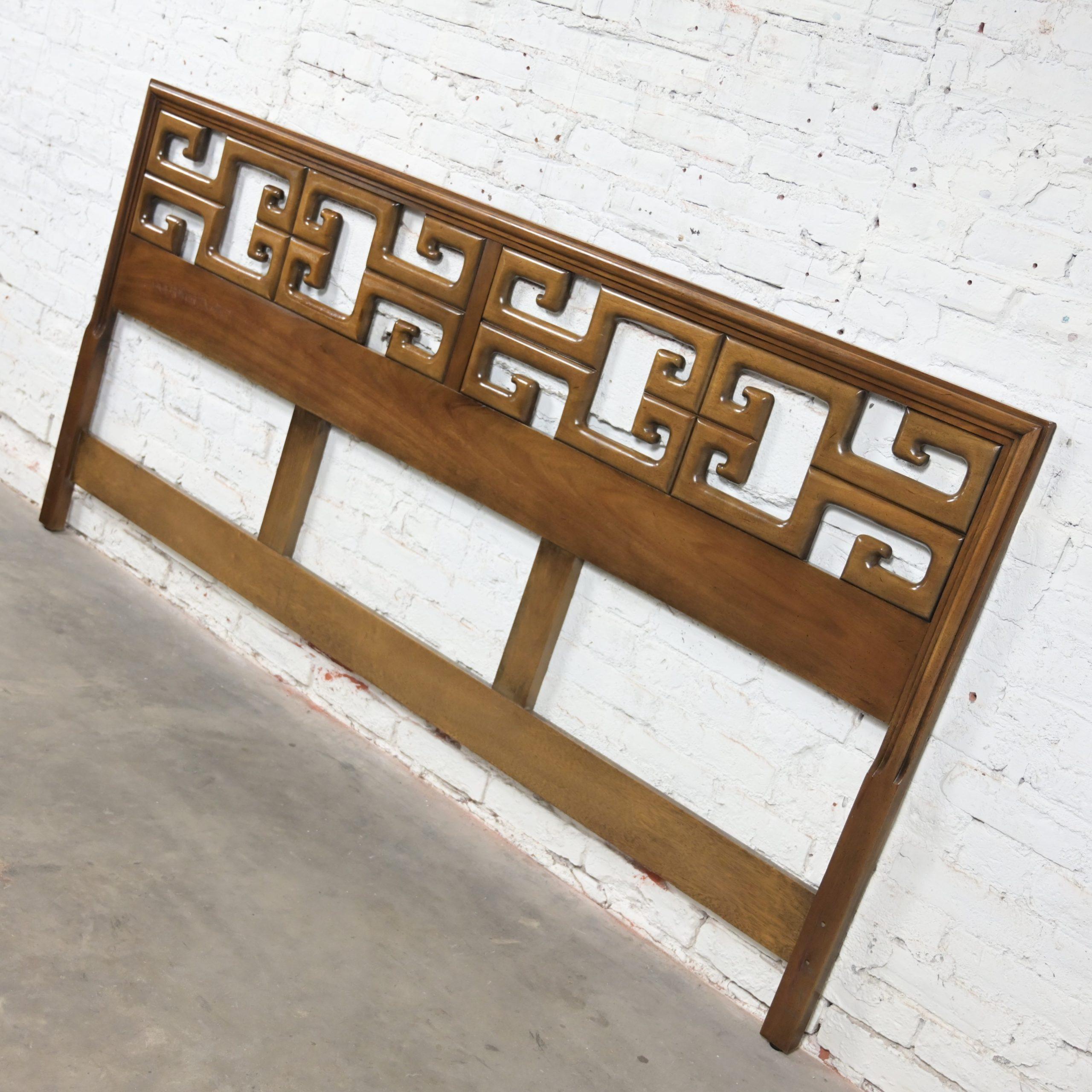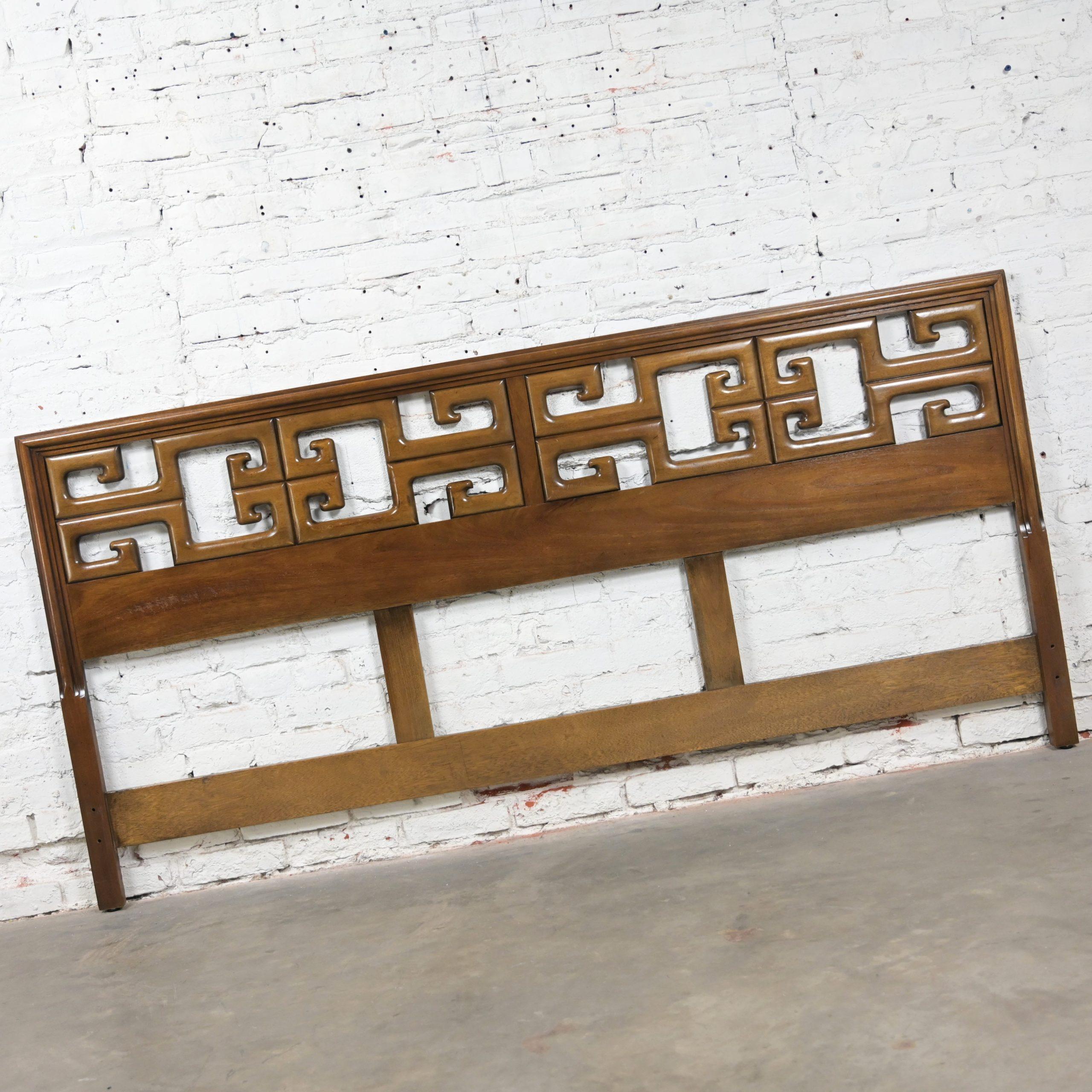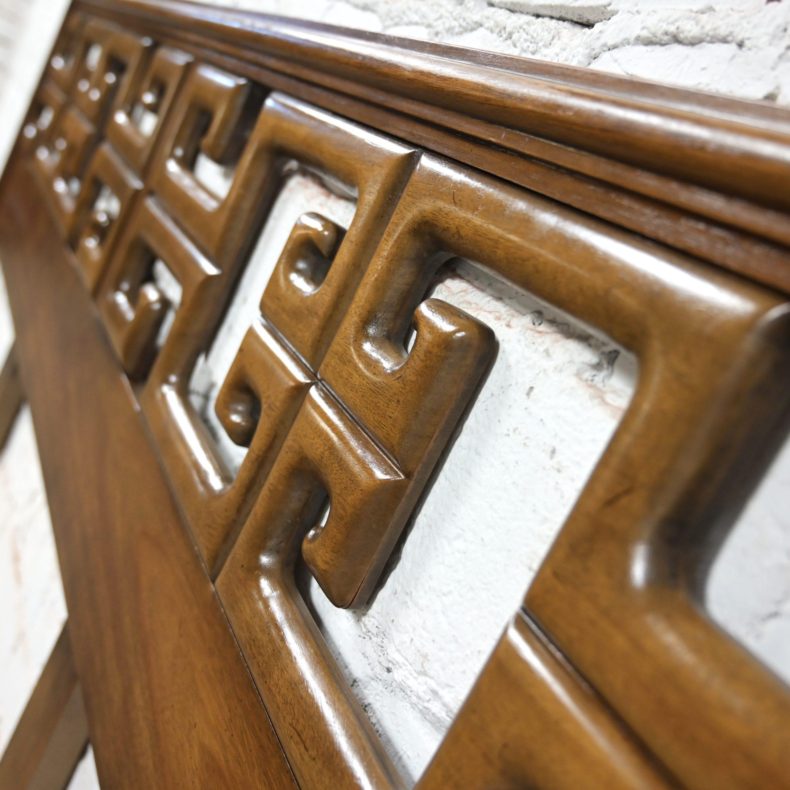 Get ready to Slumber in Style!!! This is a marvelous vintage Greek Key or Meander fretwork designed walnut toned hardwood king sized headboard. Meander is simply the Asian version of Greek Key so… you choose your term!! Either way, it is going to be gorgeous in your bedroom! All you need is a king-sized mattress and a Hollywood frame OR if you don’t mind the opinion of my mom, who is an EXCEPTIONAL retired interior designer… She would have a hanging mechanism or wall cleat made so that you can attach it to the wall and lift it a little higher, use a platform rather than a Hollywood frame, and toss out the box springs as mattresses today are much taller than they used to be. Annnnnd, Voila! Maximum exposure of the headboard! If that sounds like something you would be interested in, we would be happy to provide a wall cleat upon purchase of the headboard. OR… use a twin-sized mattress and turn it sideways and use it as an incredible daybed!! This is a gorgeous example of high-quality craftsmanship constructed with exquisite hardwood and a magnificent Chinoiserie style! This headboard is EXACTLY what you’ve been looking for, so why wait?? Make it YOURS!!!