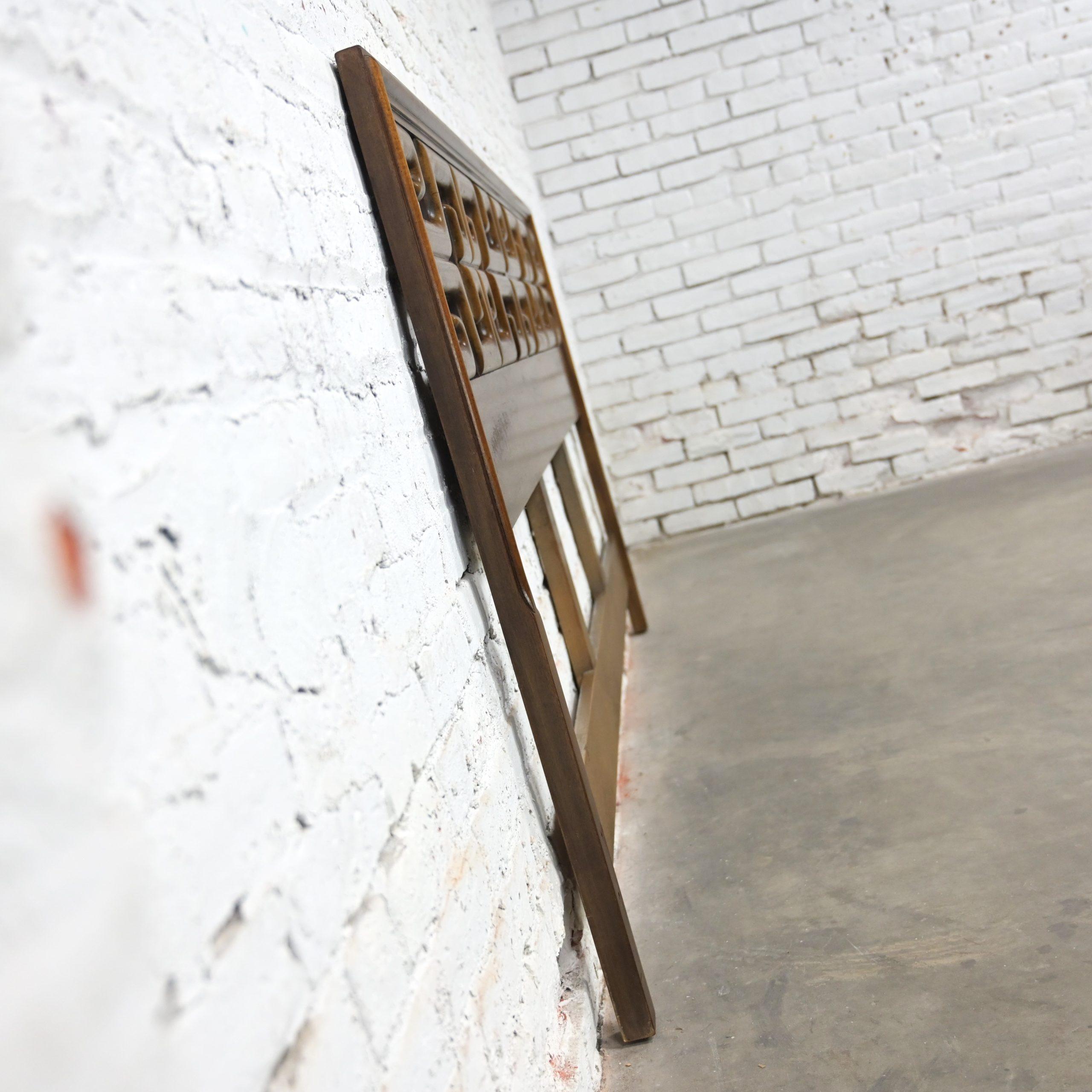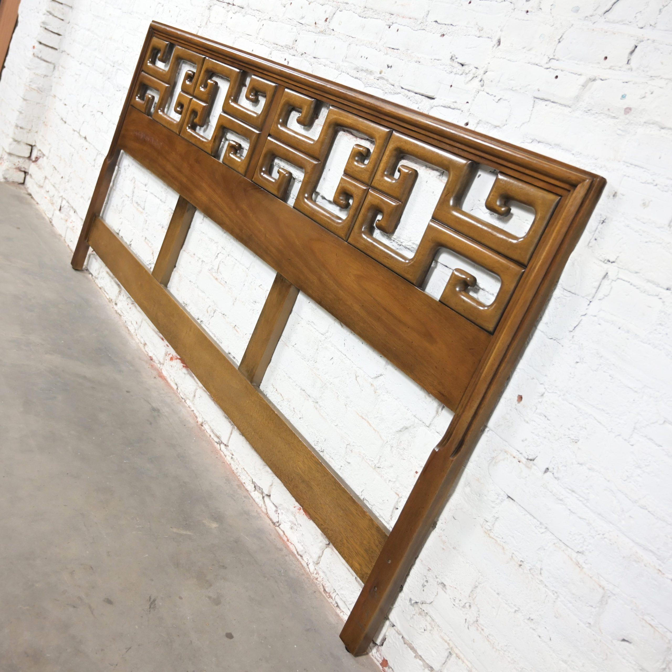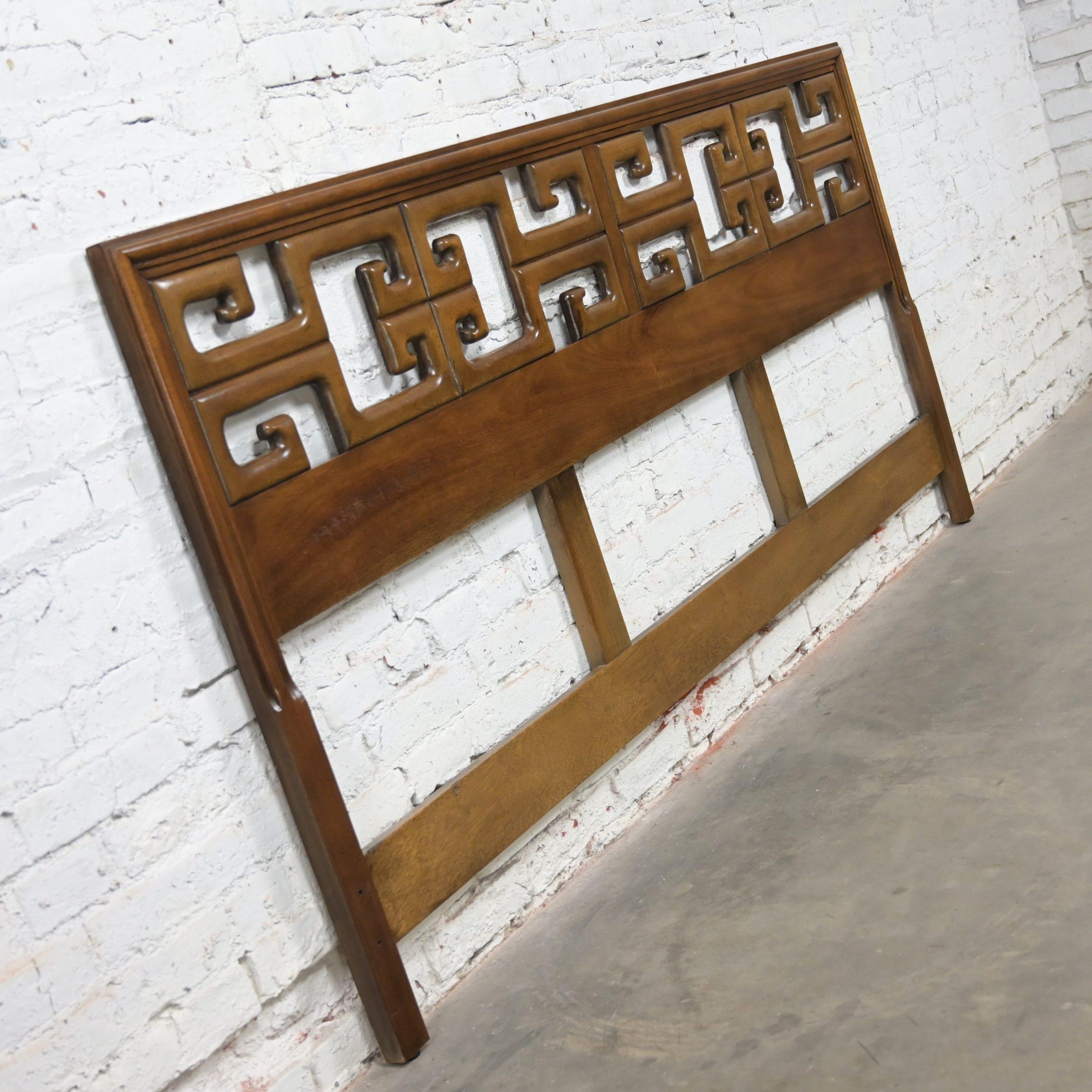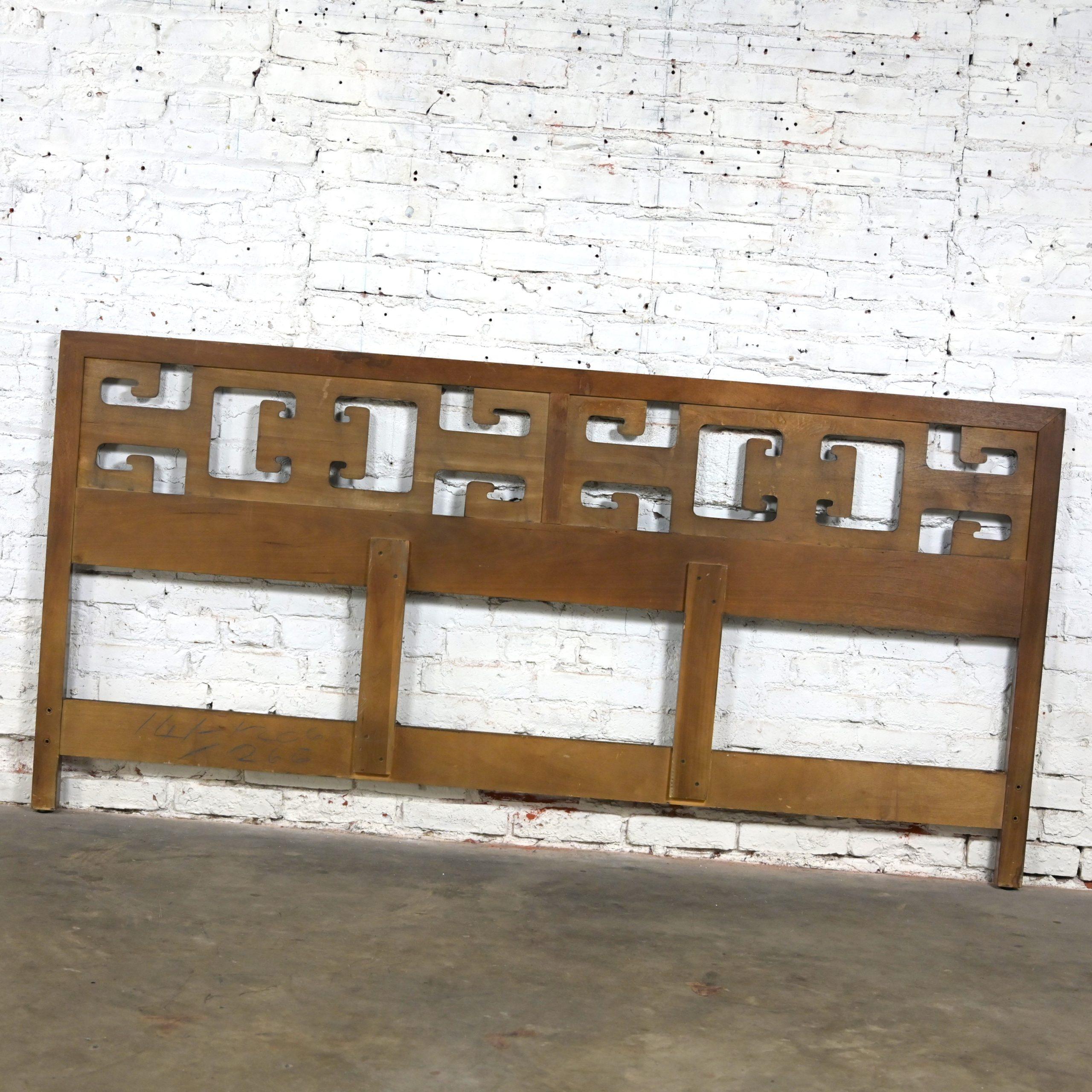 Get ready to Slumber in Style!!! This is a marvelous vintage Greek Key or Meander fretwork designed walnut toned hardwood king sized headboard. Meander is simply the Asian version of Greek Key so… you choose your term!! Either way, it is going to be gorgeous in your bedroom! All you need is a king-sized mattress and a Hollywood frame OR if you don’t mind the opinion of my mom, who is an EXCEPTIONAL retired interior designer… She would have a hanging mechanism or wall cleat made so that you can attach it to the wall and lift it a little higher, use a platform rather than a Hollywood frame, and toss out the box springs as mattresses today are much taller than they used to be. Annnnnd, Voila! Maximum exposure of the headboard! If that sounds like something you would be interested in, we would be happy to provide a wall cleat upon purchase of the headboard. OR… use a twin-sized mattress and turn it sideways and use it as an incredible daybed!! This is a gorgeous example of high-quality craftsmanship constructed with exquisite hardwood and a magnificent Chinoiserie style! This headboard is EXACTLY what you’ve been looking for, so why wait?? Make it YOURS!!!