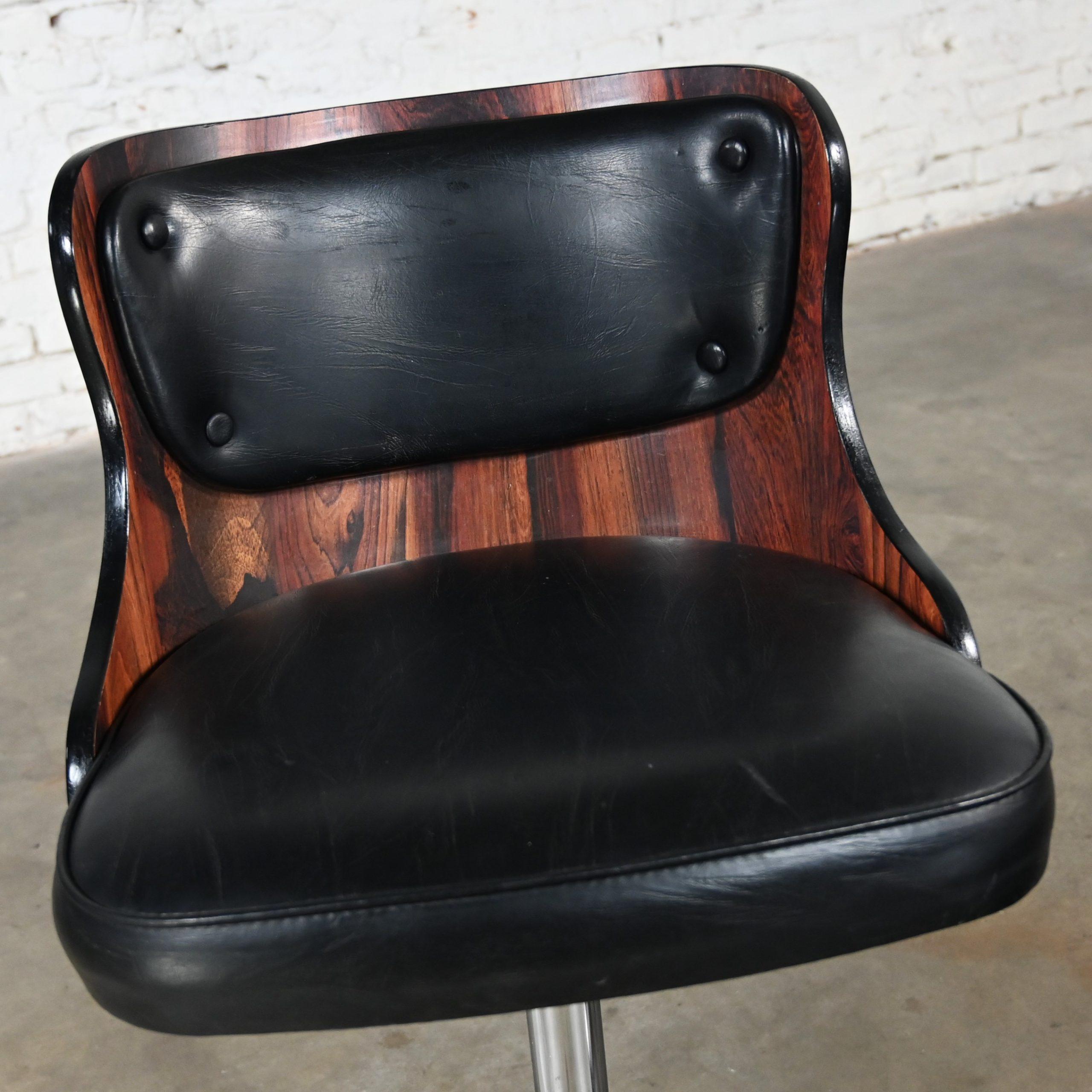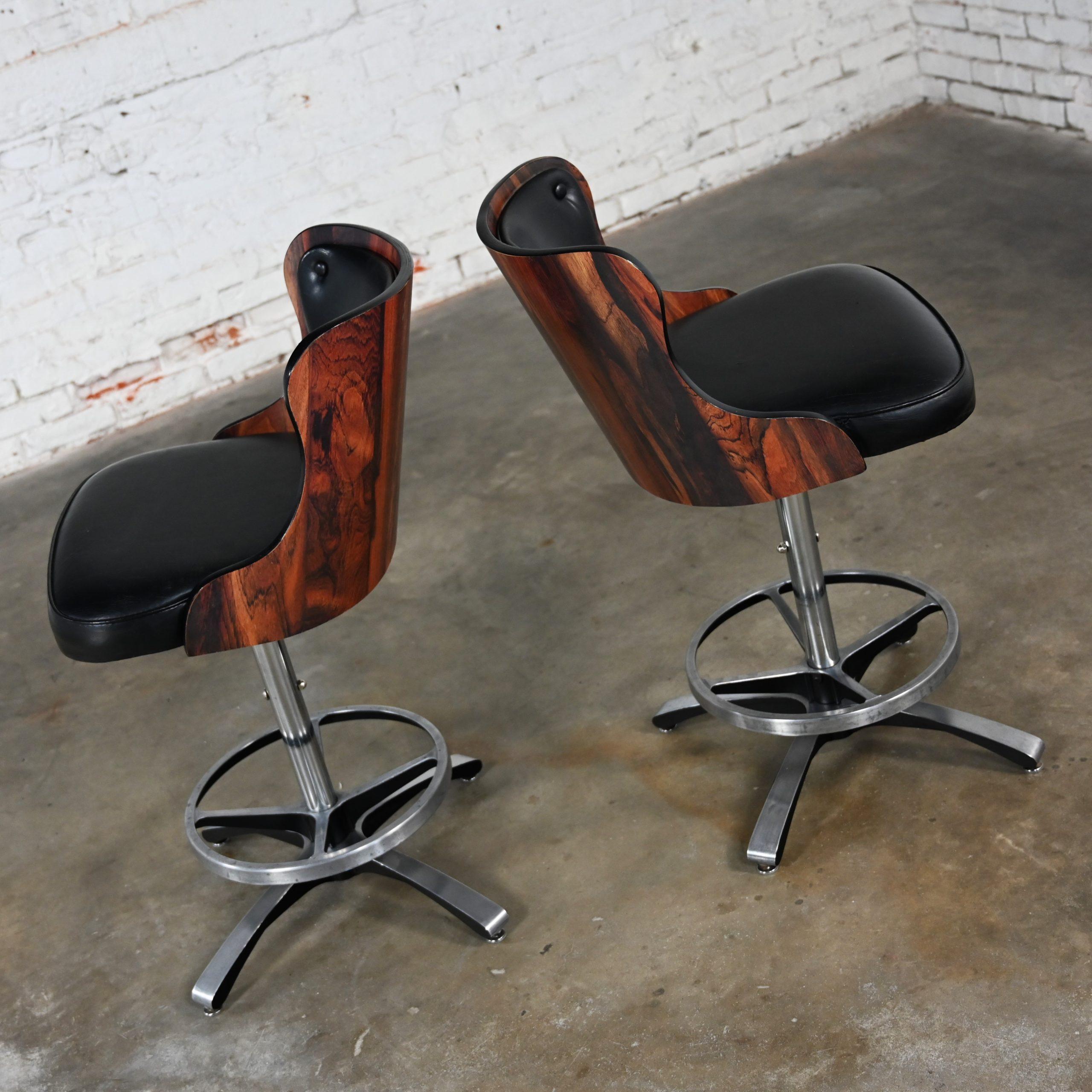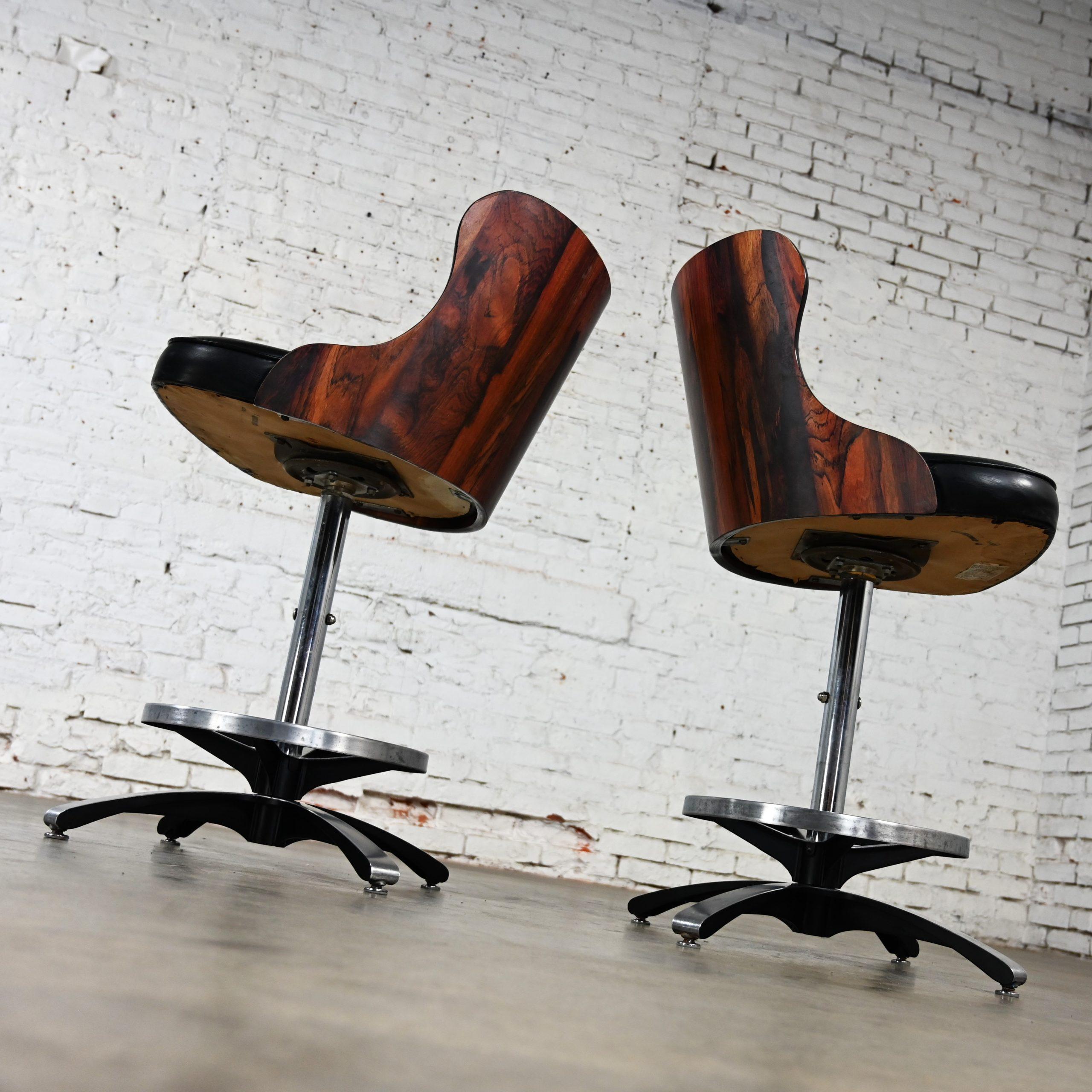 Get ready to double your Daystrom pleasure!!! This is an incredible pair of Daystrom bar or counter height stools comprised of wonderful faux rosewood laminate molded curved backs and they are wearing their original black vinyl or faux leather upholstery. They have lovely chrome shafts and cast aluminum four prong base and ringed footrests. Plus, they’re fully adjustable with a 360-degree swivel on the shaft and they comfortably adjust from bar to counter height!! They may just be the perfect barstool!! Daystrom Furniture was one of the top producing furniture companies of the mid-century making great looking dinette sets, barstools, and bars. Through the years they have become collectable for their awesome space-age styles and innovative materials. This pair of marvelous barstools is no exception. They are going to be fabulous at your kitchen counter, indoor bar, or pub table and they bear a classic, timeless style you are sure to love for years to come!