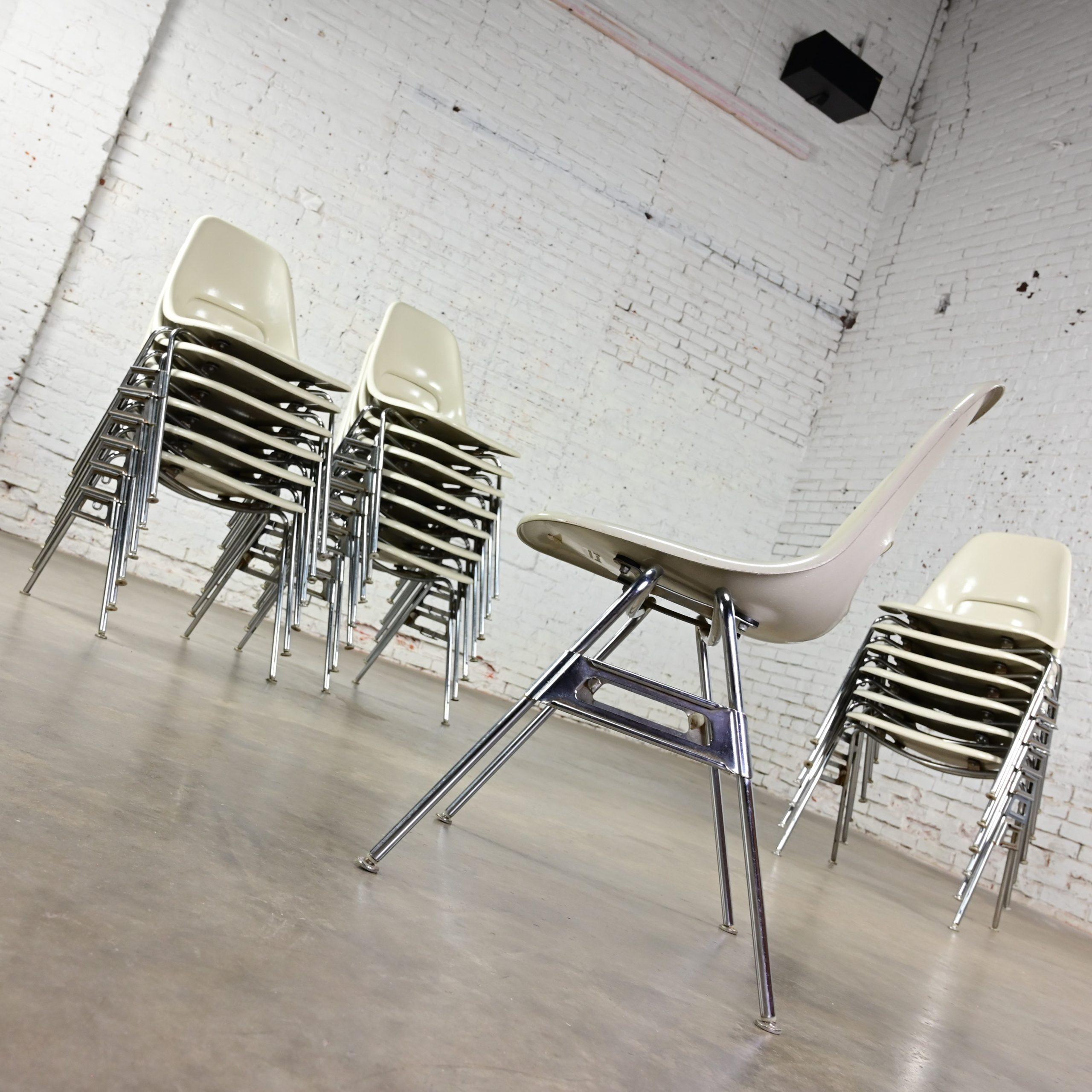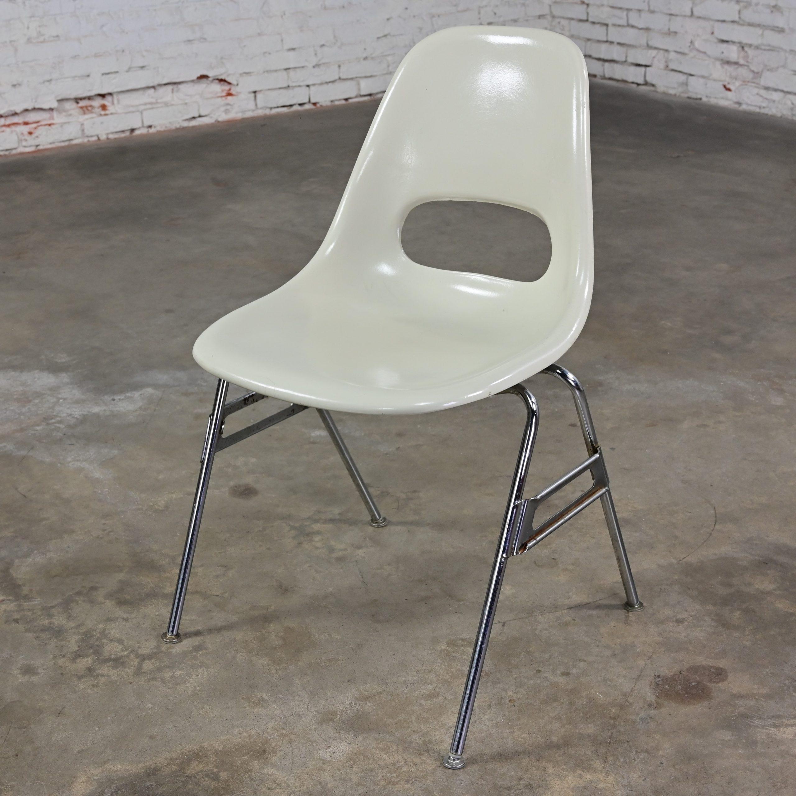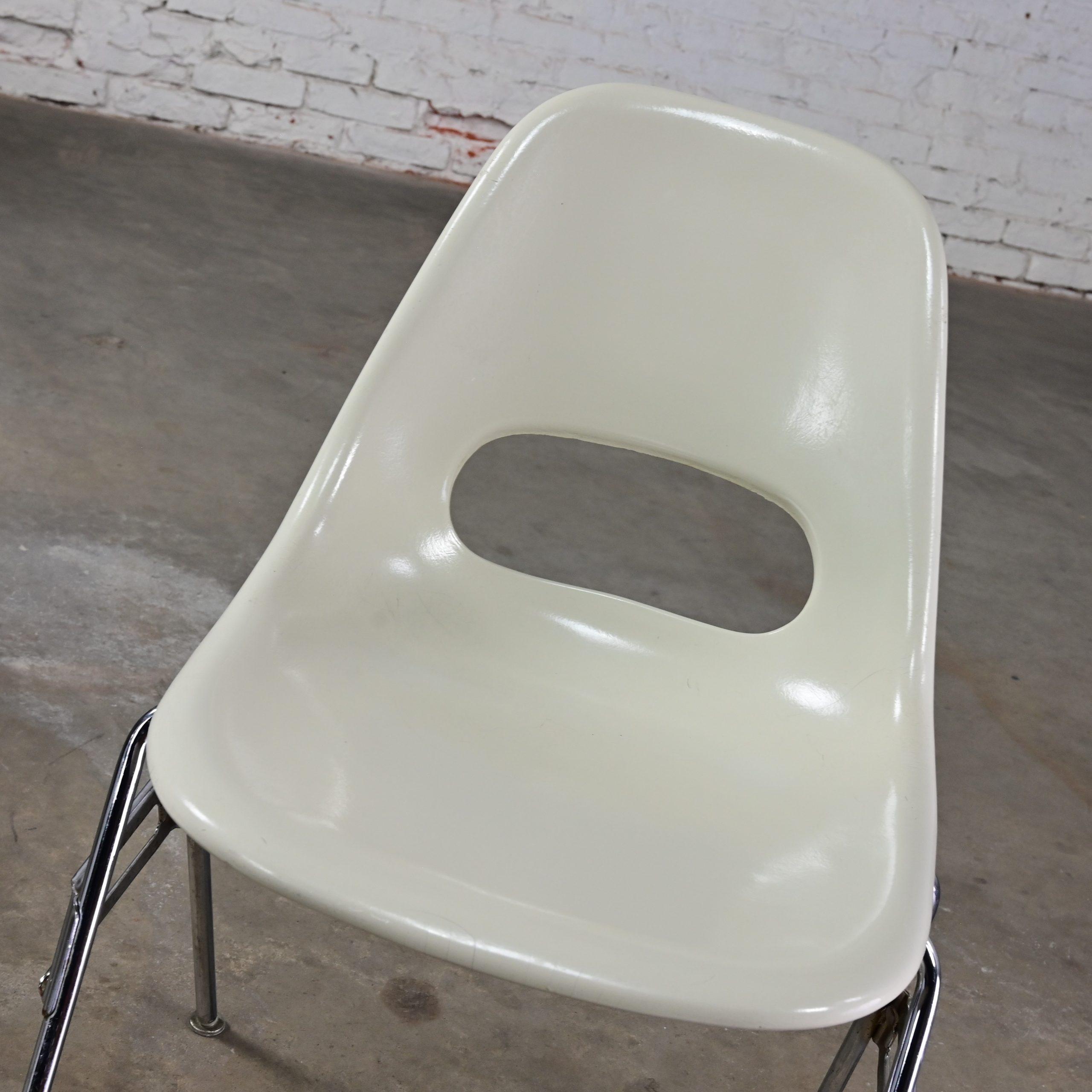 Mid-Century Modern MARVELOUS-NESS!!! These are INCREDIBLE vintage Mid-Century Modern white molded fiberglass shell & chrome base stacking chairs by Krueger International! We have 8 that we are selling separately. They are comprised of white molded fiberglass shells with a keyhole in the back and chrome tube legs with foot glides. They were most likely designed for commercial applications such as schools or offices, but we know they will be wonderful in your home. And they’re obviously attractive but, talk about sturdy! So, you don’t have to sacrifice style for durability! They will be wonderful used as dining chairs, but they would be equally as fabulous around an office or conference table, or at the family game table. Did company show up unexpectedly? No problem! These are a great option for extra seating! And they’re conveniently stackable! When company leaves, stack them neatly away in the storage closet. They would also be wonderful in an office waiting area, school or church function, or an entertaining event. Eight of the chairs have optional connecting hooks on the lower sides of the seat. The female connector is on the left and the male is on the right. You can line them up, side by side and connect for neatness, space saving, and extra stability purposes. How cool is that?! And, if you’re in the market for a fabulous table that is large enough to accommodate a few or all these beauties, we have several listed here for sale that would host them perfectly! Check them out!! So, whether you need 2, 4, 6, 8, you DEFINITELY need them in your home!