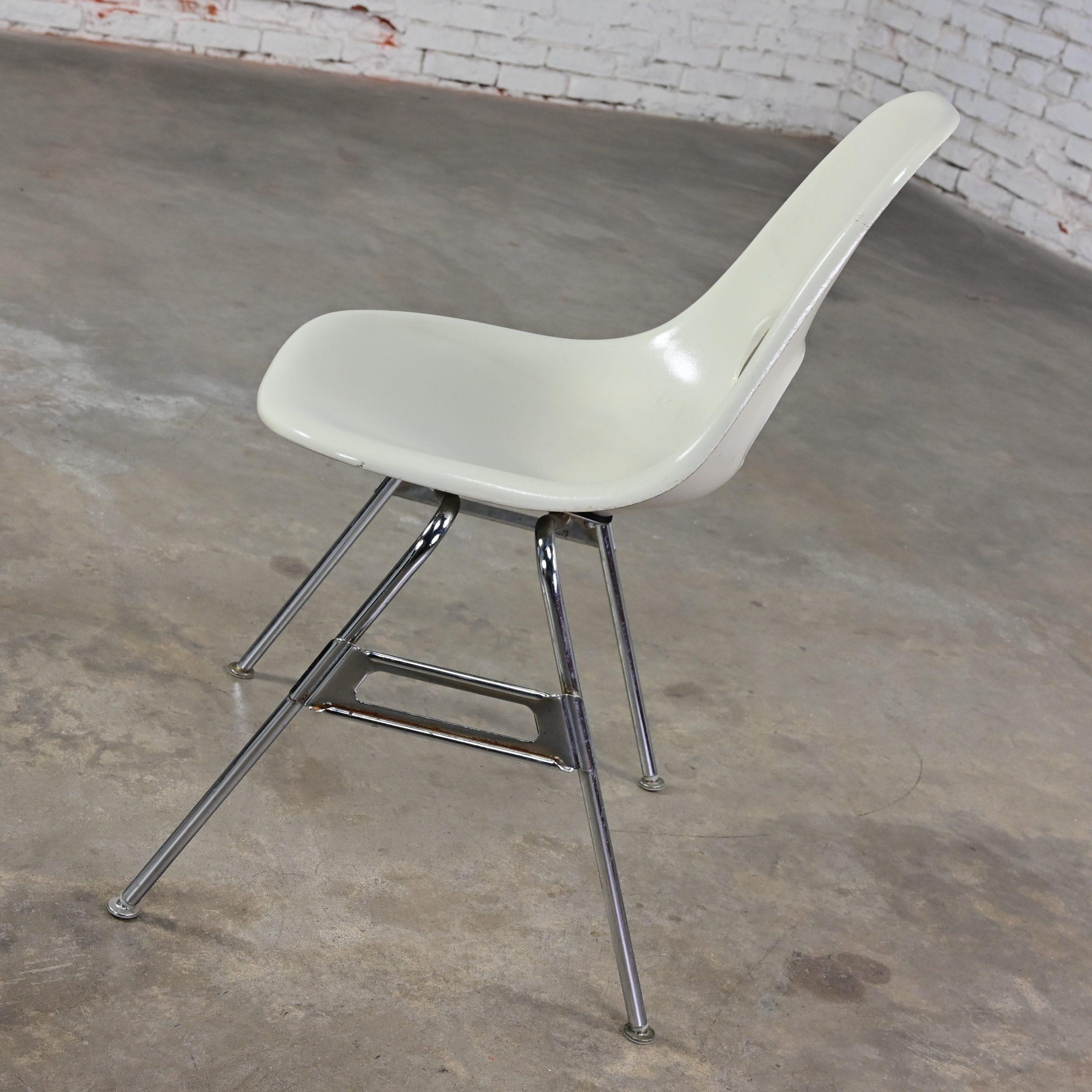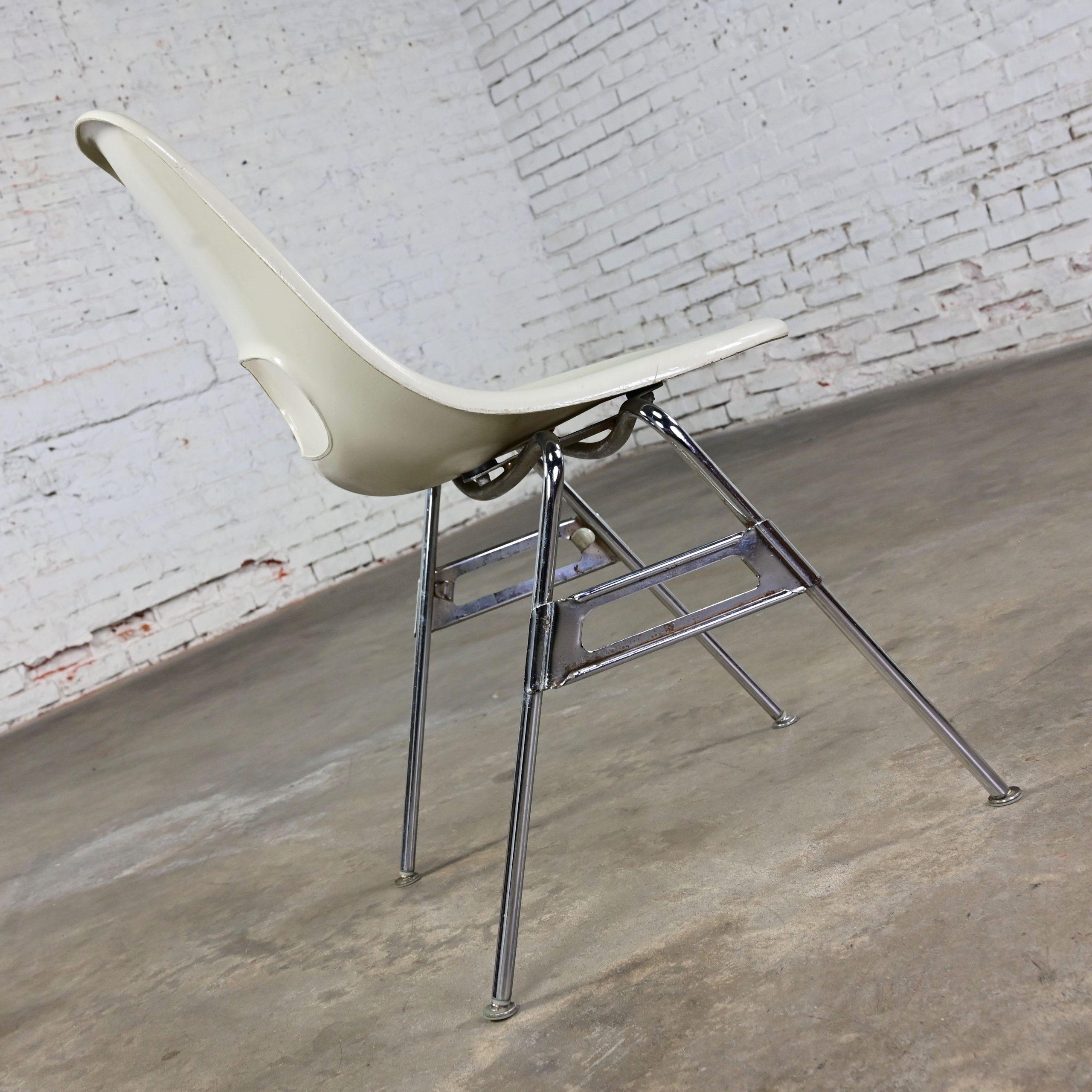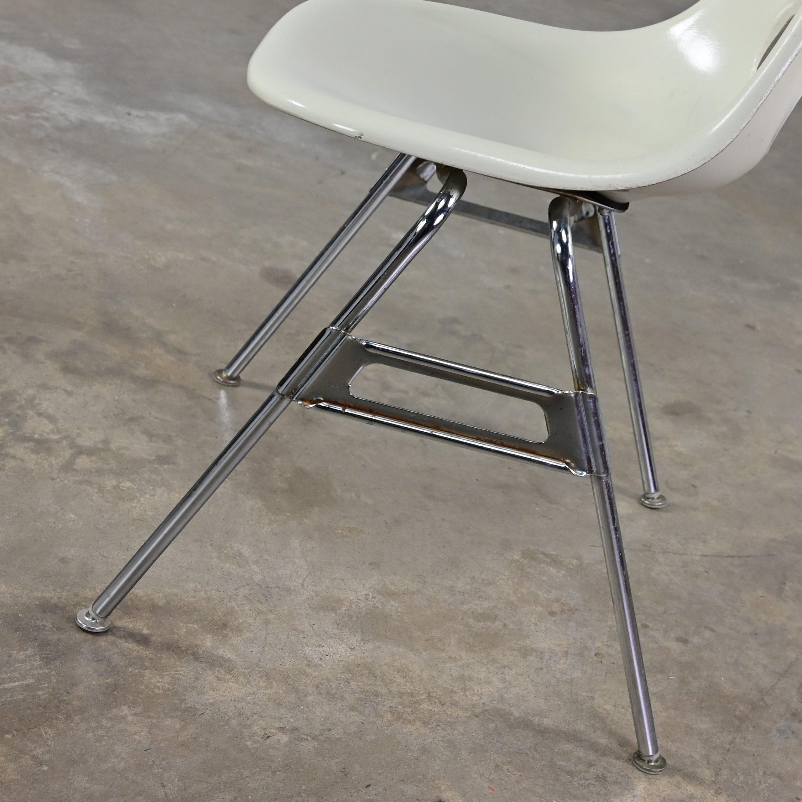 Mid-Century Modern MARVELOUS-NESS!!! These are INCREDIBLE vintage Mid-Century Modern white molded fiberglass shell & chrome base stacking chairs by Krueger International! We have 8 that we are selling separately. They are comprised of white molded fiberglass shells with a keyhole in the back and chrome tube legs with foot glides. They were most likely designed for commercial applications such as schools or offices, but we know they will be wonderful in your home. And they’re obviously attractive but, talk about sturdy! So, you don’t have to sacrifice style for durability! They will be wonderful used as dining chairs, but they would be equally as fabulous around an office or conference table, or at the family game table. Did company show up unexpectedly? No problem! These are a great option for extra seating! And they’re conveniently stackable! When company leaves, stack them neatly away in the storage closet. They would also be wonderful in an office waiting area, school or church function, or an entertaining event. Eight of the chairs have optional connecting hooks on the lower sides of the seat. The female connector is on the left and the male is on the right. You can line them up, side by side and connect for neatness, space saving, and extra stability purposes. How cool is that?! And, if you’re in the market for a fabulous table that is large enough to accommodate a few or all these beauties, we have several listed here for sale that would host them perfectly! Check them out!! So, whether you need 2, 4, 6, 8, you DEFINITELY need them in your home!