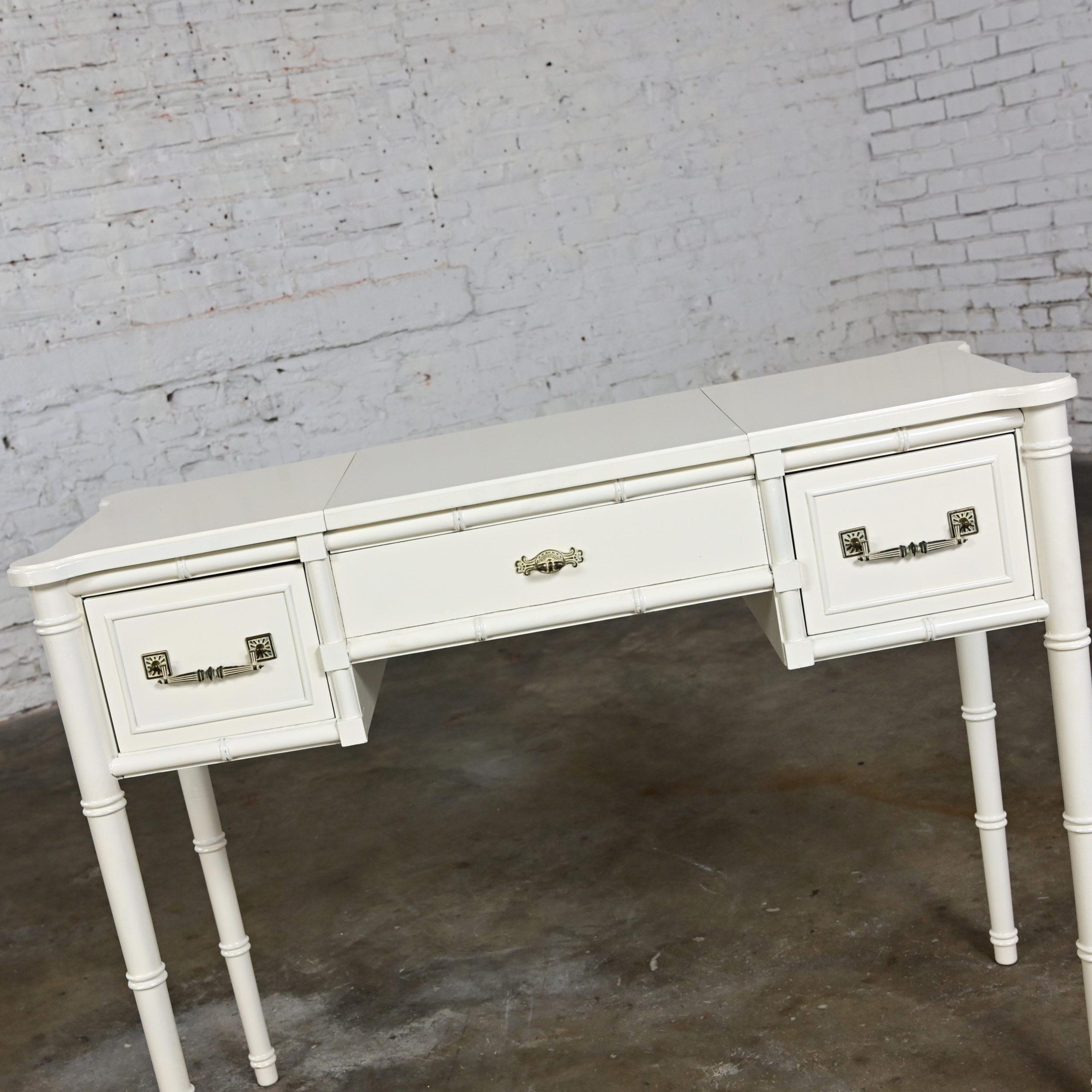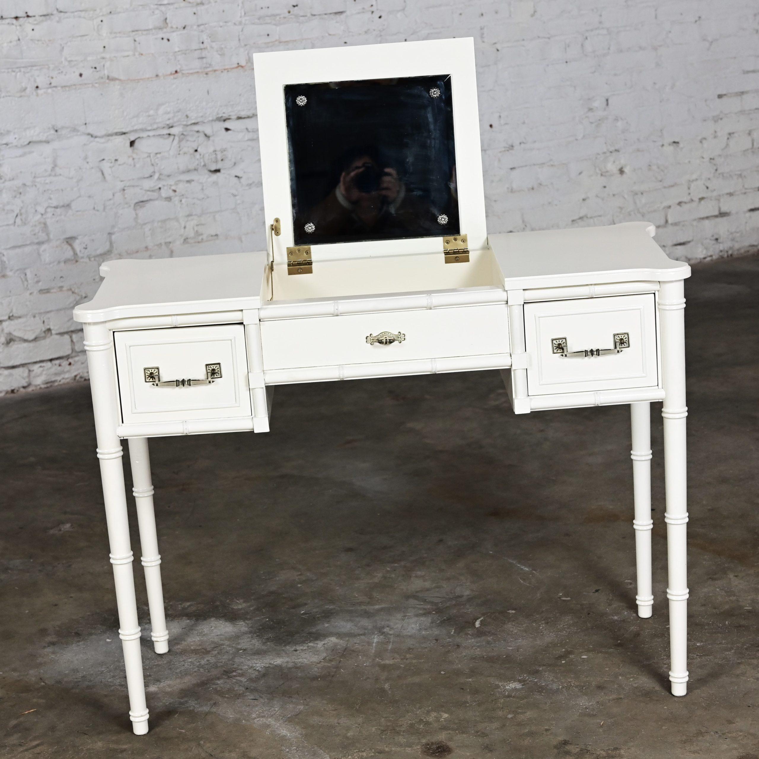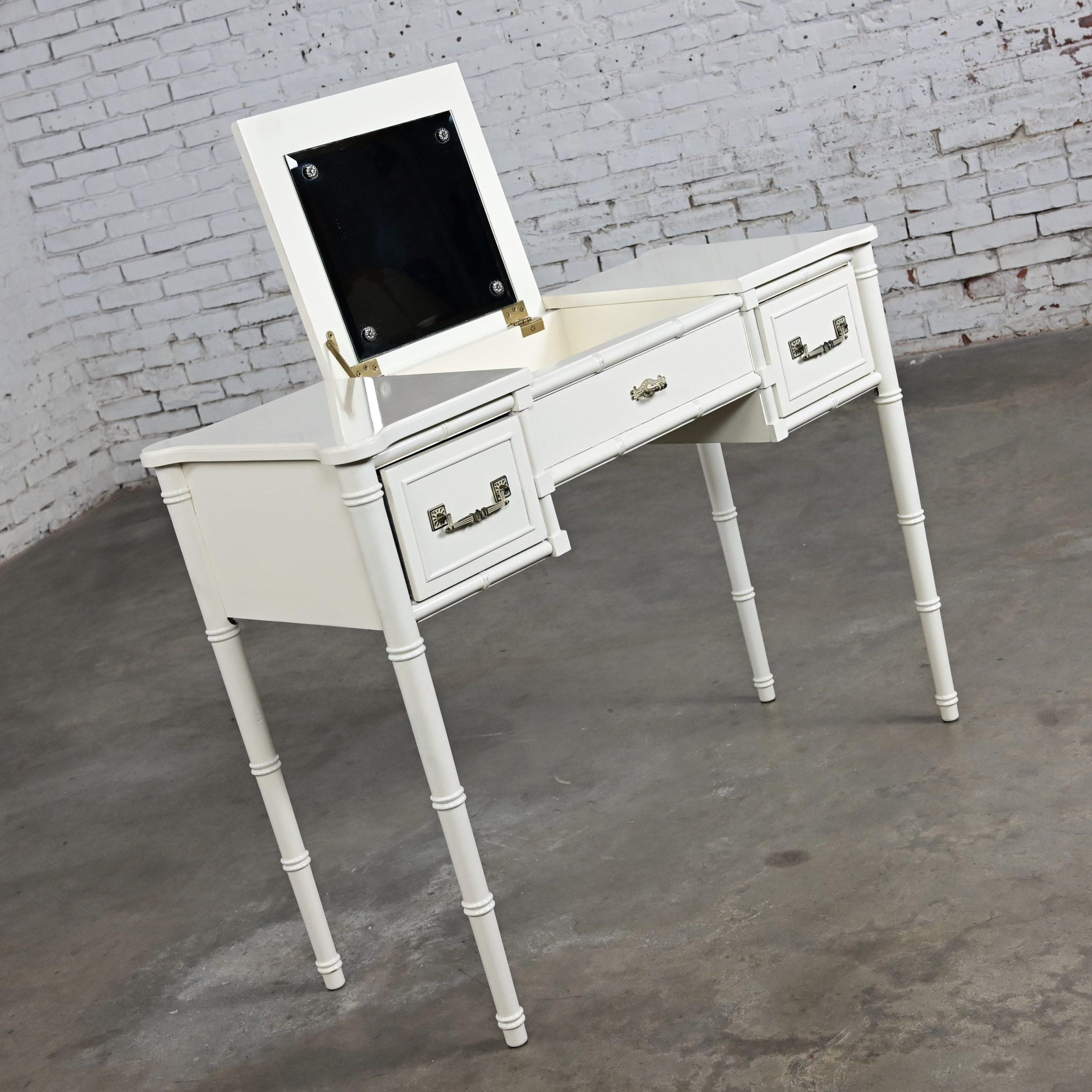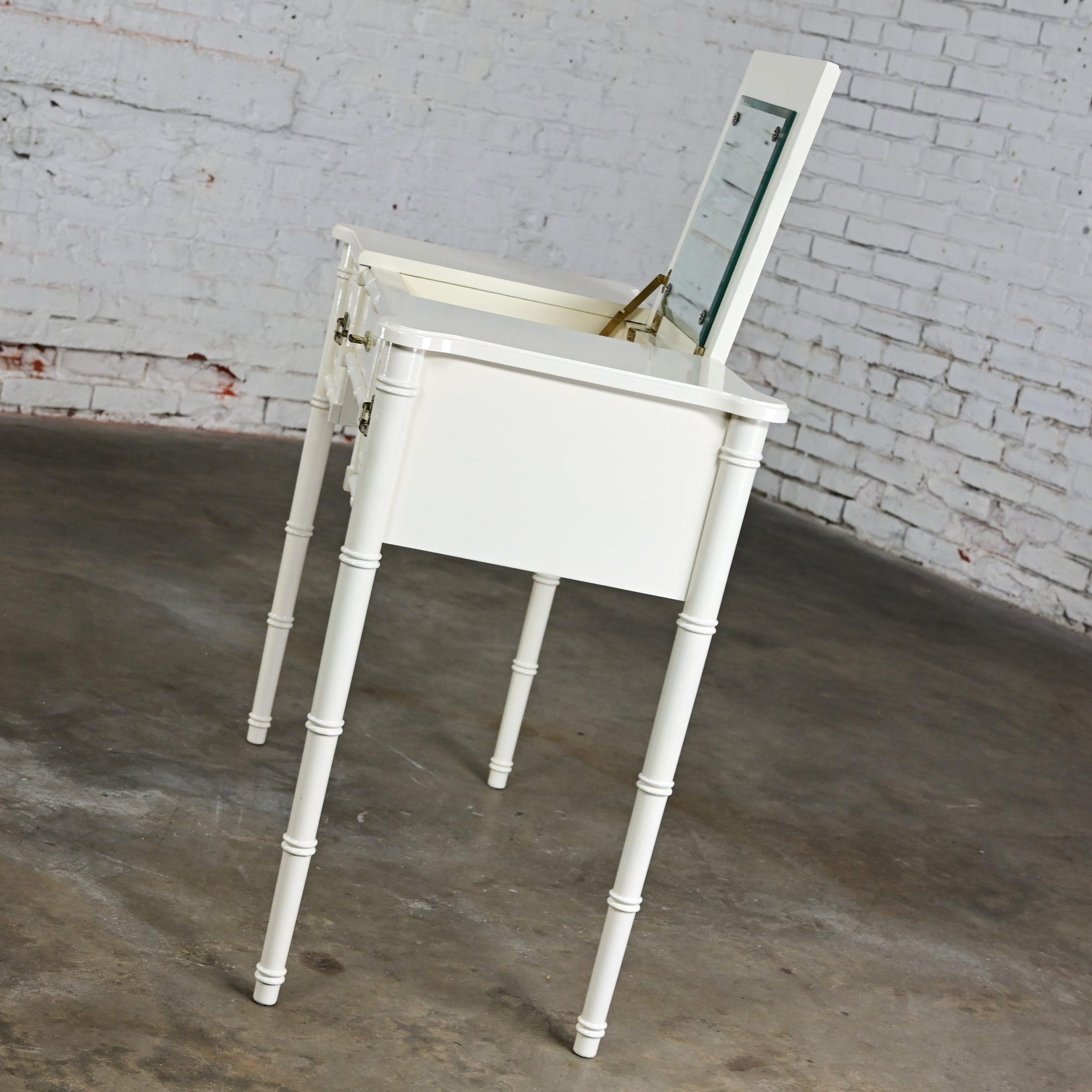 HEY… GOOD LOOKIN……. We’ve DEFINITELY got somethin’ cookin’ for you!!!! This gorgeous off-white painted Bali Hai make up vanity by Henry Link is EXACTLY what the designer ordered! It is comprised of a fantastic off-white painted faux bamboo frame featuring faux bamboo legs, two spacious side drawers with the original bronze toned/whitewashed Bali Hai hardware, and a lift top center revealing its original square beveled mirror and an ample roomy storage area to hold all of your make-up and hair supplies. After your cosmetic artistry is complete, simply shut the top to hide the clutter or use it as a desk or small table. It is finished on all four sides so it can float beautifully anywhere in her room. The top has rounded corners and edging with an off-white gloss painted surface and the frame is solid and sturdy with high-quality construction. This is the ideal little make-up vanity for your master bedroom or, if you are lucky enough to have one, your dressing room. Bearing it’s marvelous Hollywood Regency and Campaign style flairs, no matter your style this beautiful piece of American furniture design will fit right in.