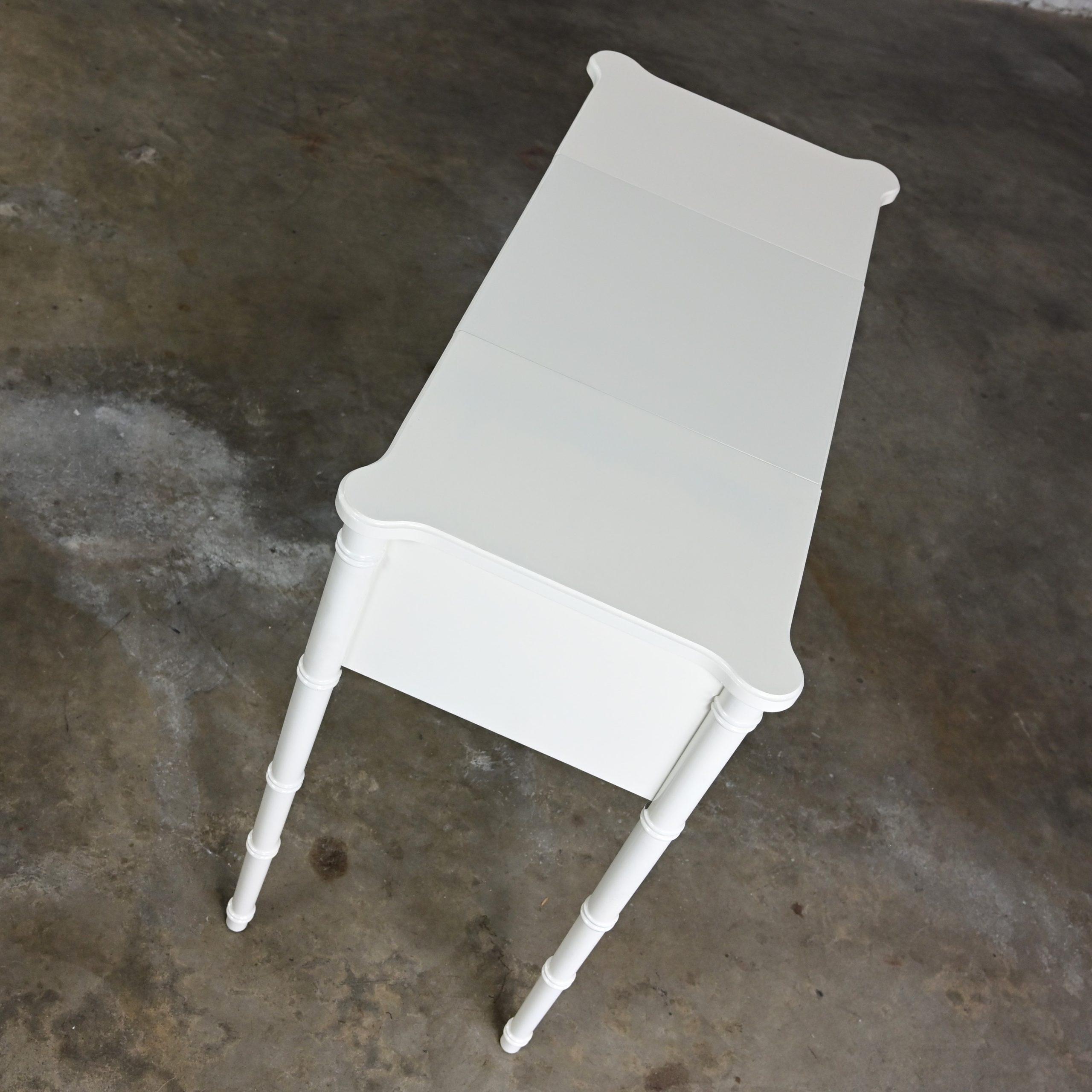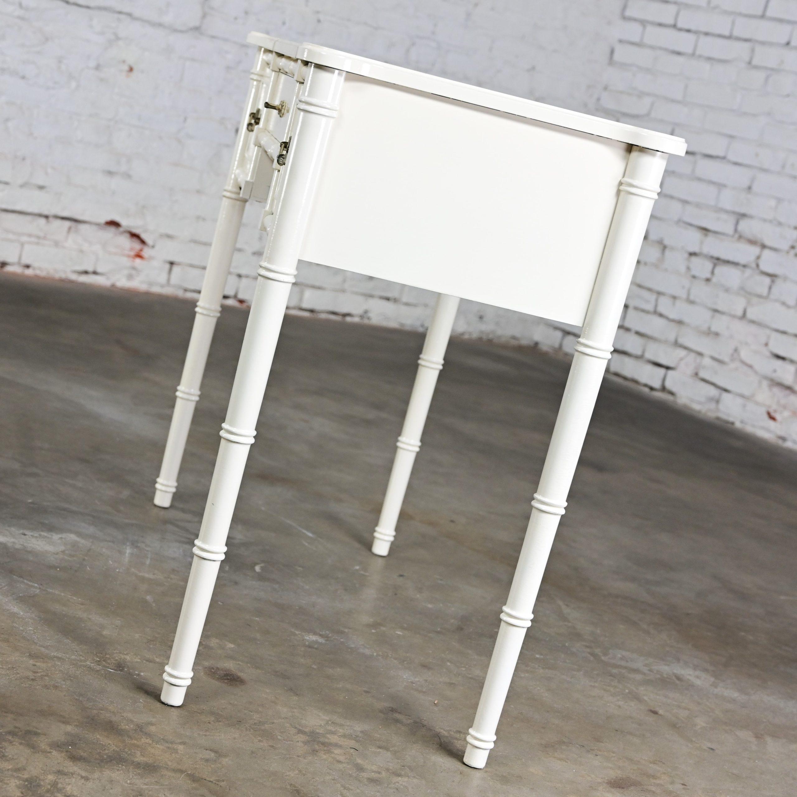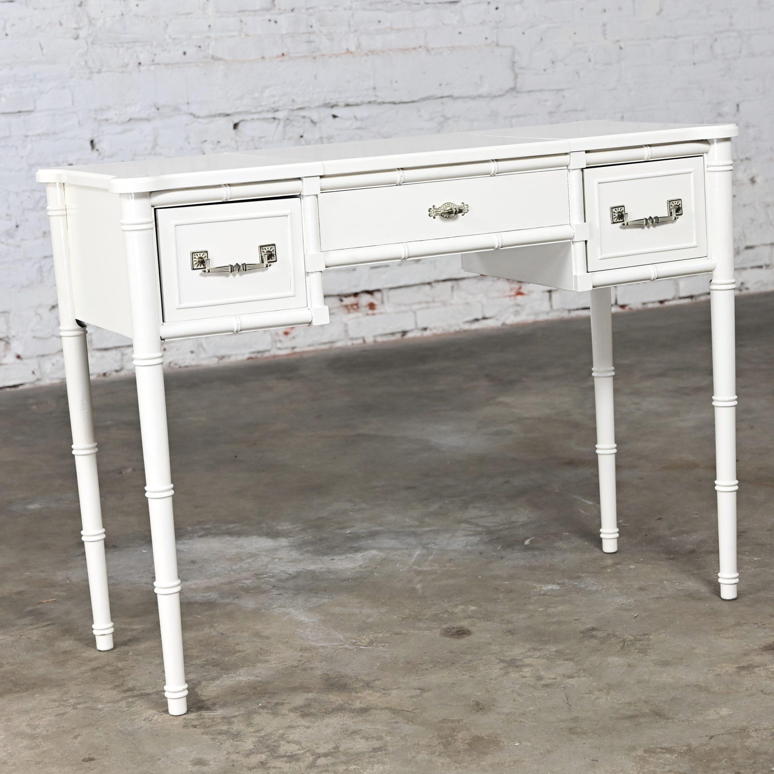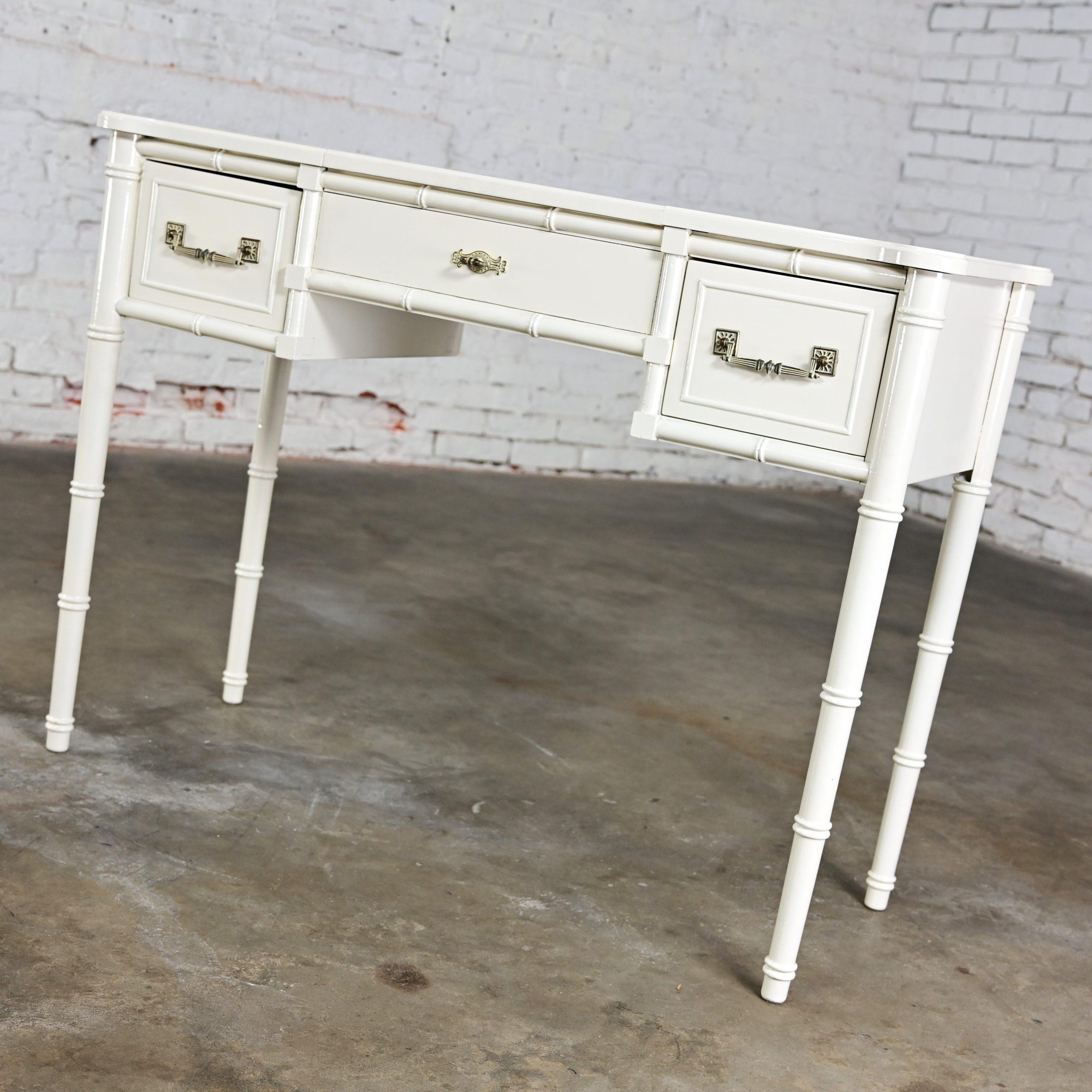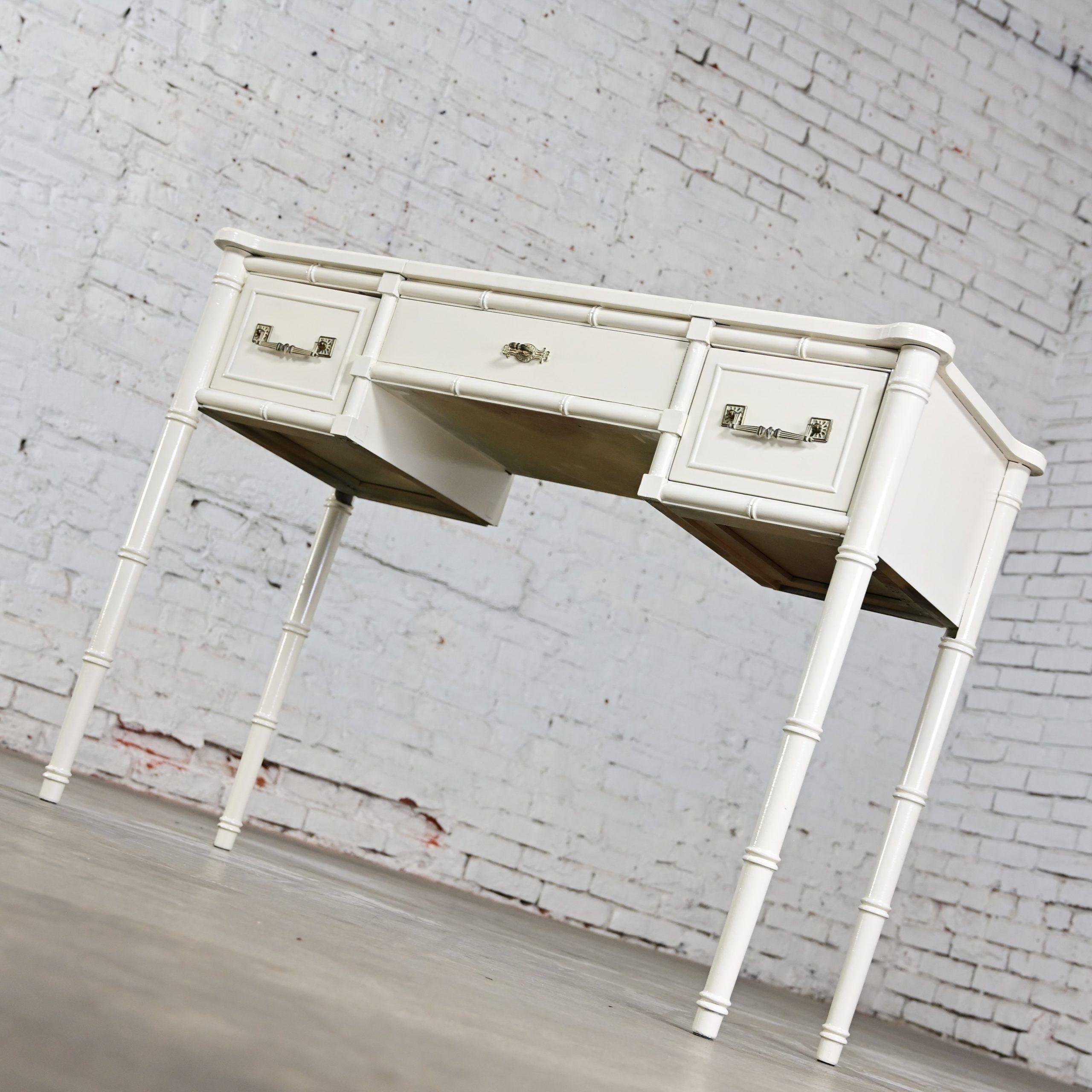 HEY… GOOD LOOKIN……. We’ve DEFINITELY got somethin’ cookin’ for you!!!! This gorgeous off-white painted Bali Hai make up vanity by Henry Link is EXACTLY what the designer ordered! It is comprised of a fantastic off-white painted faux bamboo frame featuring faux bamboo legs, two spacious side drawers with the original bronze toned/whitewashed Bali Hai hardware, and a lift top center revealing its original square beveled mirror and an ample roomy storage area to hold all of your make-up and hair supplies. After your cosmetic artistry is complete, simply shut the top to hide the clutter or use it as a desk or small table. It is finished on all four sides so it can float beautifully anywhere in her room. The top has rounded corners and edging with an off-white gloss painted surface and the frame is solid and sturdy with high-quality construction. This is the ideal little make-up vanity for your master bedroom or, if you are lucky enough to have one, your dressing room. Bearing it’s marvelous Hollywood Regency and Campaign style flairs, no matter your style this beautiful piece of American furniture design will fit right in.