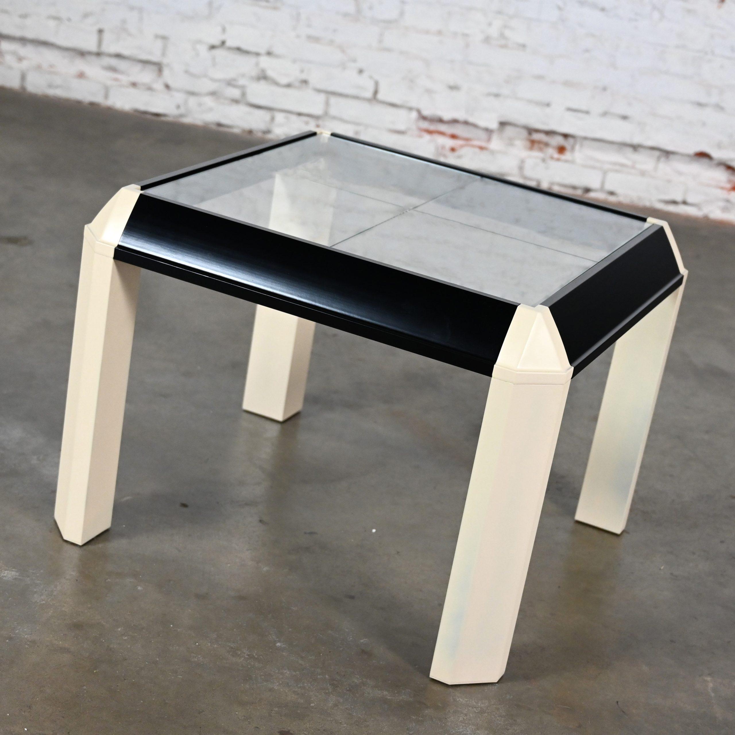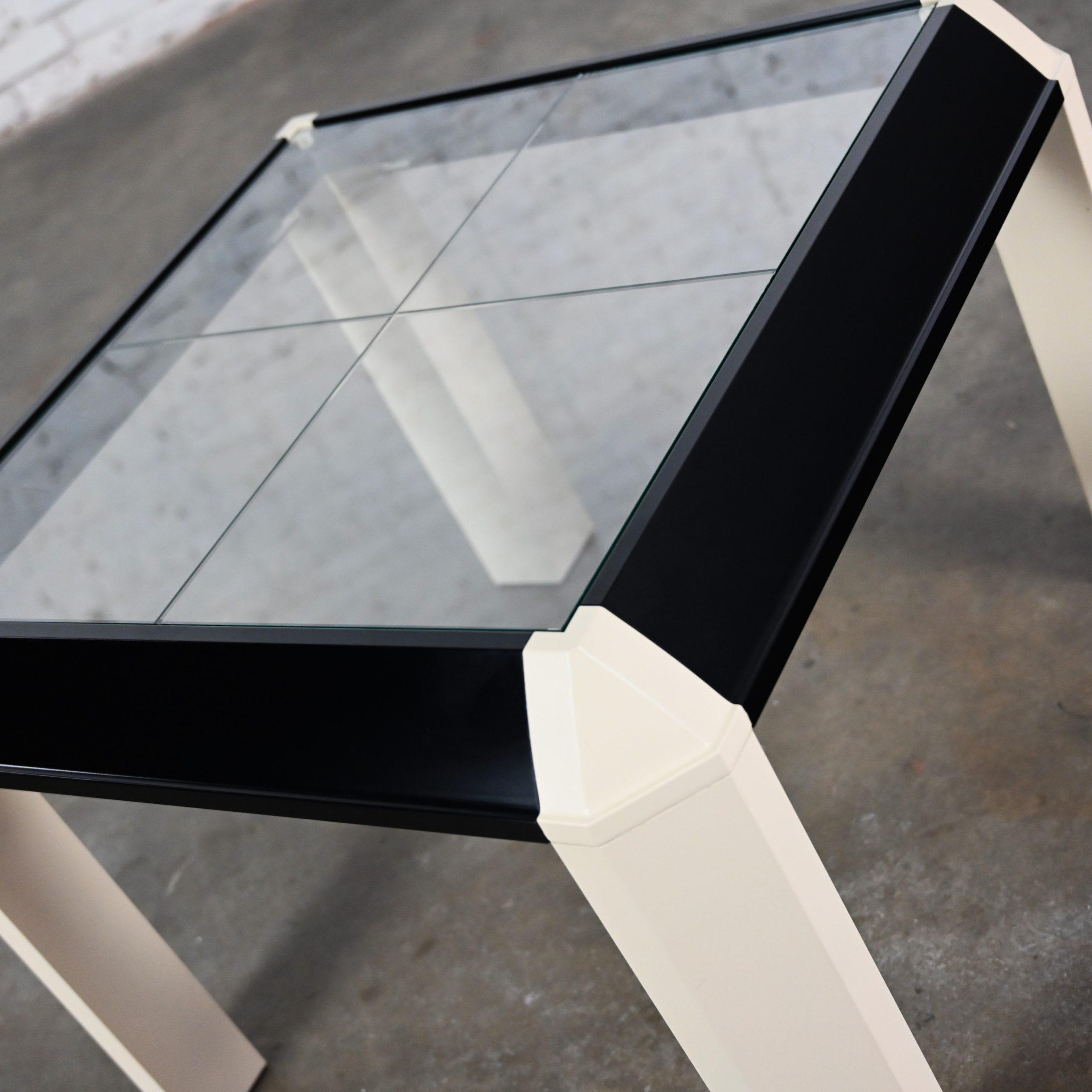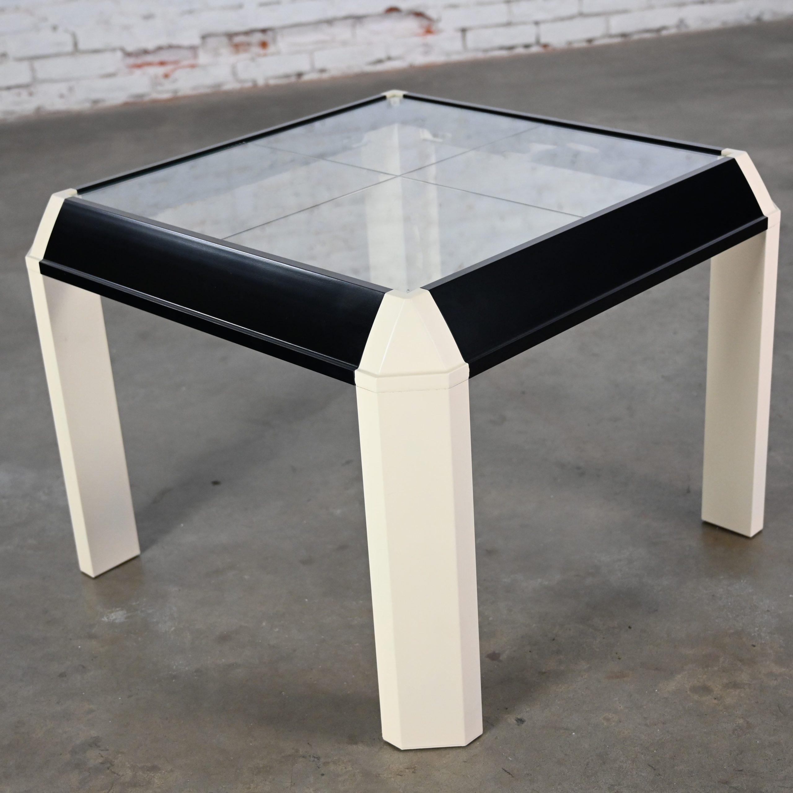 “She’s got LEGGGSSSS….” – yes she does ZZ Top… yes she does!! This is a FABULOUS vintage end table with unique off white painted trapezoid shaped legs, off white painted corners, black painted rails, and a lovely recessed rectangular glass top. The original chrome was just too rough to refinish so it has been restyled by giving it a fresh coat of beautiful off white & black paint and it looks INCREDIBLE! It is ready to grace your home with its classic, timeless, an oh-so-head-turning appearance. Can’t you just imagine it in your living room next to a lounge chair or in the family room next to a fabulous chaise lounge or between a pair of chairs? We certainly can! It has a magnificent Modern to Postmodern style, but it would be absolutely wonderful in a Minimalist, Industrial, or Hollywood Regency setting. The black and (off) white of it is… this vintage end table is nothing short of MARVELOUS! And I bet you can’t get those legs out of your mind!! How could you? The whole table is pretty unforgettable!! It’s simple, it’s stunning, and it needs to be YOURS!!!