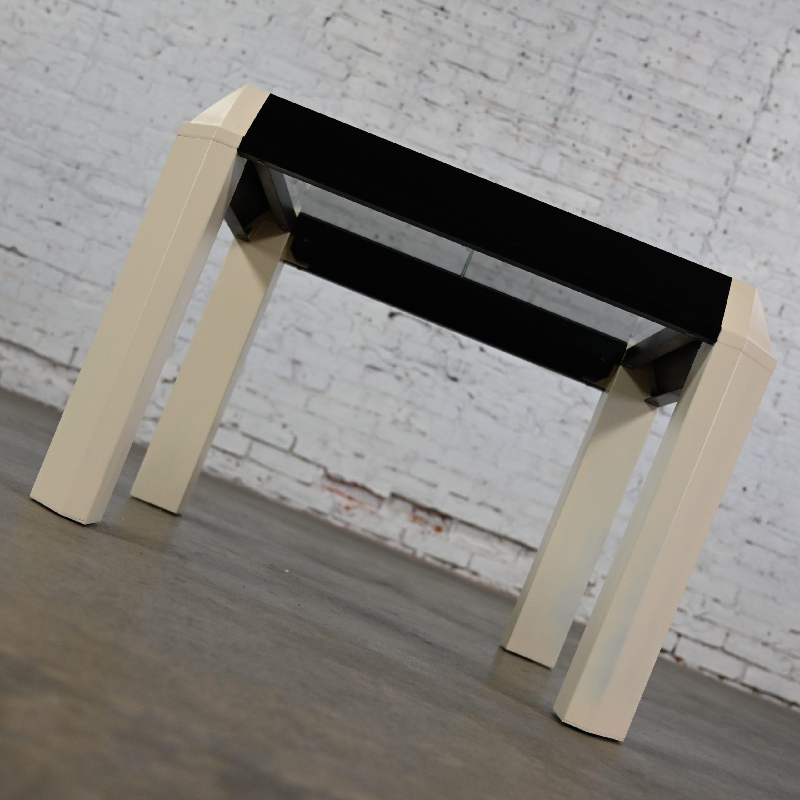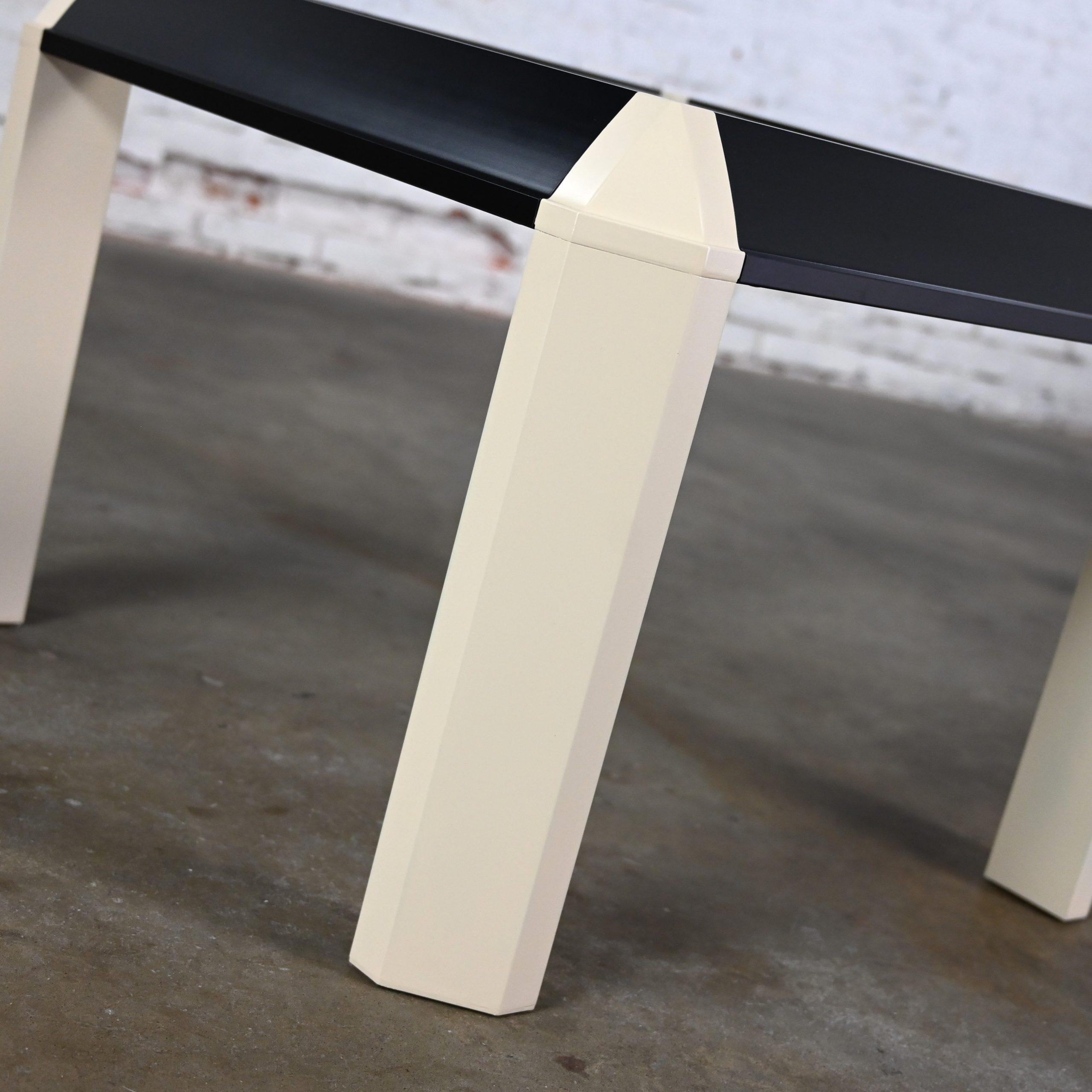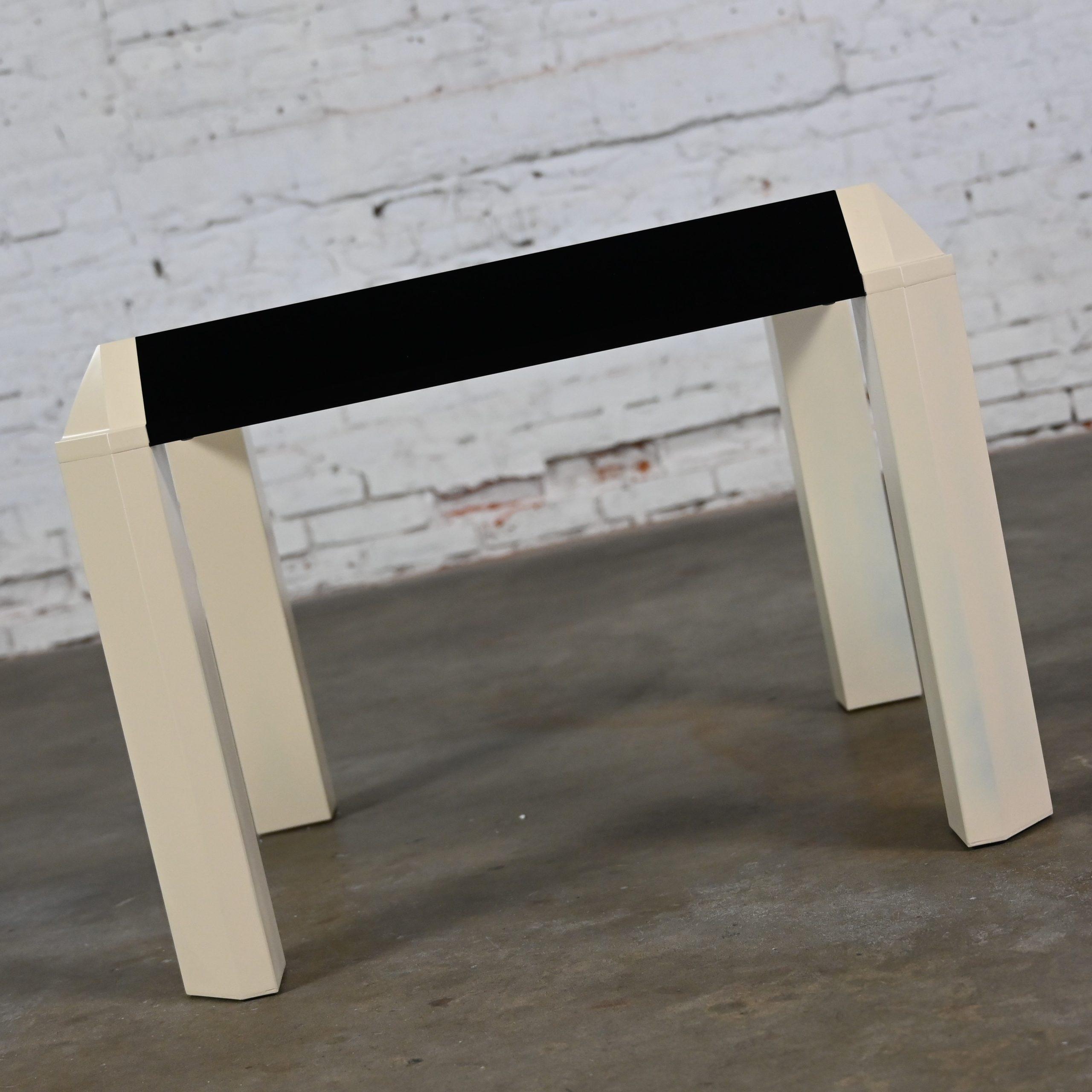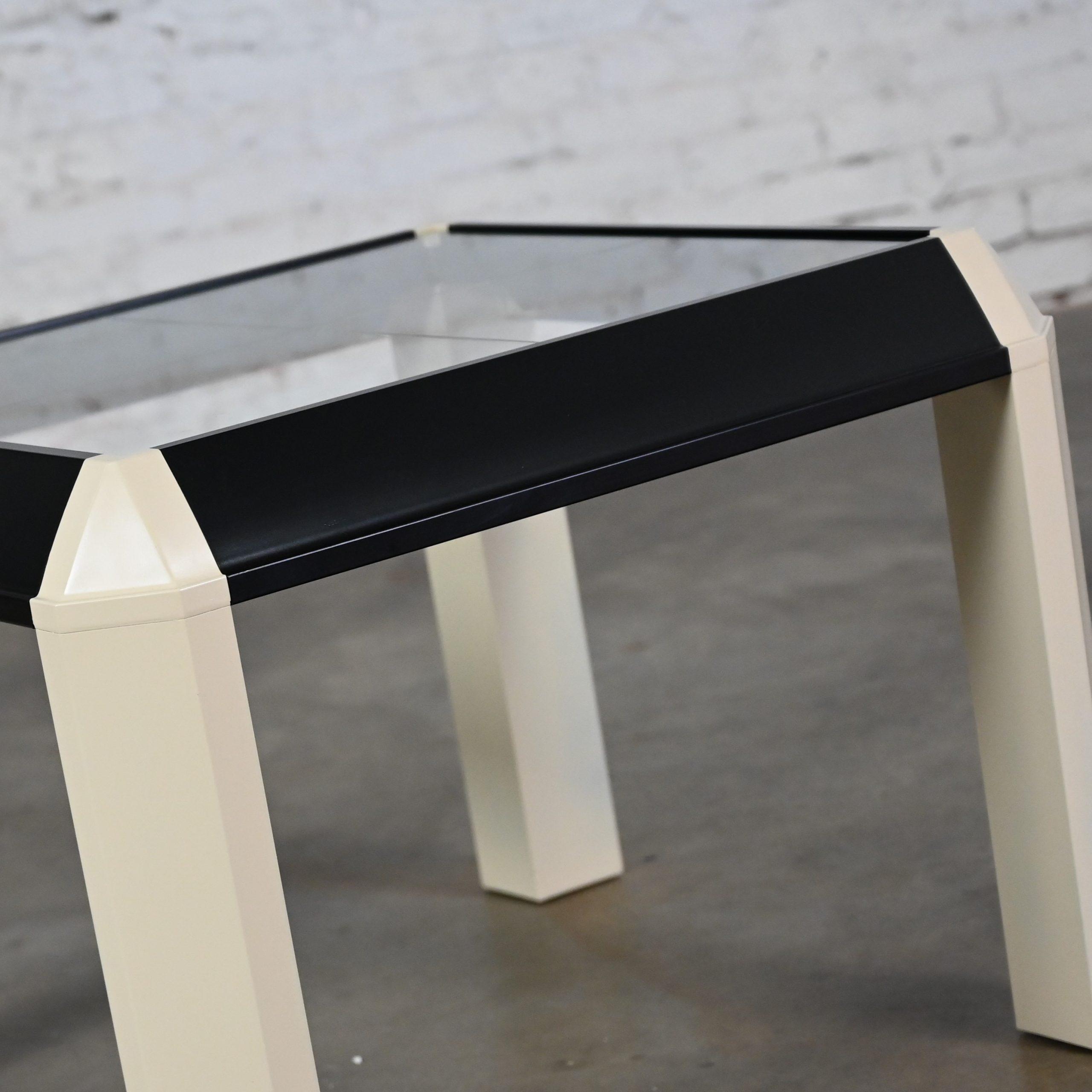 “She’s got LEGGGSSSS….” – yes she does ZZ Top… yes she does!! This is a FABULOUS vintage end table with unique off white painted trapezoid shaped legs, off white painted corners, black painted rails, and a lovely recessed rectangular glass top. The original chrome was just too rough to refinish so it has been restyled by giving it a fresh coat of beautiful off white & black paint and it looks INCREDIBLE! It is ready to grace your home with its classic, timeless, an oh-so-head-turning appearance. Can’t you just imagine it in your living room next to a lounge chair or in the family room next to a fabulous chaise lounge or between a pair of chairs? We certainly can! It has a magnificent Modern to Postmodern style, but it would be absolutely wonderful in a Minimalist, Industrial, or Hollywood Regency setting. The black and (off) white of it is… this vintage end table is nothing short of MARVELOUS! And I bet you can’t get those legs out of your mind!! How could you? The whole table is pretty unforgettable!! It’s simple, it’s stunning, and it needs to be YOURS!!!