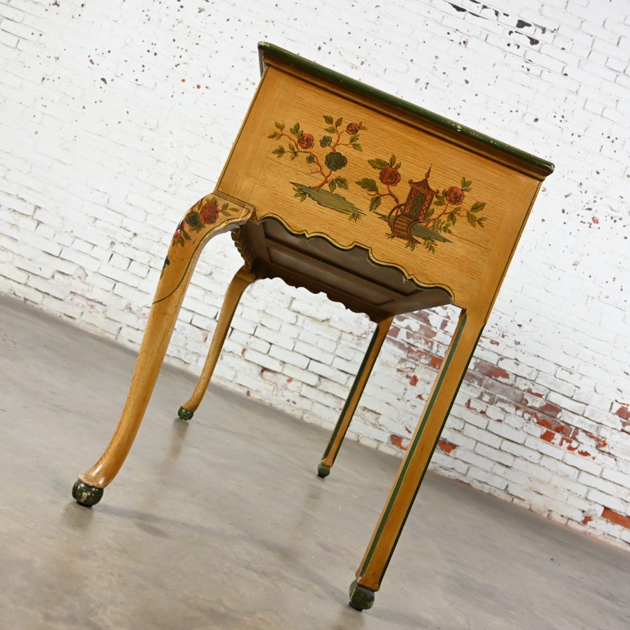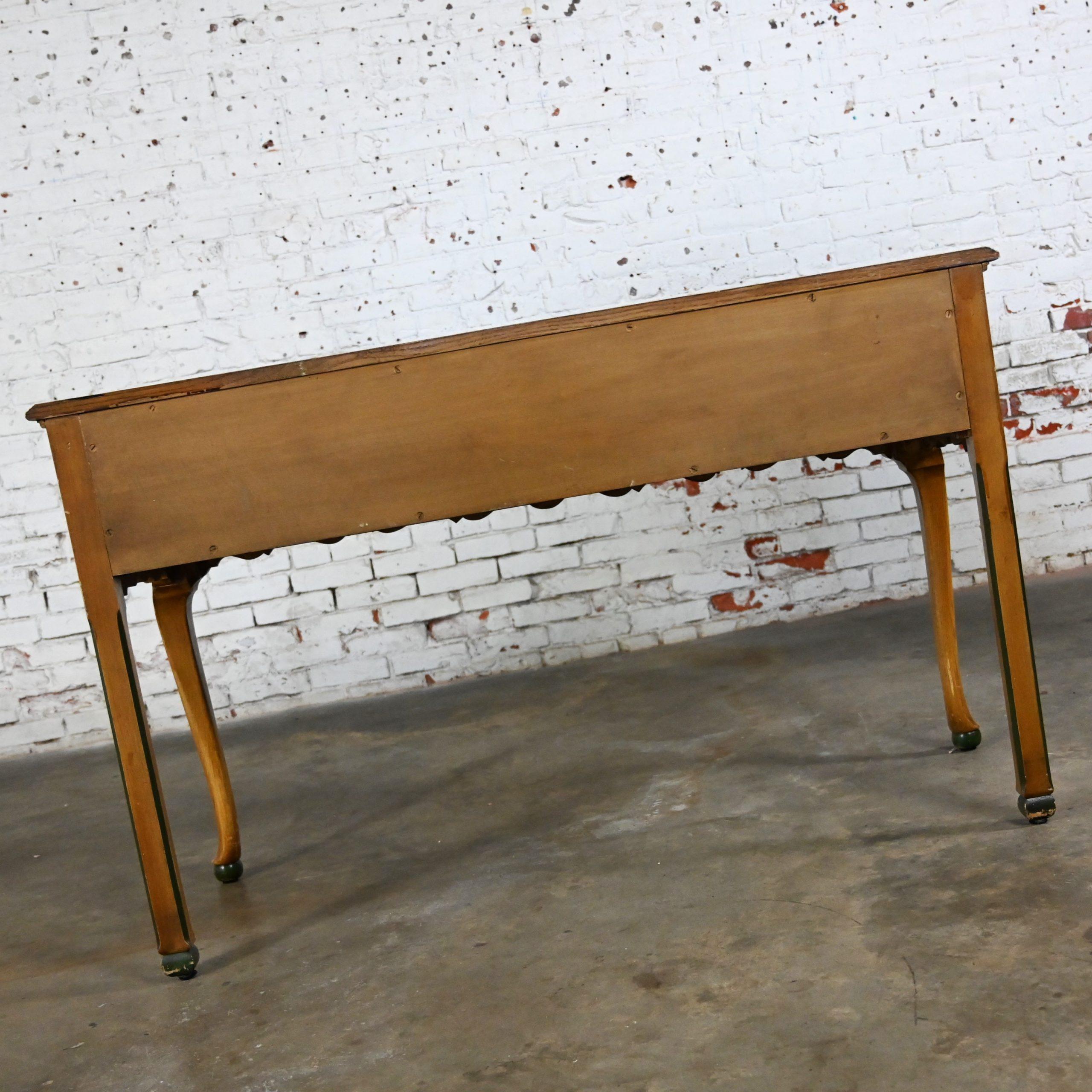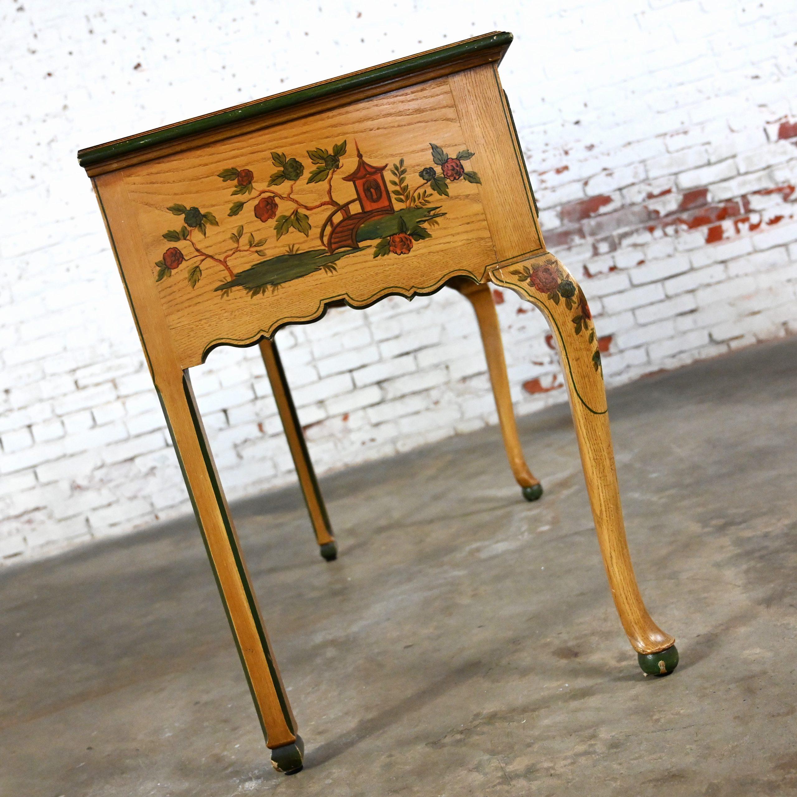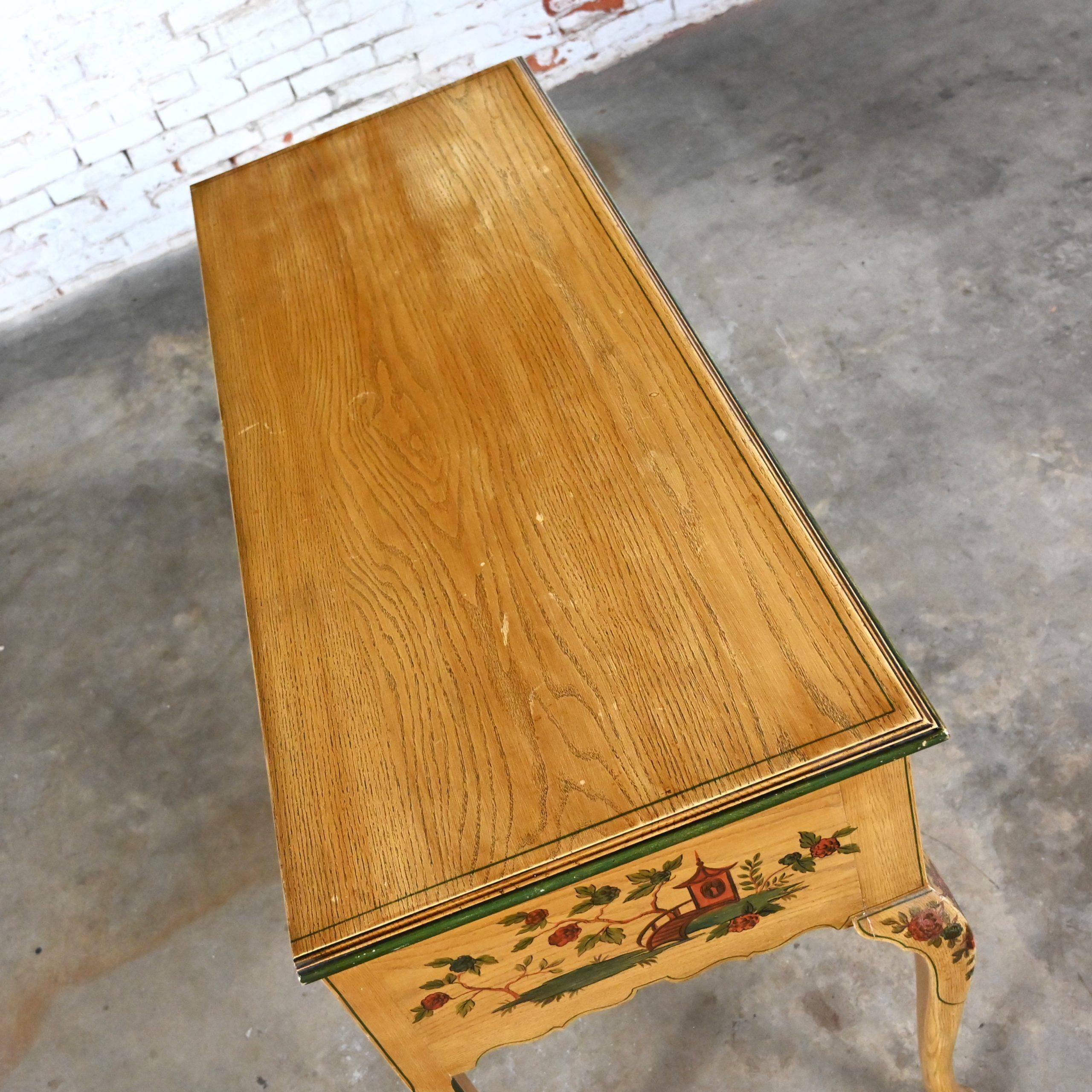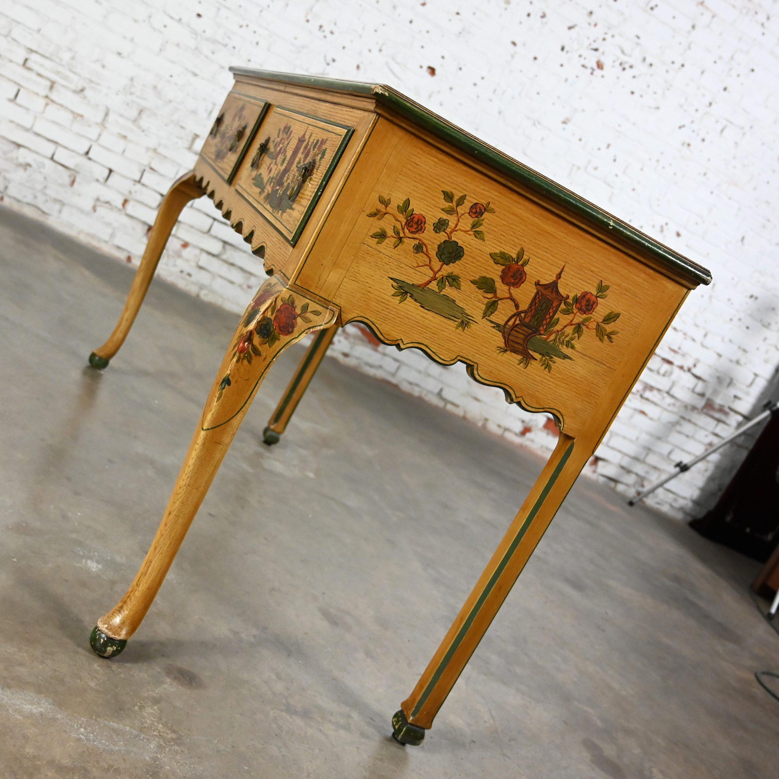 As they say… Some things just get better with age. We would definitely agree considering this beauty is over 100 years of age!!! This is an INCREDIBLE Hunt style antique cabinet which could be utilized as a buffet, sideboard, or server comprised of an oak frame with a fabulous, scalloped bottom edge and it is embellished with lovely, delicate hand painted Asian scenes and trim. It has two dovetail drawers featuring beautiful antique brass drop pulls and fantastic cabriole legs with ball feet. It has not been touched up in any way so there are some color differences in the painted details and an all-over fabulous, aged patina but we feel that any imperfections only serve to enhance its beautiful appearance. Just look at the fabulous detail. This cabinet would be stunning in a dining room or breakfast room as a buffet or server; but it would do equally as well in an entry hall, living room and maybe even in a bedroom. Or I can see it converted into a unique bathroom vanity. It has an Early American flair with a Chinoiserie style, and it is ready to grace your home with its Antique magnificence. Incredibly made, gorgeous appearance, and overwhelming versatility. This beautiful cabinet has it ALL. What are you waiting for? You simply MUST make it YOURS!!!!