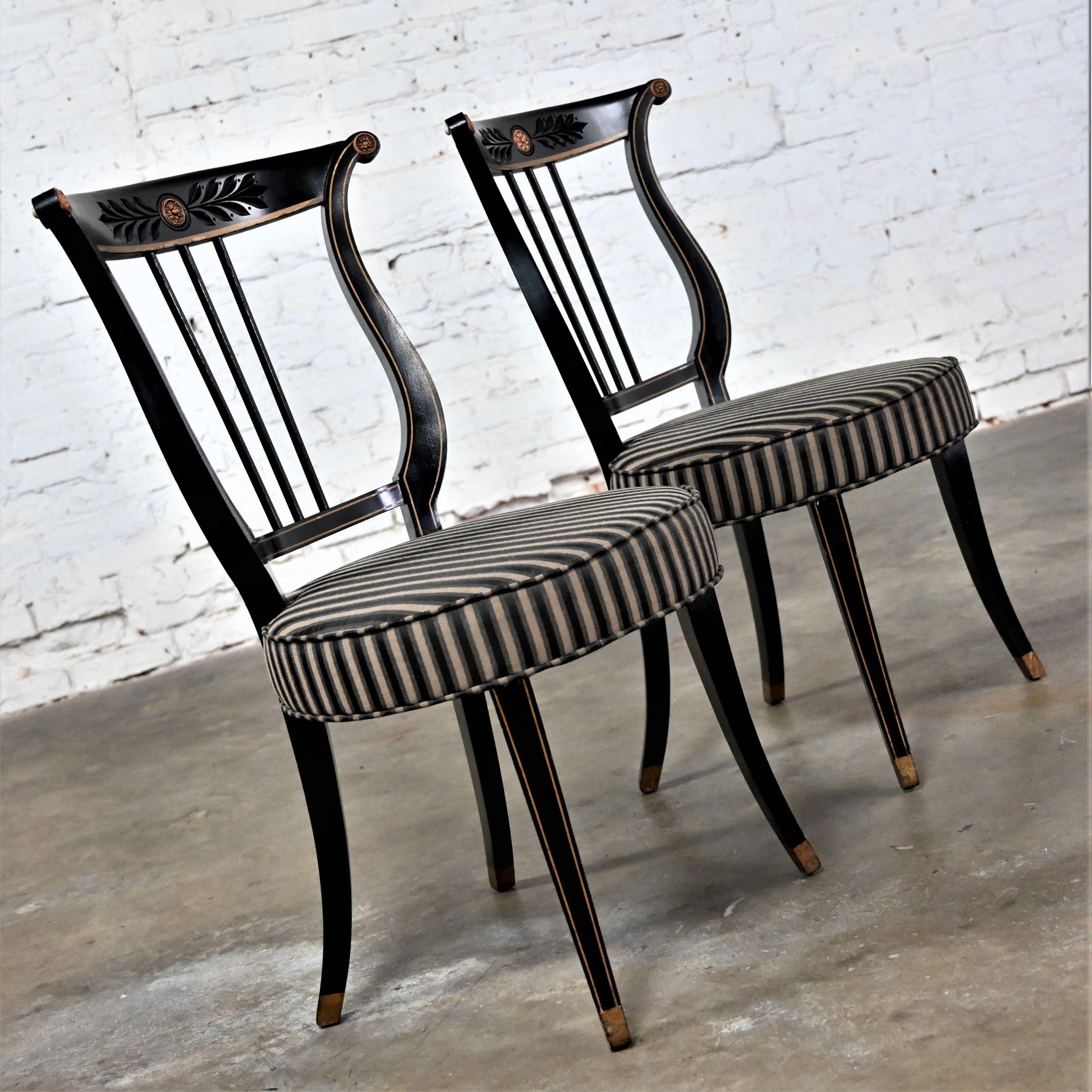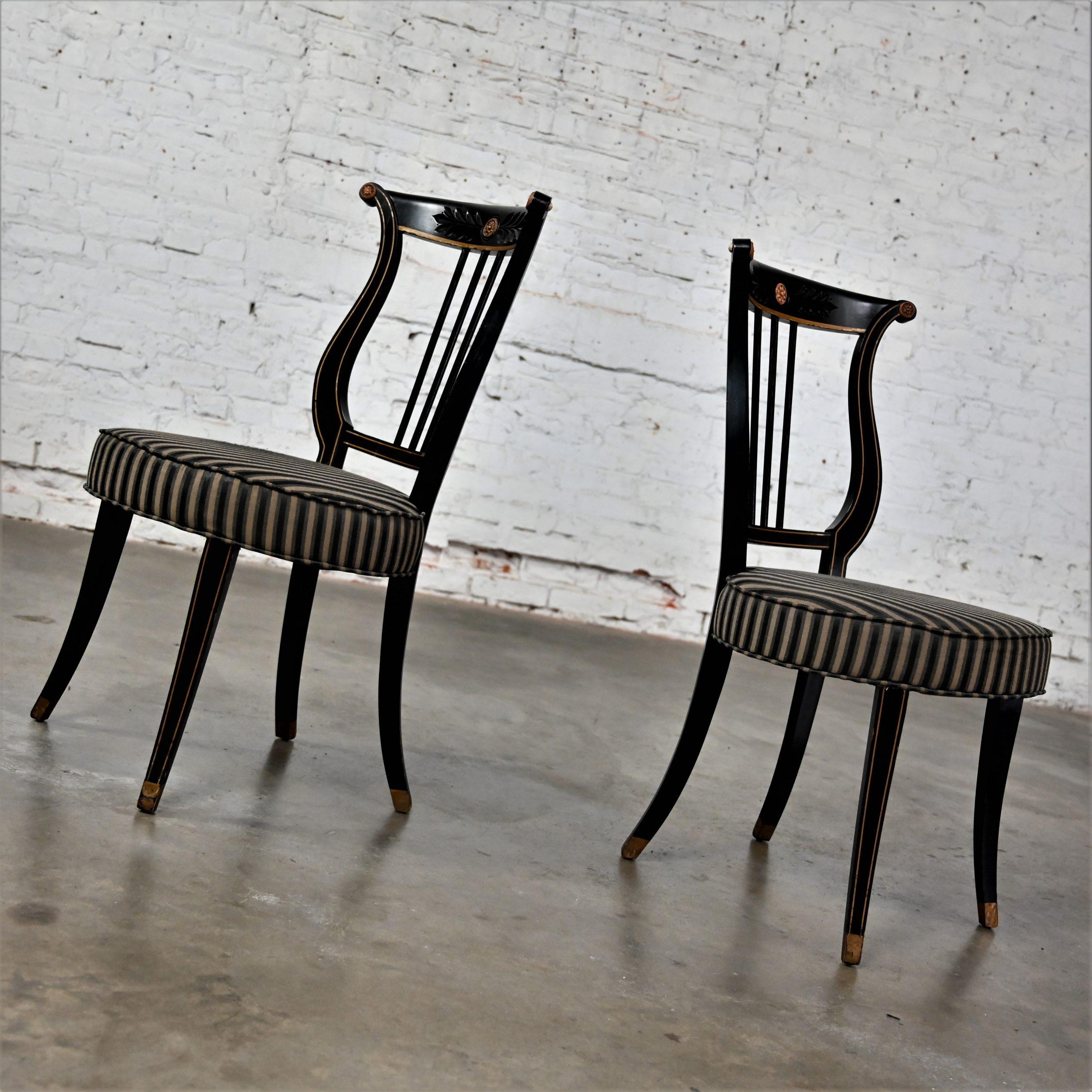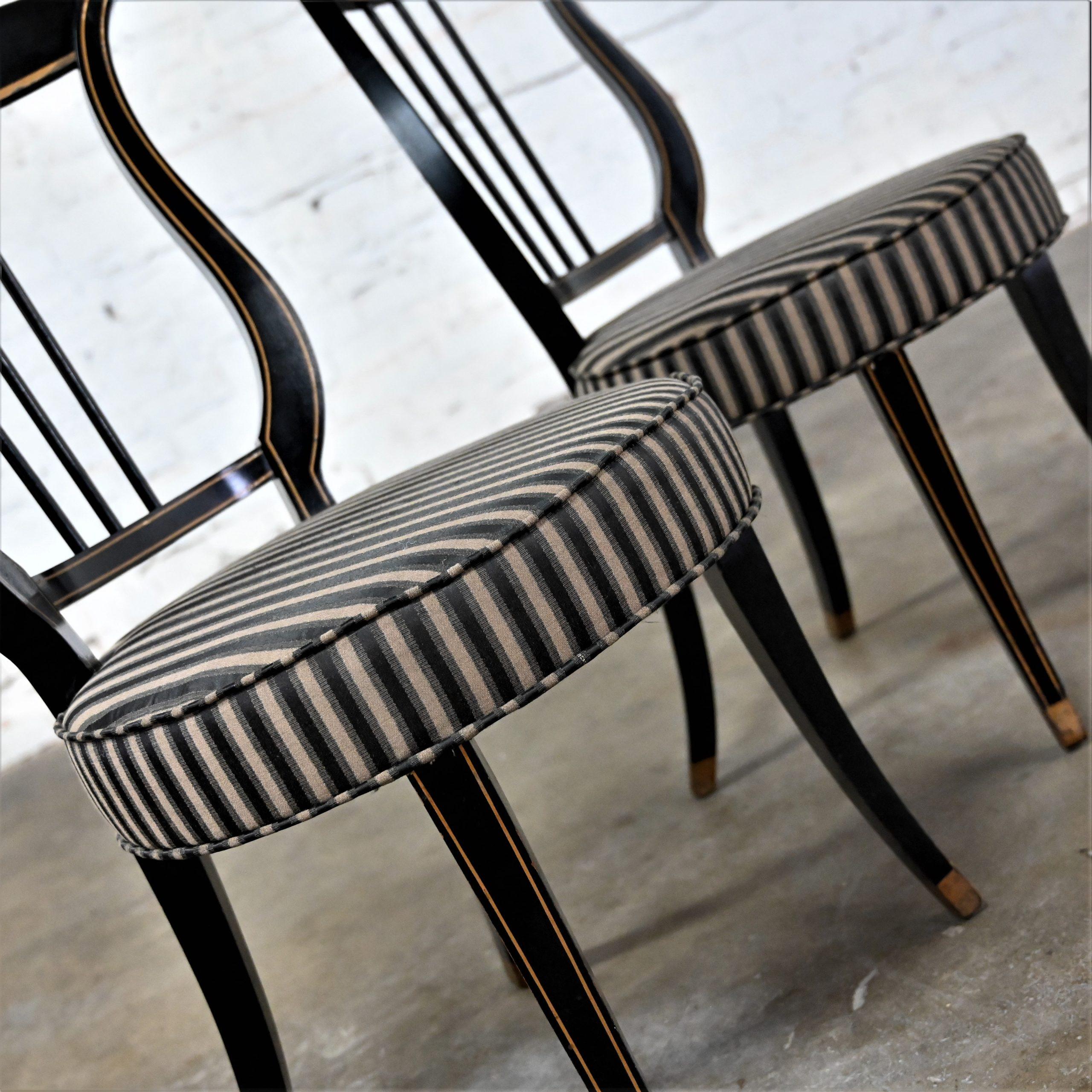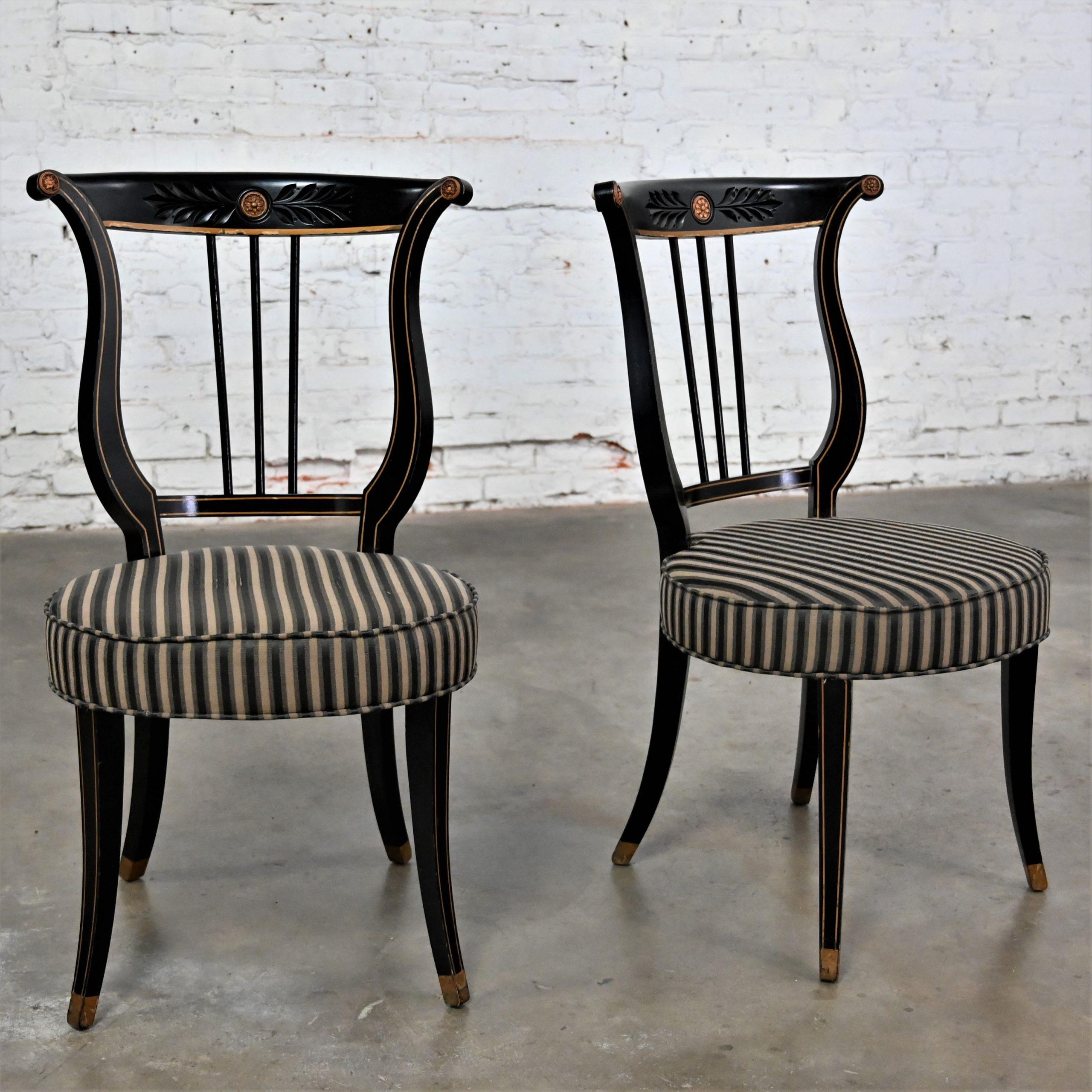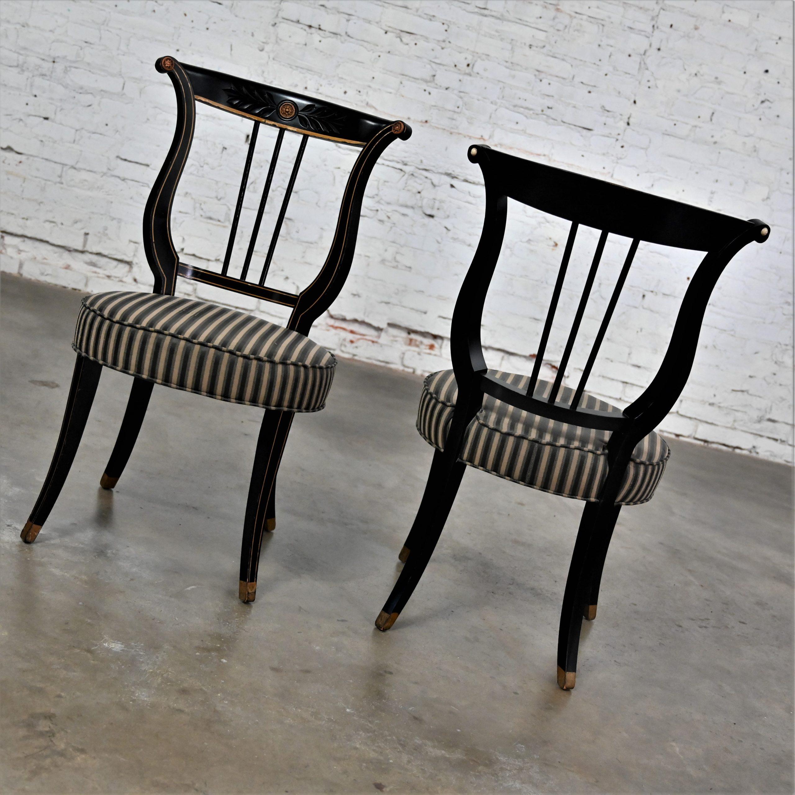 Liar, Liar, Pants on… Oh wait, not the same thing… BUT these chairs are ABSOLUTELY FIRE!!! This is a FABULOUS pair of Neoclassical style lyre back accent or occasional chairs comprised of black painted frames with hand carved details and gold painted designs on their lyre style backs which also bear three cylindrical slats in the center. They have slightly splayed legs with gold painted feet and round seats covered in a beautiful black, beige, and gray striped fabric. The seats are petite, we think they kind of resemble orchestra seats and the frames have wonderful patina which has created an “aged to perfection” vintage appearance… They are nothing short of FANTASTIC!! They will be wonderful in your sitting room with an accent table between them, in the living room across from your sofa, or place them at a small table for two in your master bedroom, sunroom, or study. They are very versatile and will come in handy in many places for many uses. They are going to be an incredible addition to any space in your home! Attractive presence, impeccable style, delightfully comfortable, and completely versatile… This pair of lyre back accent chairs has it ALL!!! Don’t wait any longer! Make them yours!!