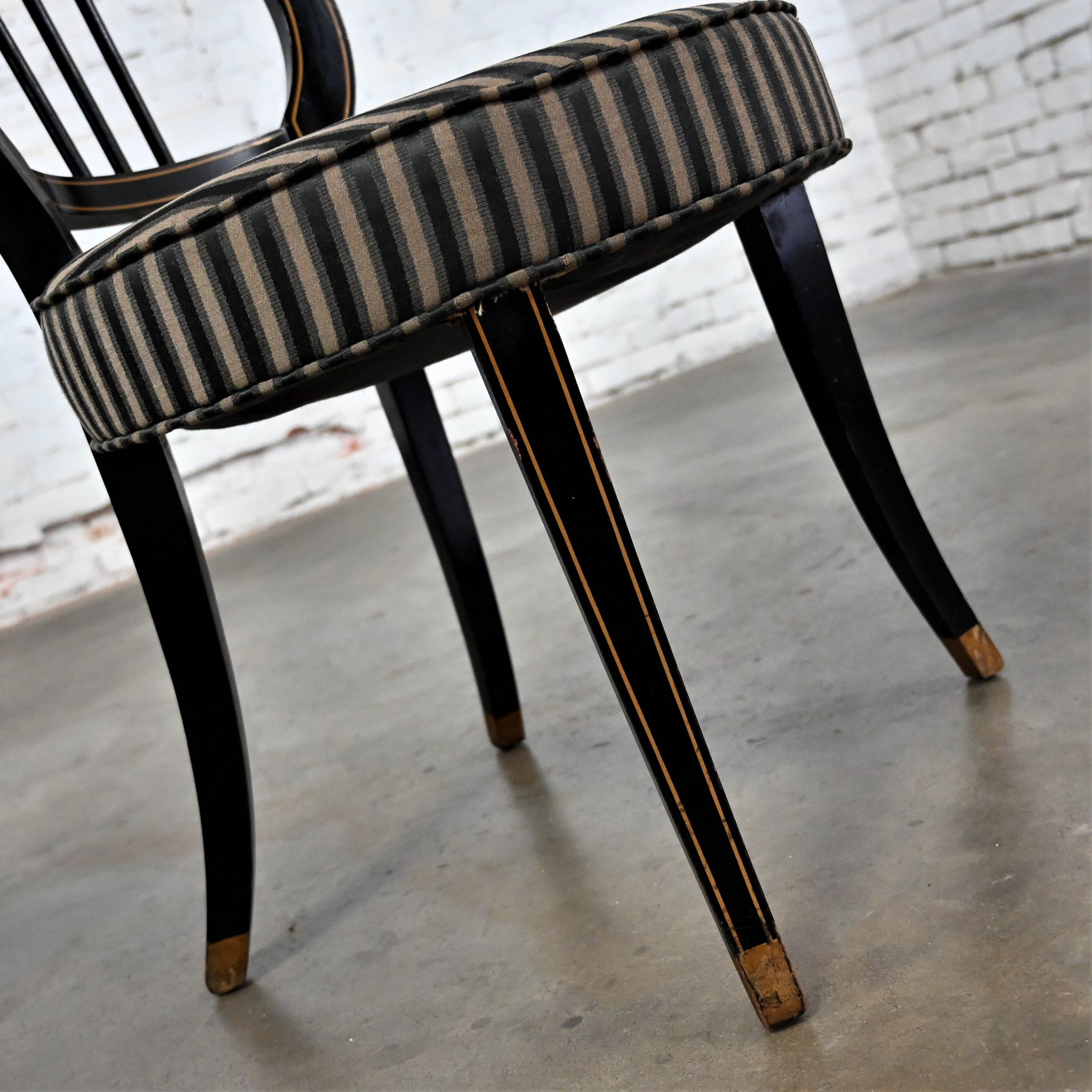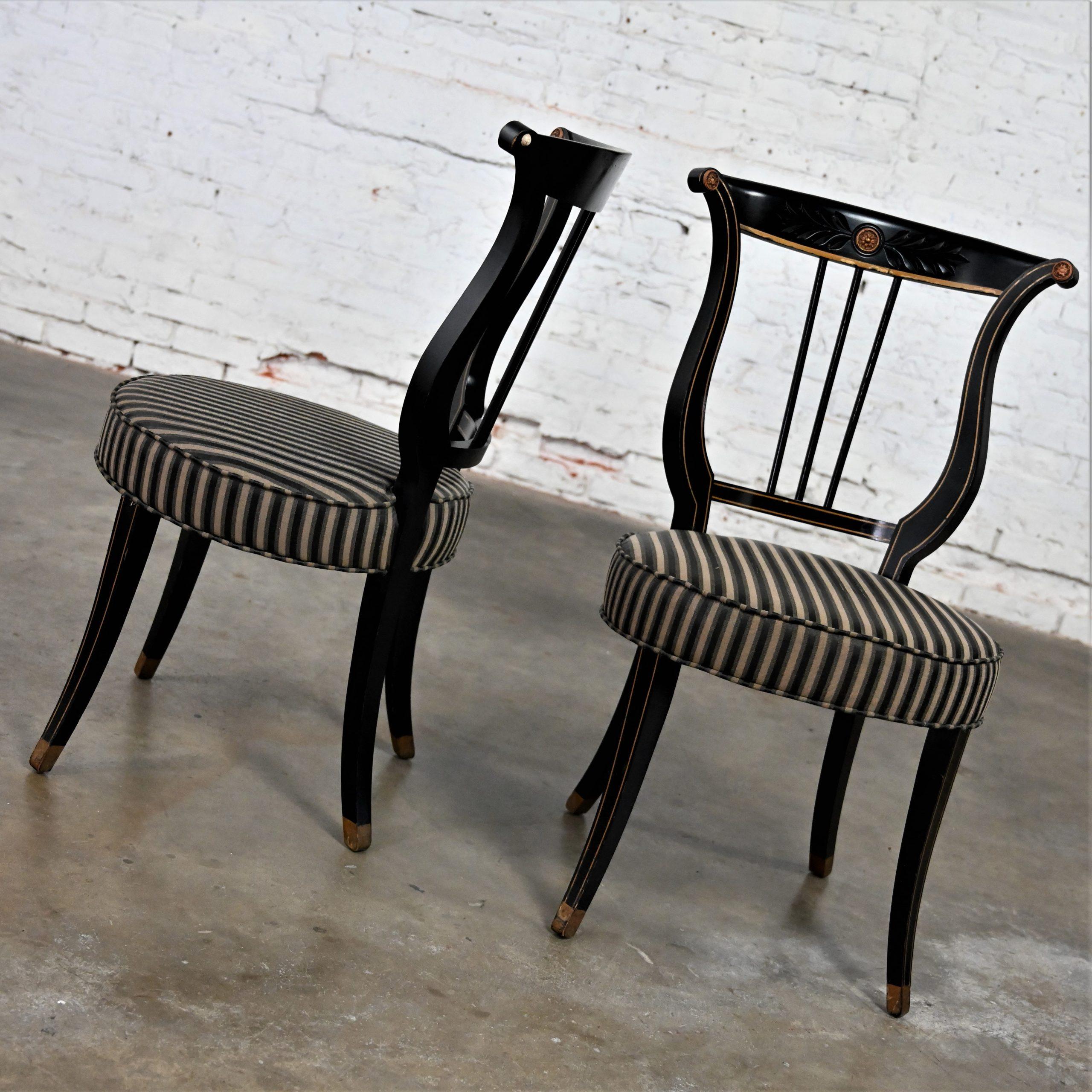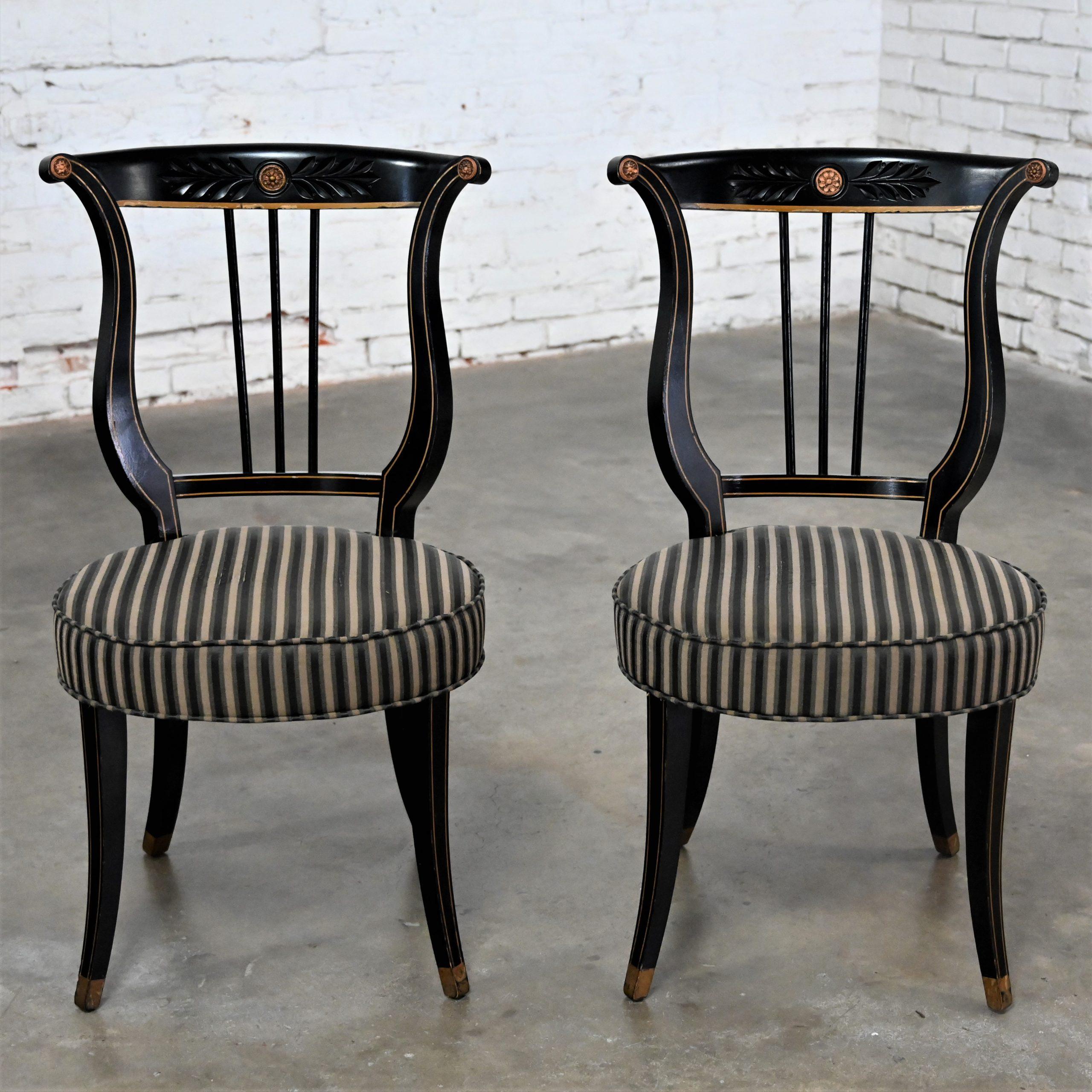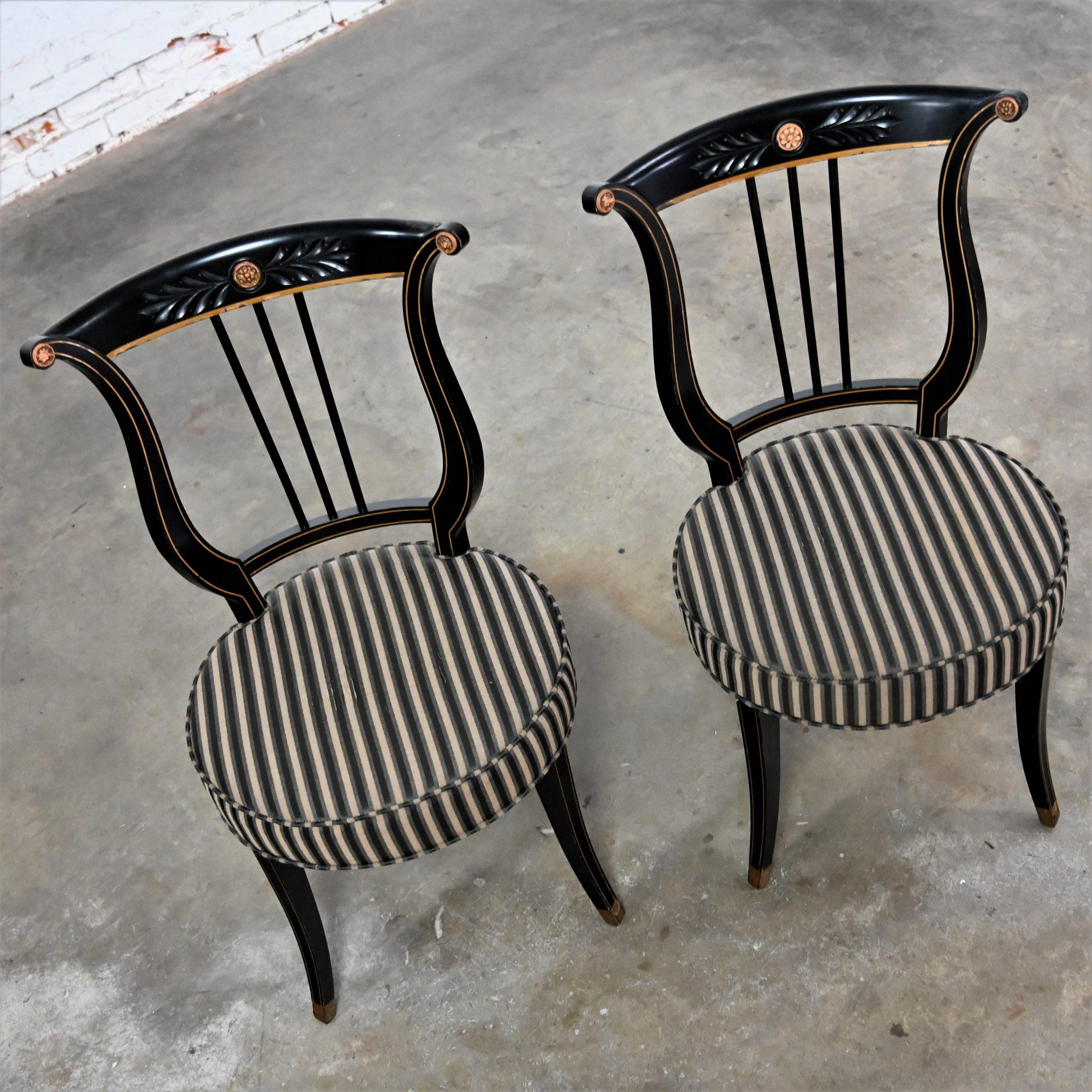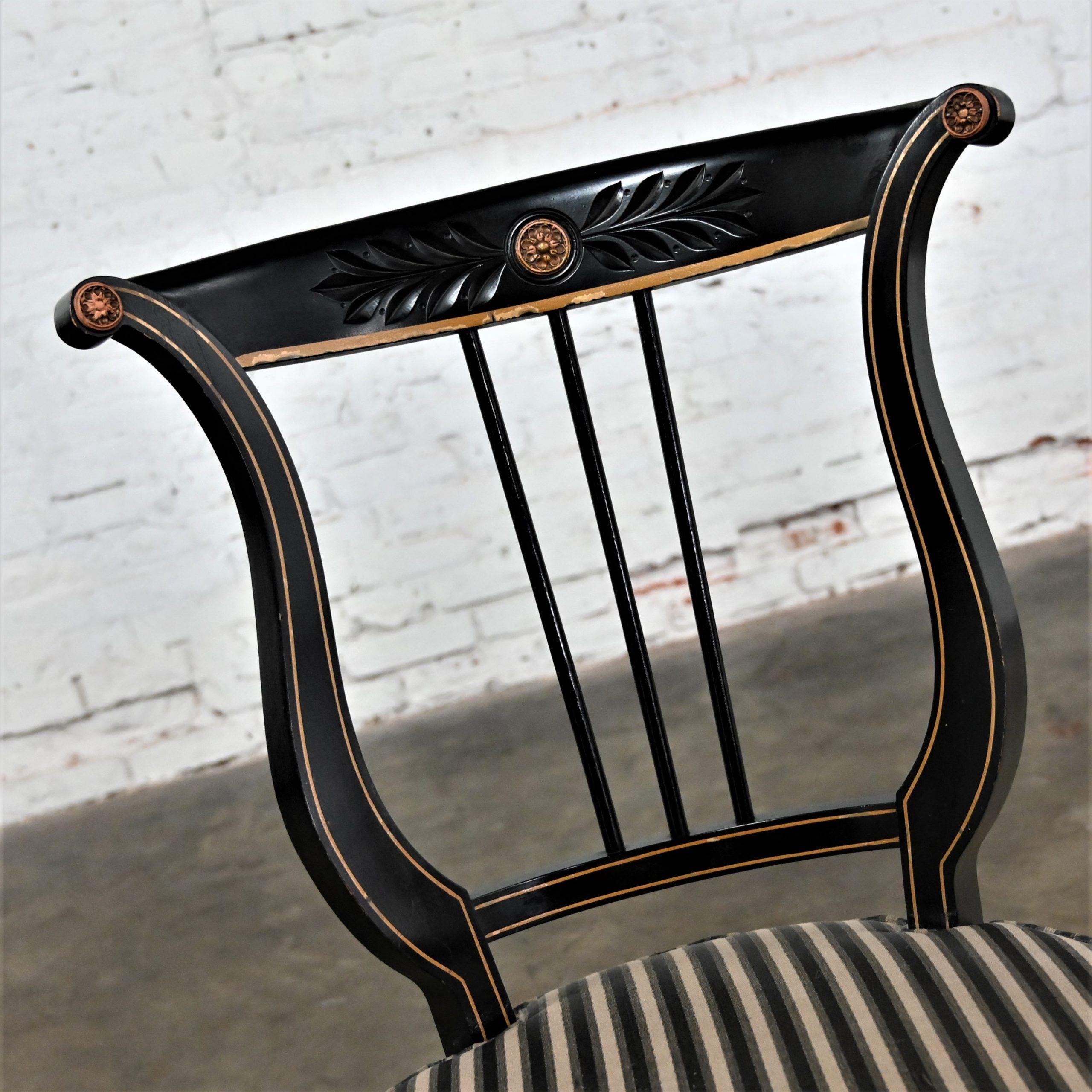 Liar, Liar, Pants on… Oh wait, not the same thing… BUT these chairs are ABSOLUTELY FIRE!!! This is a FABULOUS pair of Neoclassical style lyre back accent or occasional chairs comprised of black painted frames with hand carved details and gold painted designs on their lyre style backs which also bear three cylindrical slats in the center. They have slightly splayed legs with gold painted feet and round seats covered in a beautiful black, beige, and gray striped fabric. The seats are petite, we think they kind of resemble orchestra seats and the frames have wonderful patina which has created an “aged to perfection” vintage appearance… They are nothing short of FANTASTIC!! They will be wonderful in your sitting room with an accent table between them, in the living room across from your sofa, or place them at a small table for two in your master bedroom, sunroom, or study. They are very versatile and will come in handy in many places for many uses. They are going to be an incredible addition to any space in your home! Attractive presence, impeccable style, delightfully comfortable, and completely versatile… This pair of lyre back accent chairs has it ALL!!! Don’t wait any longer! Make them yours!!