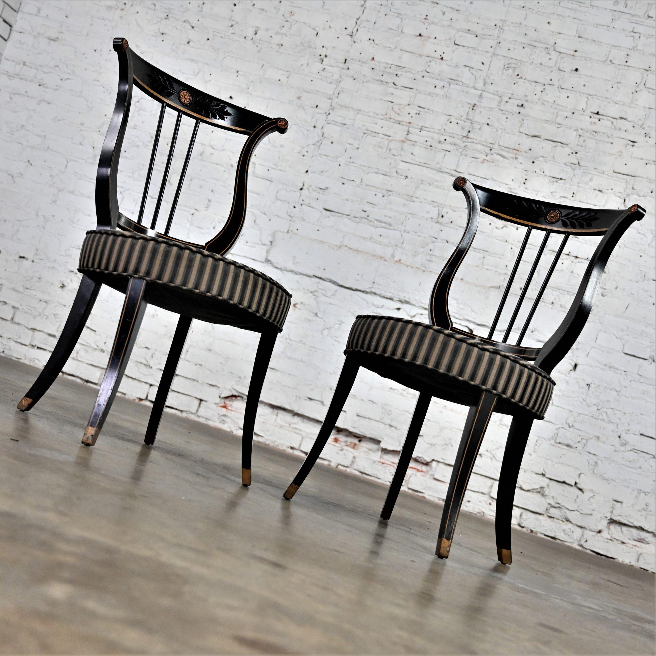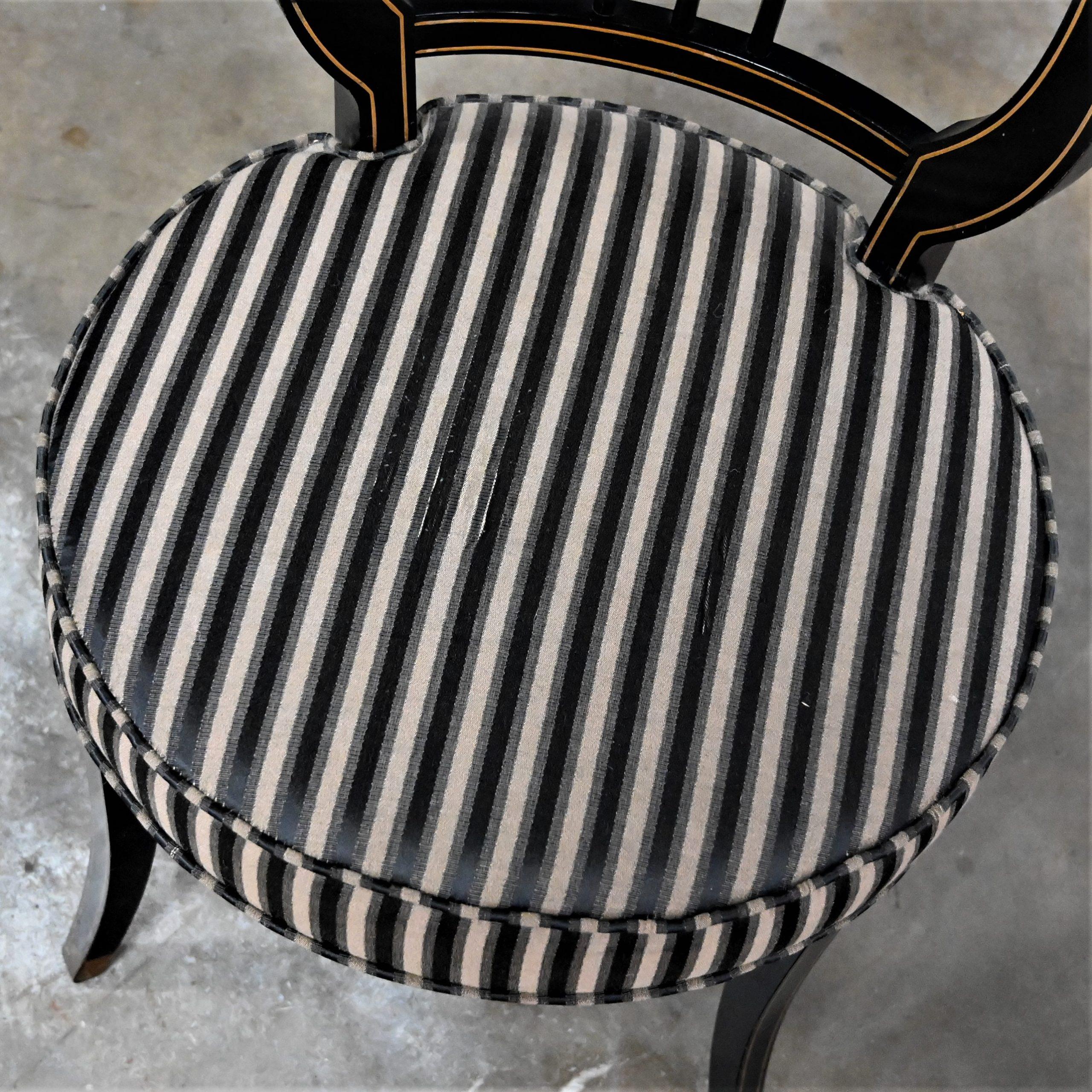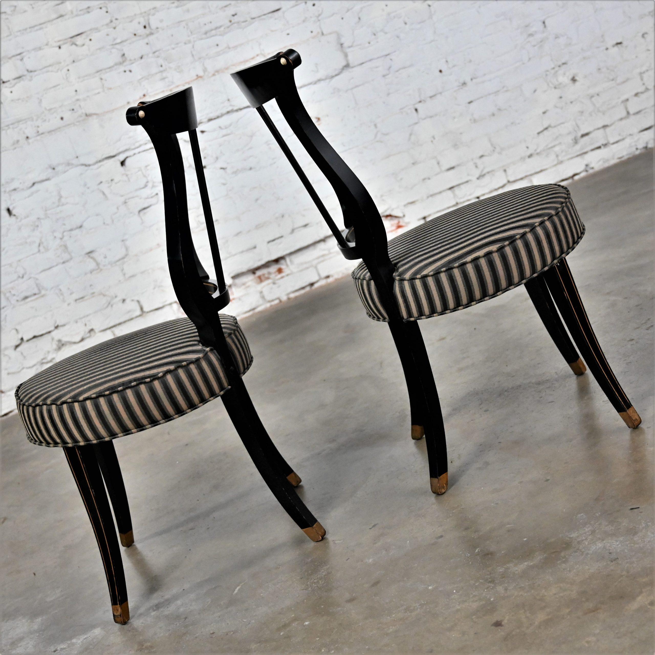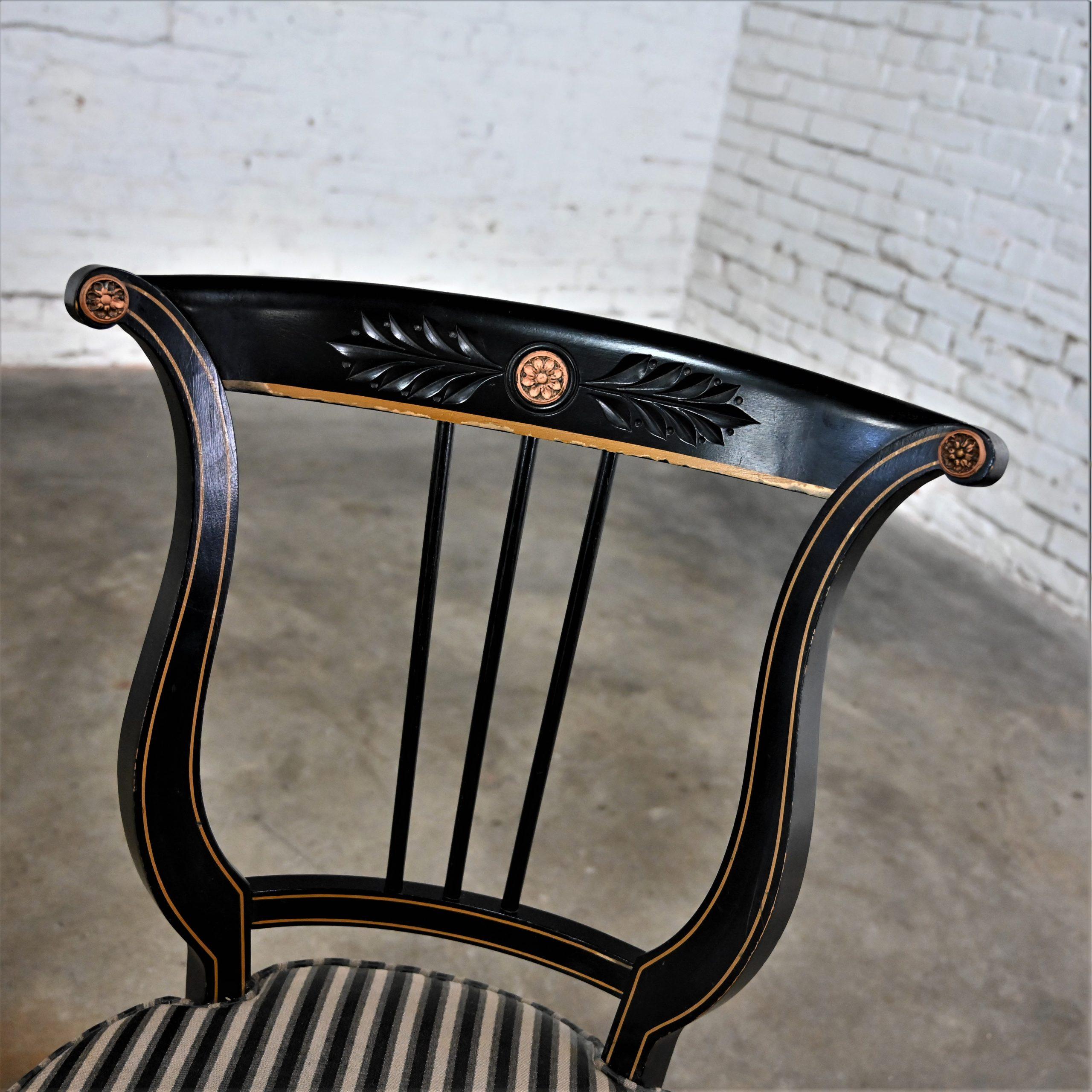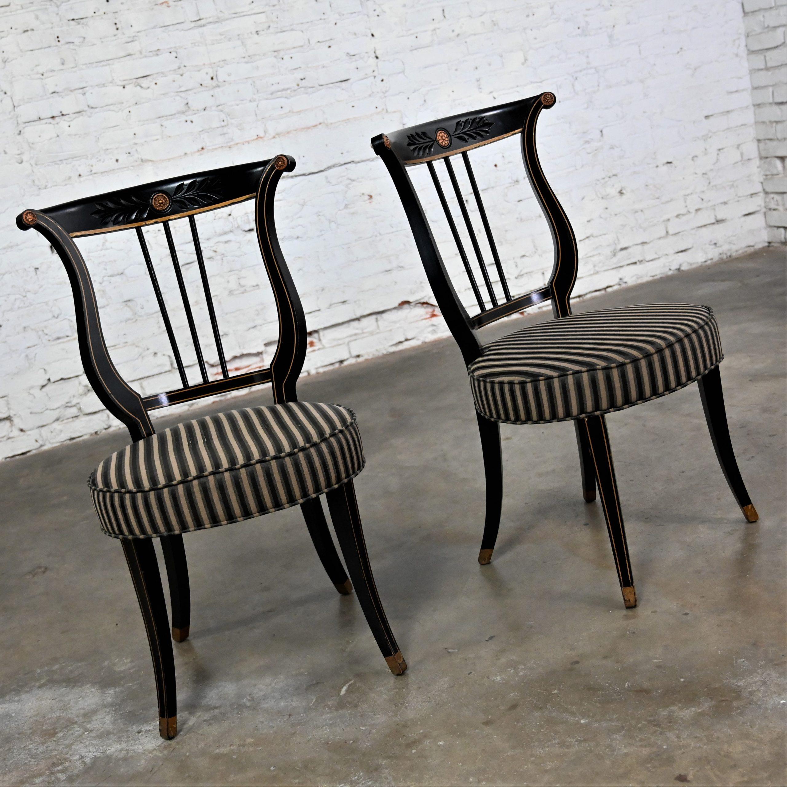 Liar, Liar, Pants on… Oh wait, not the same thing… BUT these chairs are ABSOLUTELY FIRE!!! This is a FABULOUS pair of Neoclassical style lyre back accent or occasional chairs comprised of black painted frames with hand carved details and gold painted designs on their lyre style backs which also bear three cylindrical slats in the center. They have slightly splayed legs with gold painted feet and round seats covered in a beautiful black, beige, and gray striped fabric. The seats are petite, we think they kind of resemble orchestra seats and the frames have wonderful patina which has created an “aged to perfection” vintage appearance… They are nothing short of FANTASTIC!! They will be wonderful in your sitting room with an accent table between them, in the living room across from your sofa, or place them at a small table for two in your master bedroom, sunroom, or study. They are very versatile and will come in handy in many places for many uses. They are going to be an incredible addition to any space in your home! Attractive presence, impeccable style, delightfully comfortable, and completely versatile… This pair of lyre back accent chairs has it ALL!!! Don’t wait any longer! Make them yours!!
