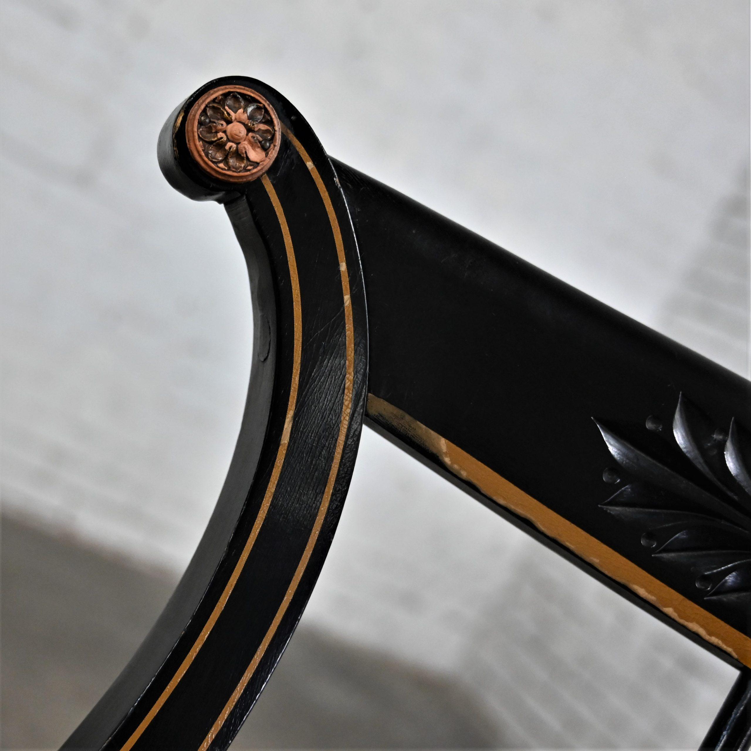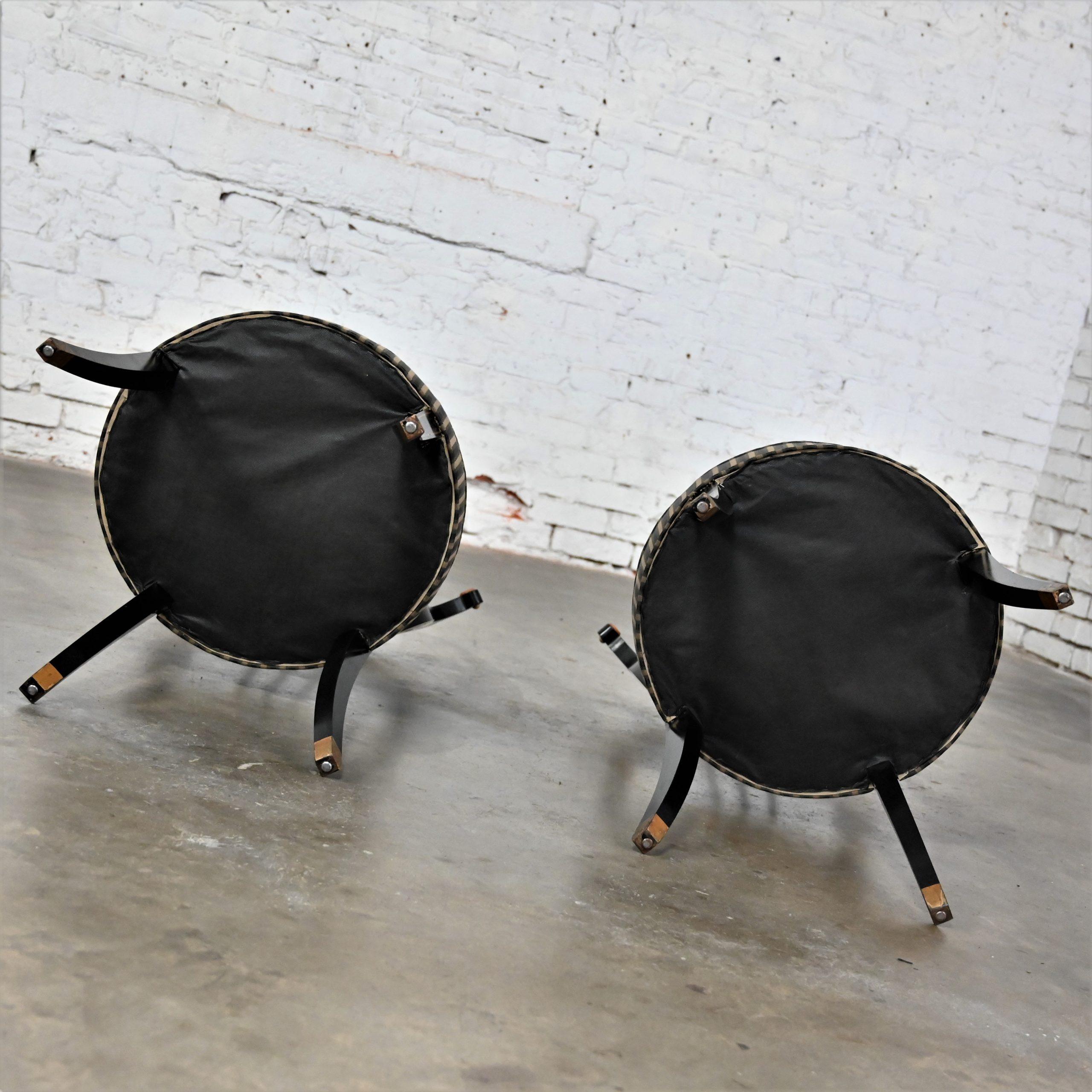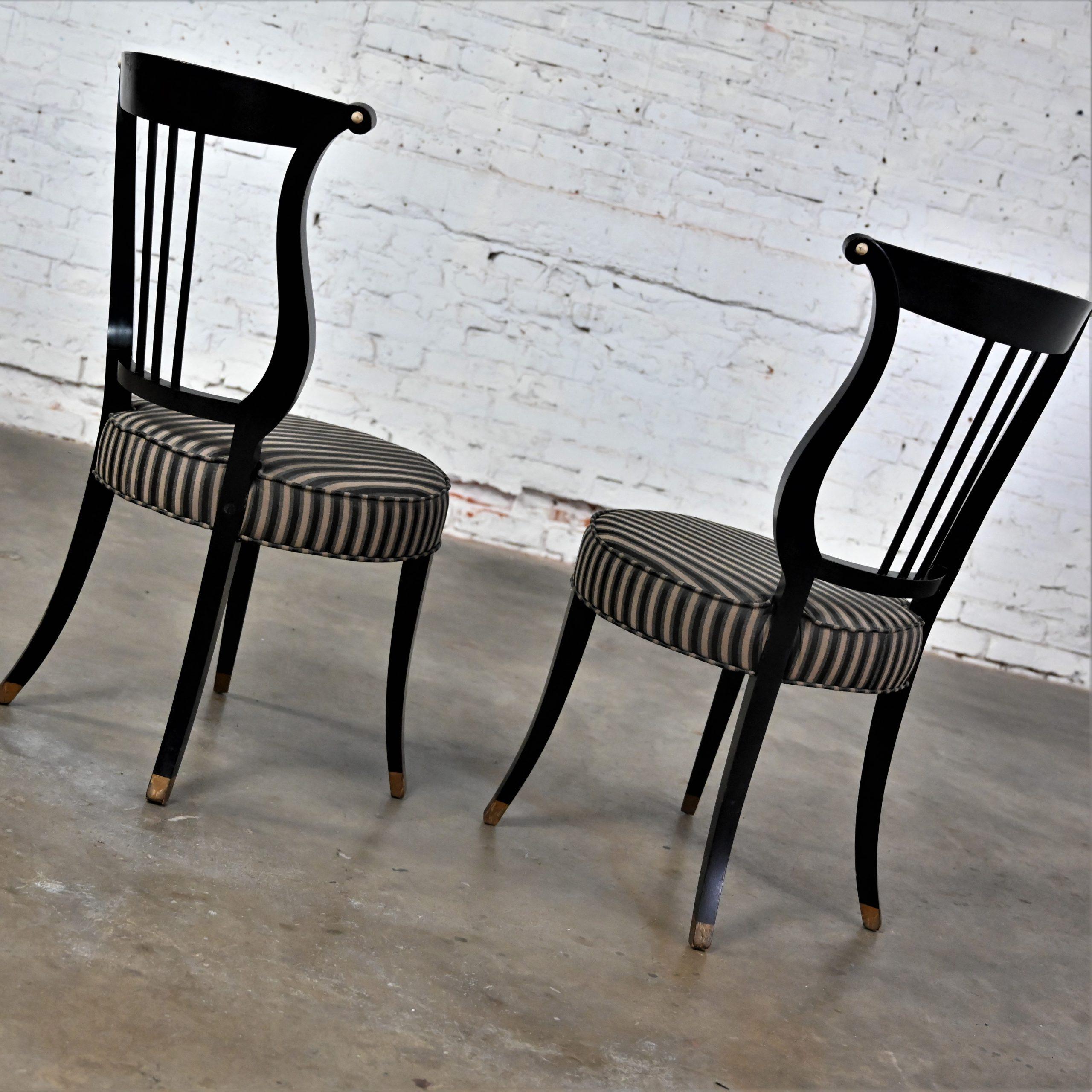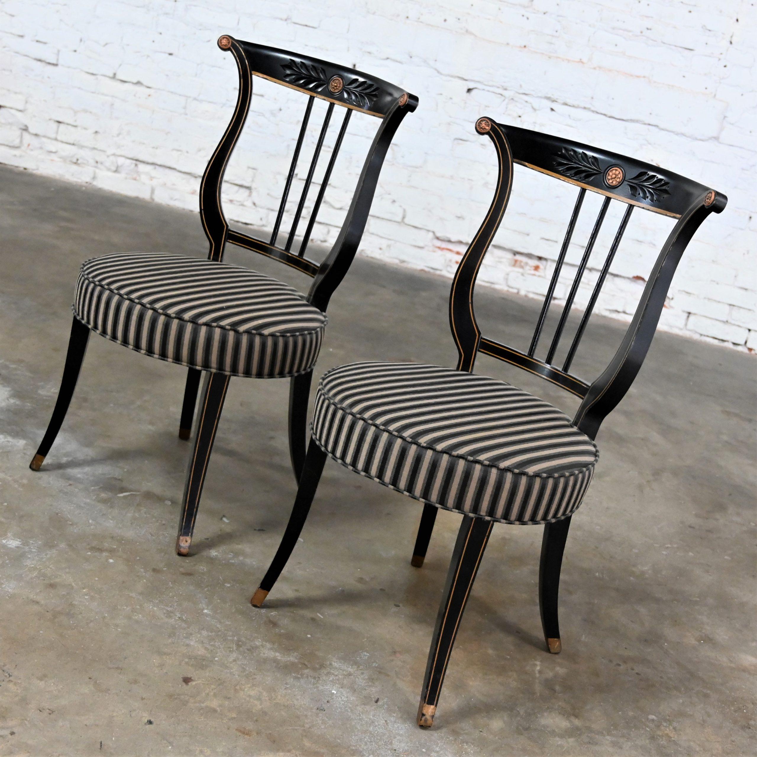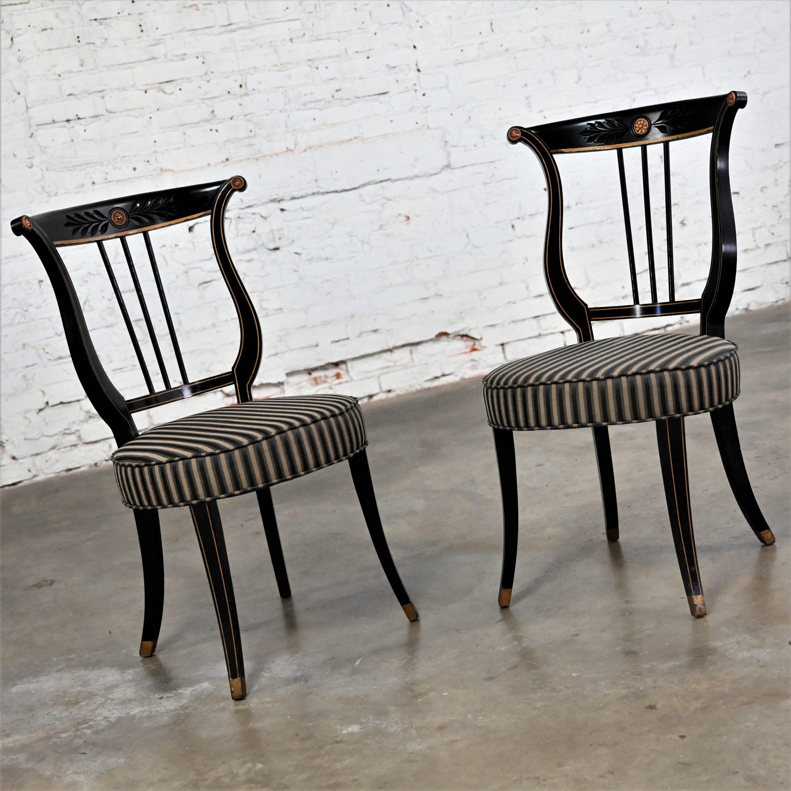 Liar, Liar, Pants on… Oh wait, not the same thing… BUT these chairs are ABSOLUTELY FIRE!!! This is a FABULOUS pair of Neoclassical style lyre back accent or occasional chairs comprised of black painted frames with hand carved details and gold painted designs on their lyre style backs which also bear three cylindrical slats in the center. They have slightly splayed legs with gold painted feet and round seats covered in a beautiful black, beige, and gray striped fabric. The seats are petite, we think they kind of resemble orchestra seats and the frames have wonderful patina which has created an “aged to perfection” vintage appearance… They are nothing short of FANTASTIC!! They will be wonderful in your sitting room with an accent table between them, in the living room across from your sofa, or place them at a small table for two in your master bedroom, sunroom, or study. They are very versatile and will come in handy in many places for many uses. They are going to be an incredible addition to any space in your home! Attractive presence, impeccable style, delightfully comfortable, and completely versatile… This pair of lyre back accent chairs has it ALL!!! Don’t wait any longer! Make them yours!!