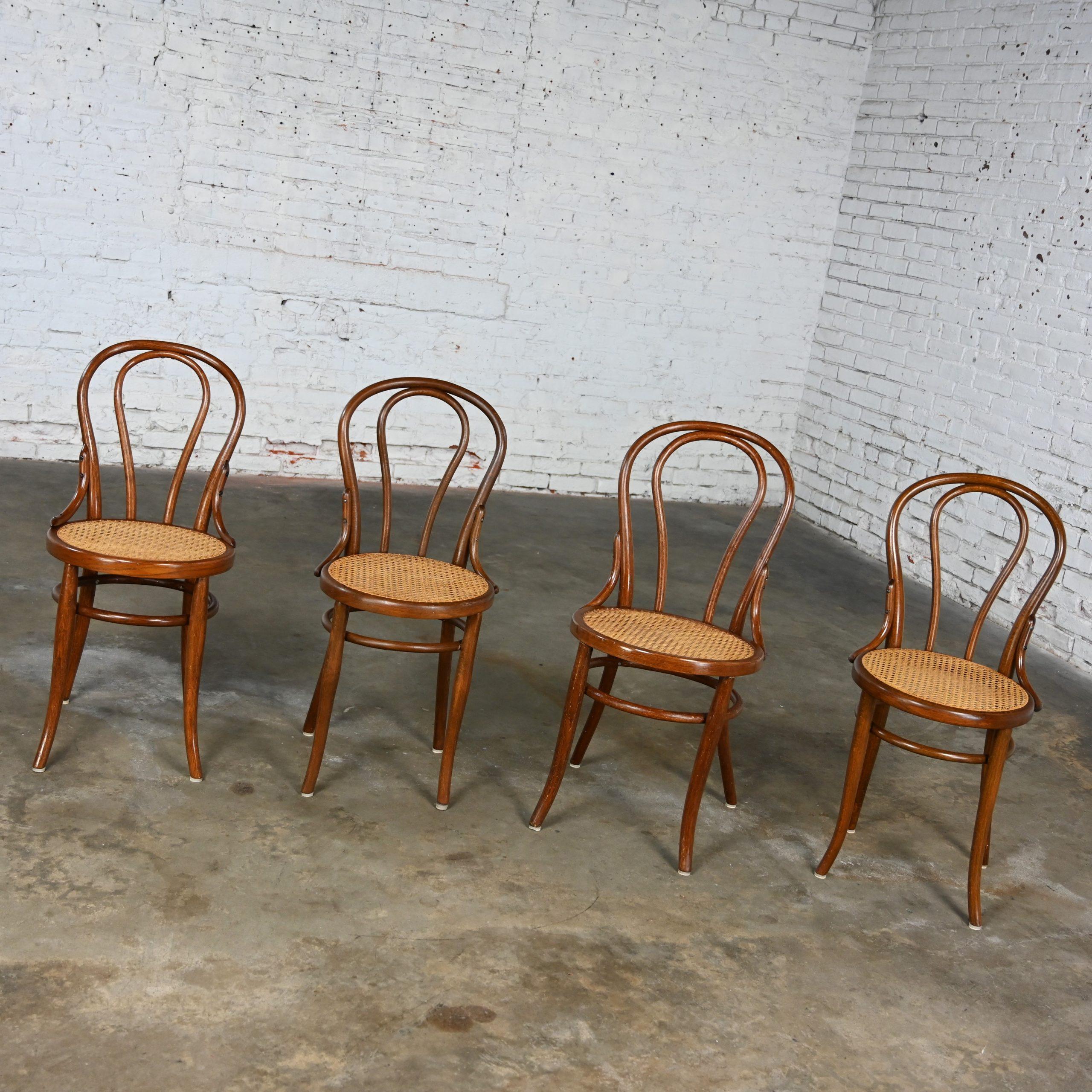 Four Late 19th to Early 20th Century Bauhaus Style #18 Café Chairs by Thonet Bentwood Frames & Hand Caned Seats