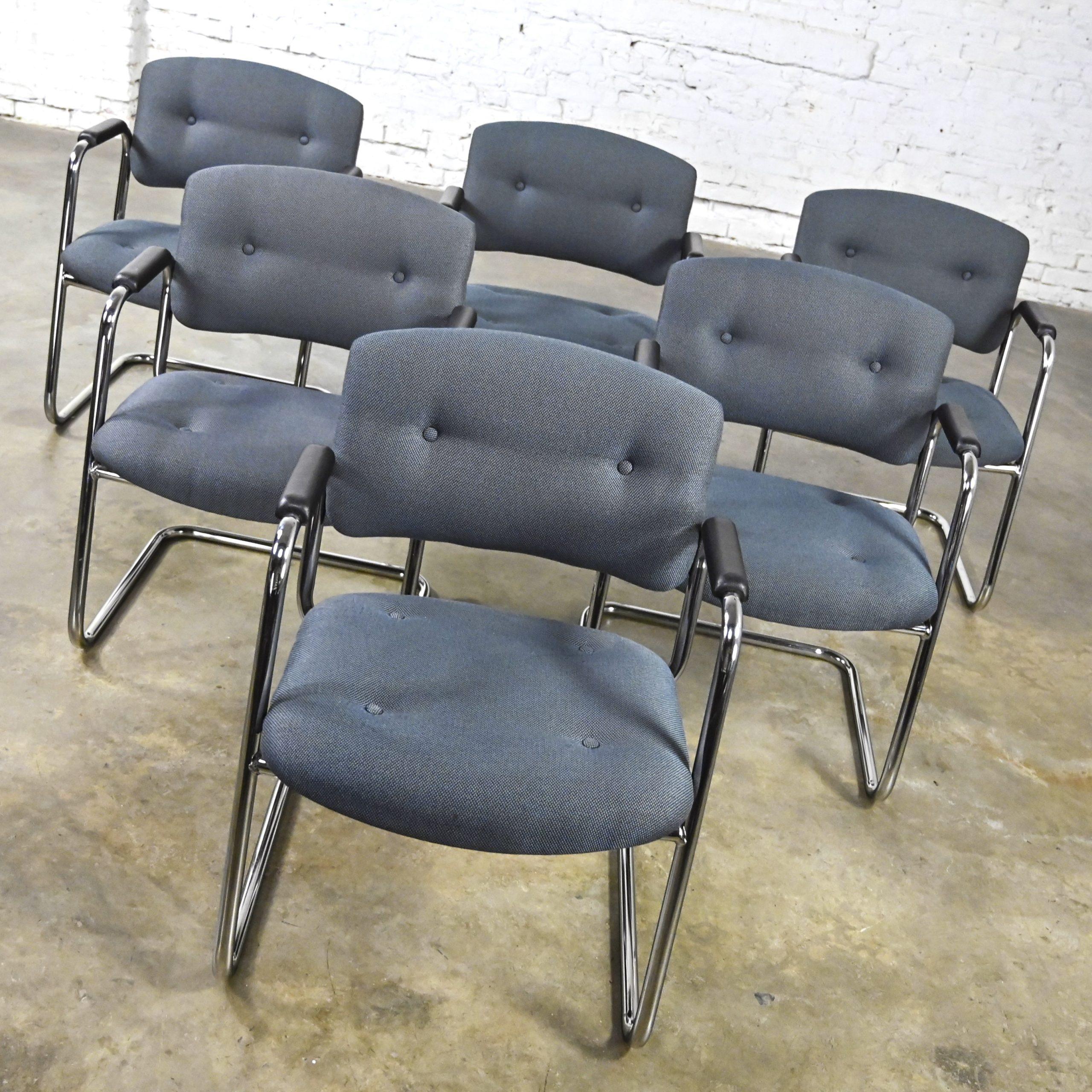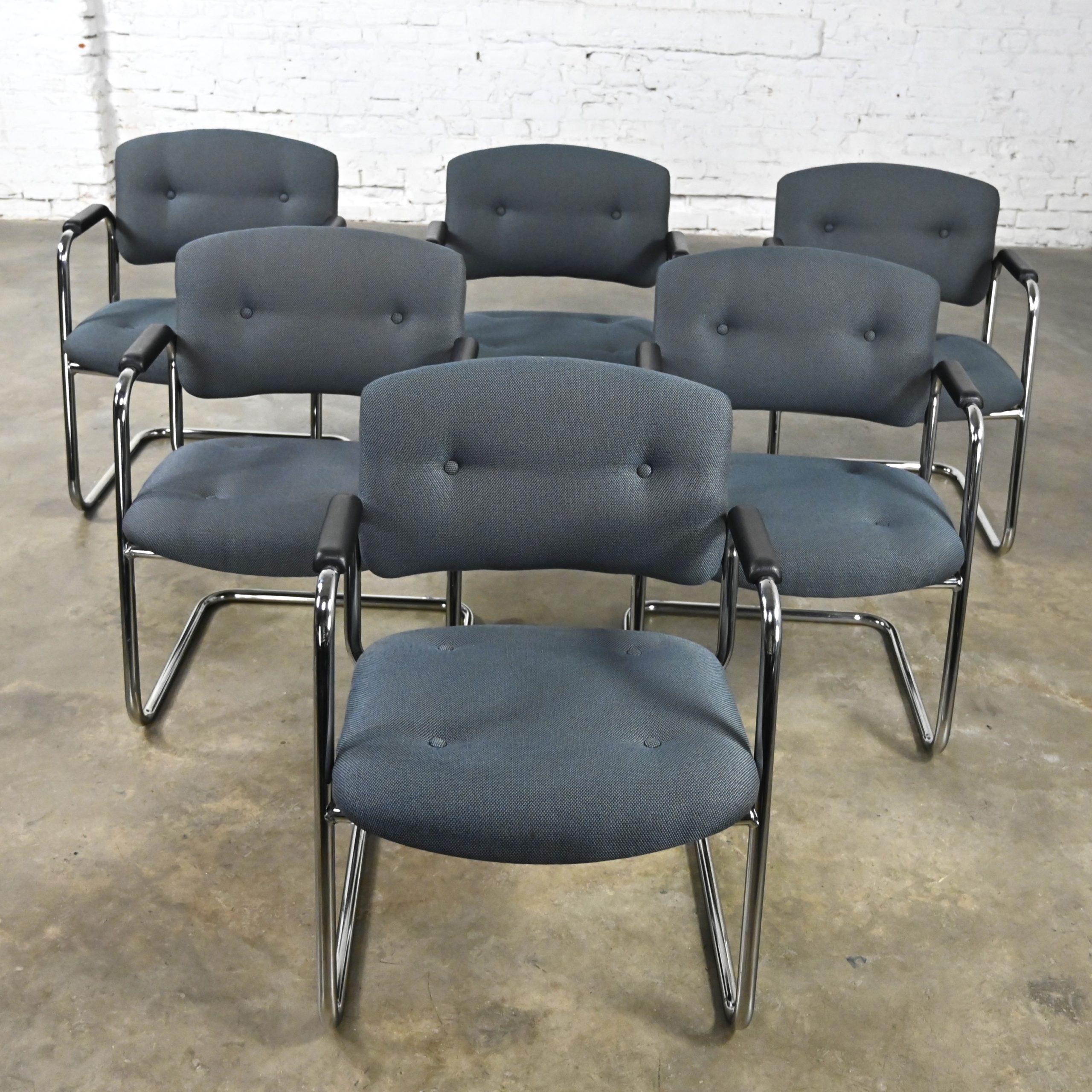 We have HALF A DOZEN reasons for you to fall in love!!! This is a spectacular set of six gray and chrome cantilever chairs made by United Chair Company and they’re in the style of Steelcase. They are comprised of a gorgeous chrome cantilever frame with black plastic armrests, and they wear their original awesome gray tweed fabric with button detail on their backs and seat cushions. The fabric is cool because in different lights, it looks a little different. It’s kind of gray, kind of blue, and has little orange and yellow specs throughout… It takes on the color of what you set it with. Super stylish and super comfortable!! We say these chairs are mostly modern, but they would definitely blend in beautifully with Art Deco, mid-century modern, or Bauhaus styles. And did we mention that we have 9 of them available? So, your options are limitless! (Although this listing is for a set of 6 we have other listings with different set totals so look for those in case you want more or less than six!) They would be fabulous seating for your dining table or around the office conference table. But maybe you only want one or two? We can do that! This set of six, or a few more… We can do that too!! They will work wonderfully at a game table, in your home office or den, in your bedroom, sitting room, or simply as comfortable extra seating in your living room. Are they comfortable? VERY. Are they versatile? DEFINITELY. Will they go with many design styles? ABSOLUTELY!! So…buy this set of six or if you need two, four, eight, or ALL 9…Look for those listings or contact us! Don’t wait, make them yours!!!