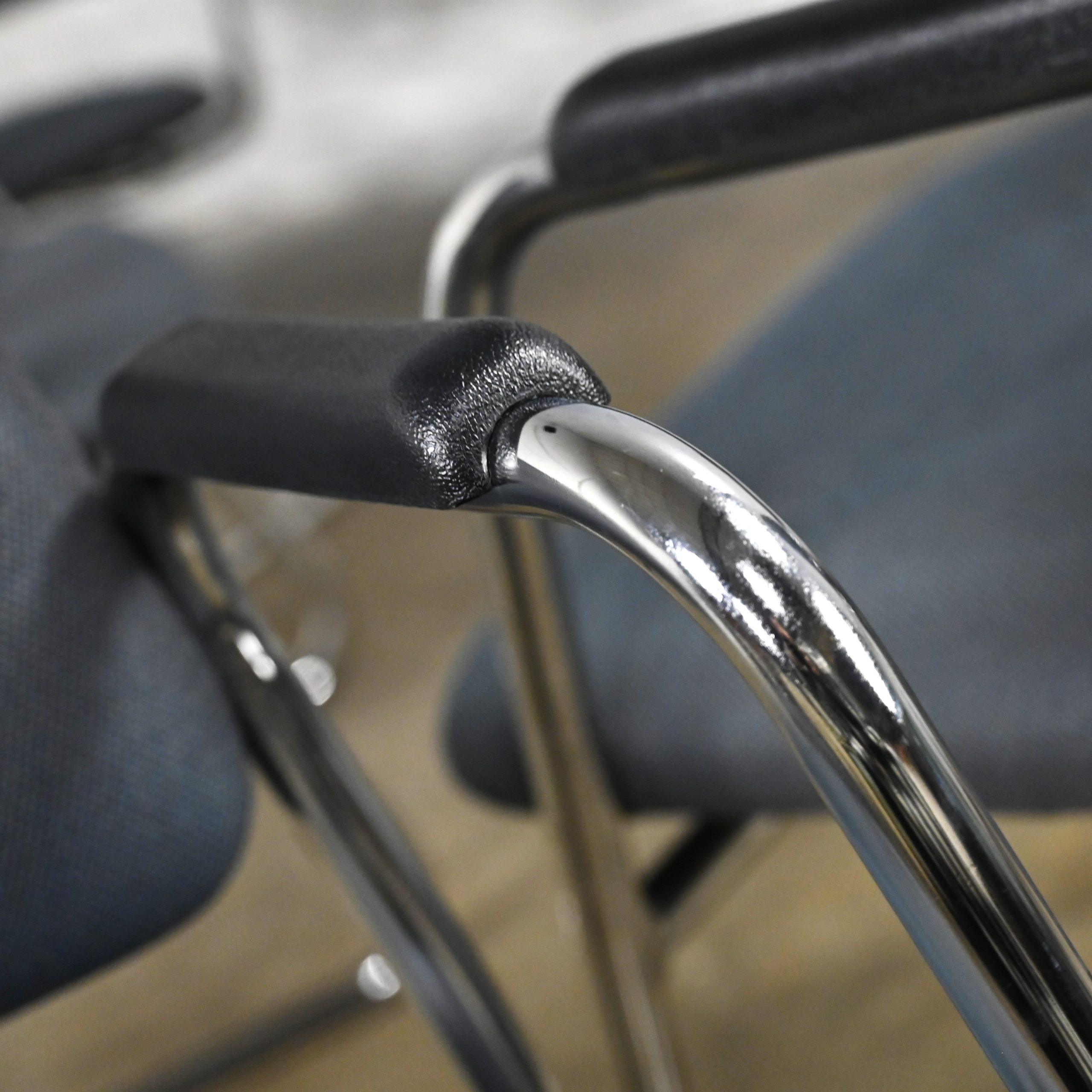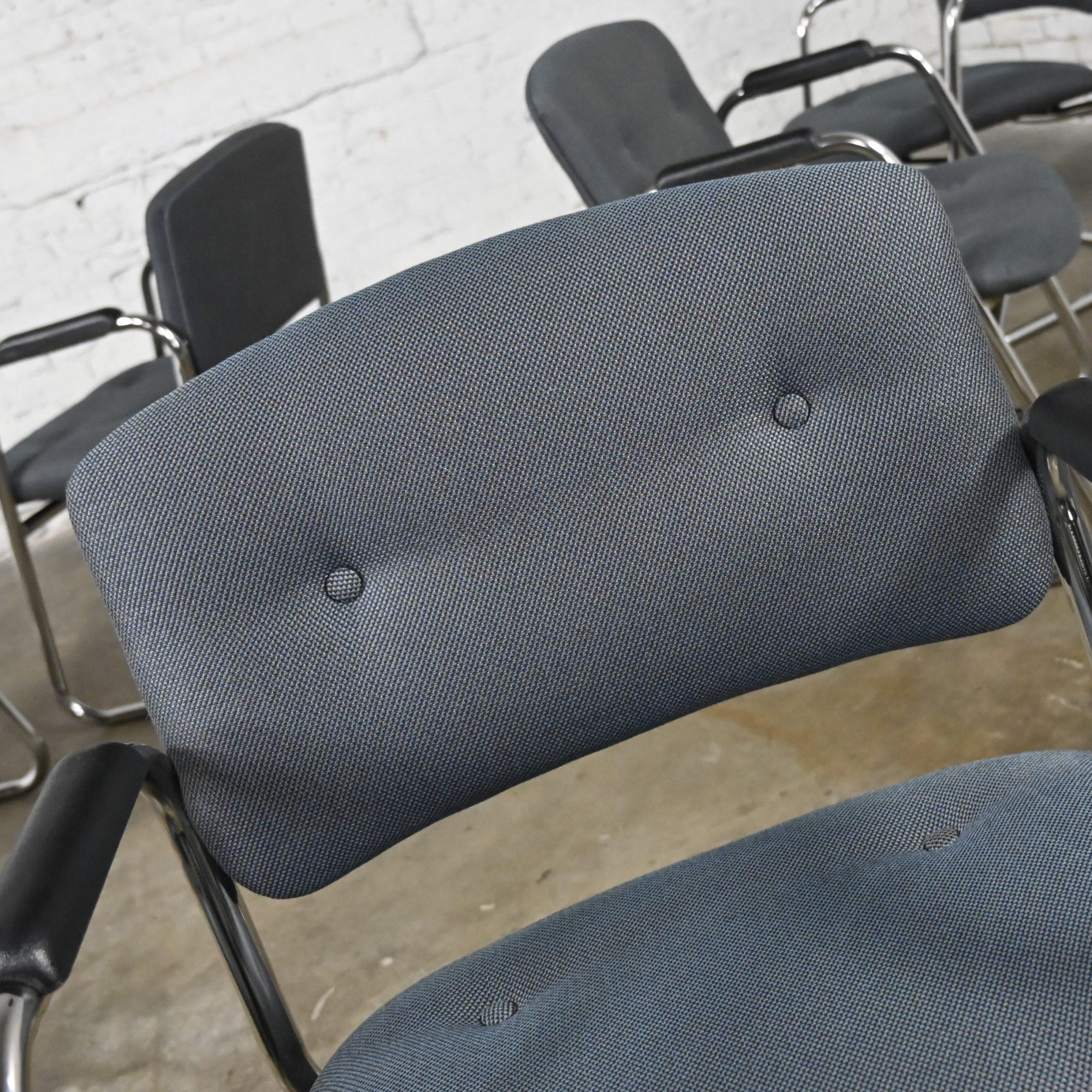 You’ve heard of Crazy Eights… Well, we have a crazy FABULOUS set of eight chairs for you to check out!! This is a magnificent set of eight gray and chrome cantilever chairs made by United Chair Company and they’re in the style of Steelcase. They are comprised of a gorgeous chrome cantilever frame with black plastic armrests, and they wear their original awesome gray tweed fabric with button detail on their backs and seat cushions. The fabric is cool because in different lights, it looks a little different. It’s kind of gray, kind of blue, and has little orange and yellow specs throughout… It takes on the color of what you set it with. Super stylish and super comfortable!! We say these chairs are mostly modern, but they would definitely blend in beautifully with Art Deco, mid-century modern, or Bauhaus styles. And did we mention that we have 9 of them available? So, your options are limitless! (Although this listing is for a set of 8 we have other listings with different set totals so look for those in case you want more or less than eight!) They would be fabulous seating for your dining table or around the office conference table. But maybe you only want one or two? We can do that! This set of eight, or a few more… We can do that too!! They will work wonderfully at a game table, in your home office or den, in your bedroom, sitting room, or simply as comfortable extra seating in your living room. Are they comfortable? VERY. Are they versatile? DEFINITELY. Will they go with many design styles? ABSOLUTELY!! So…buy this set of 8 or if you need two, four, six, or ALL 9…Look for those listings or contact us! Don’t wait, make them yours!!!