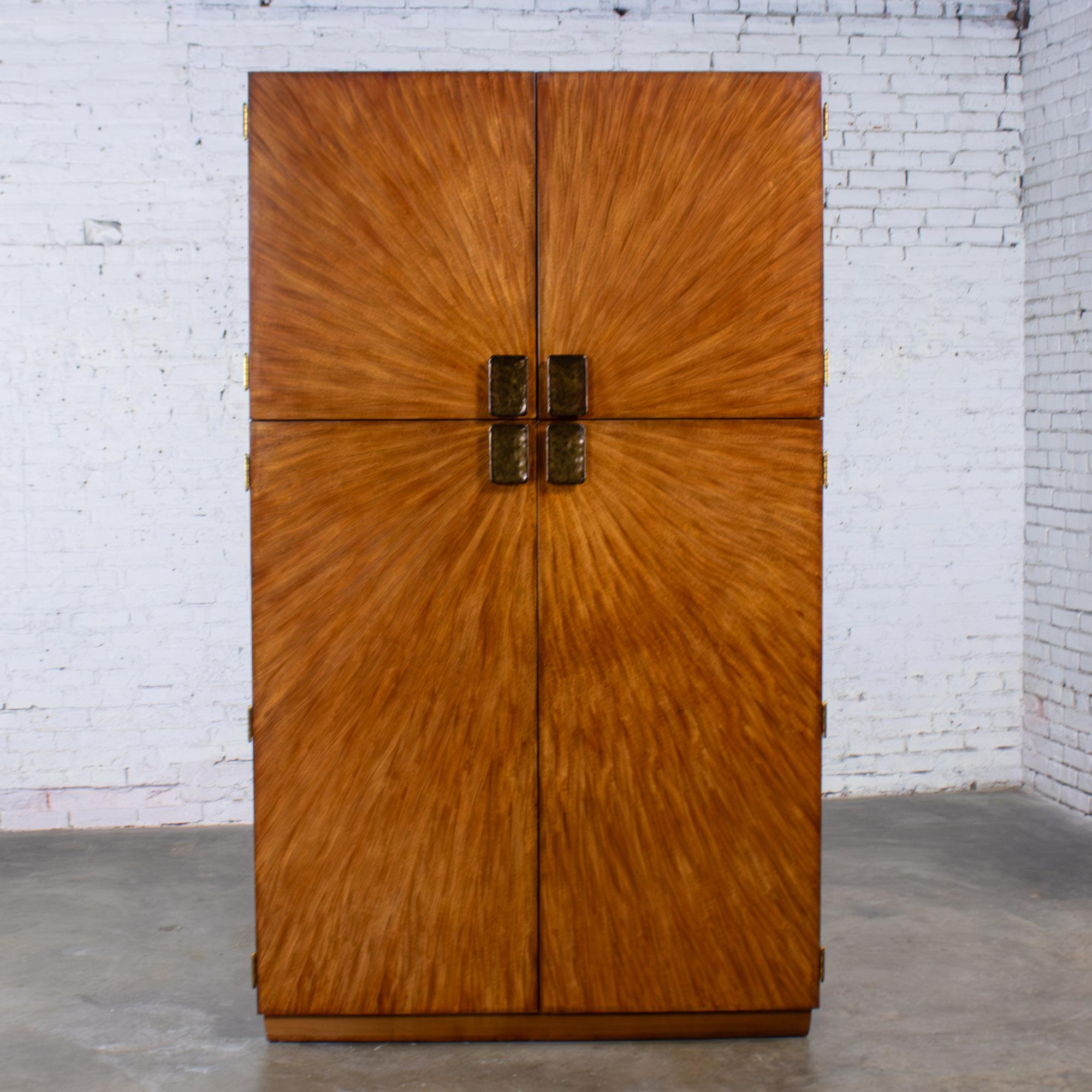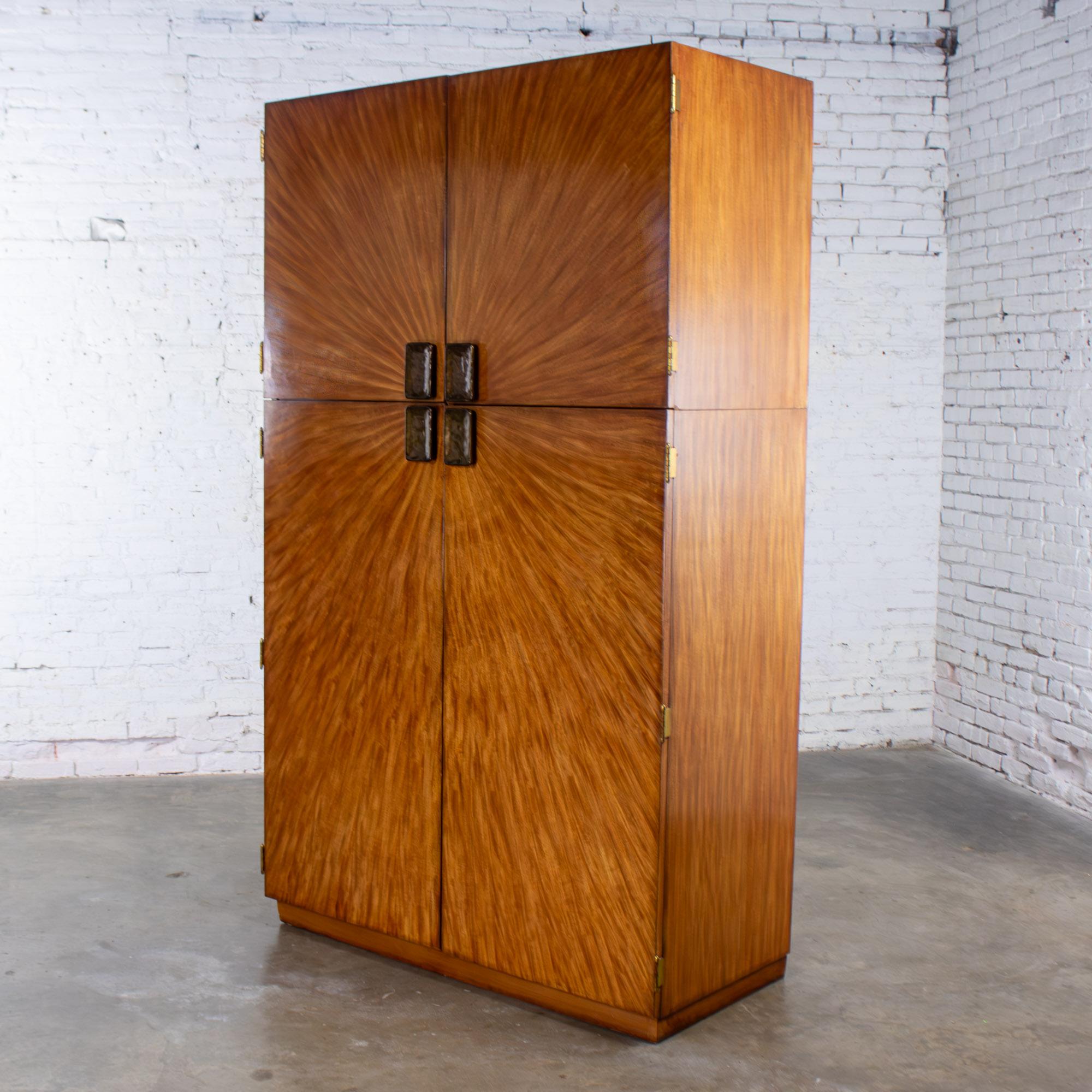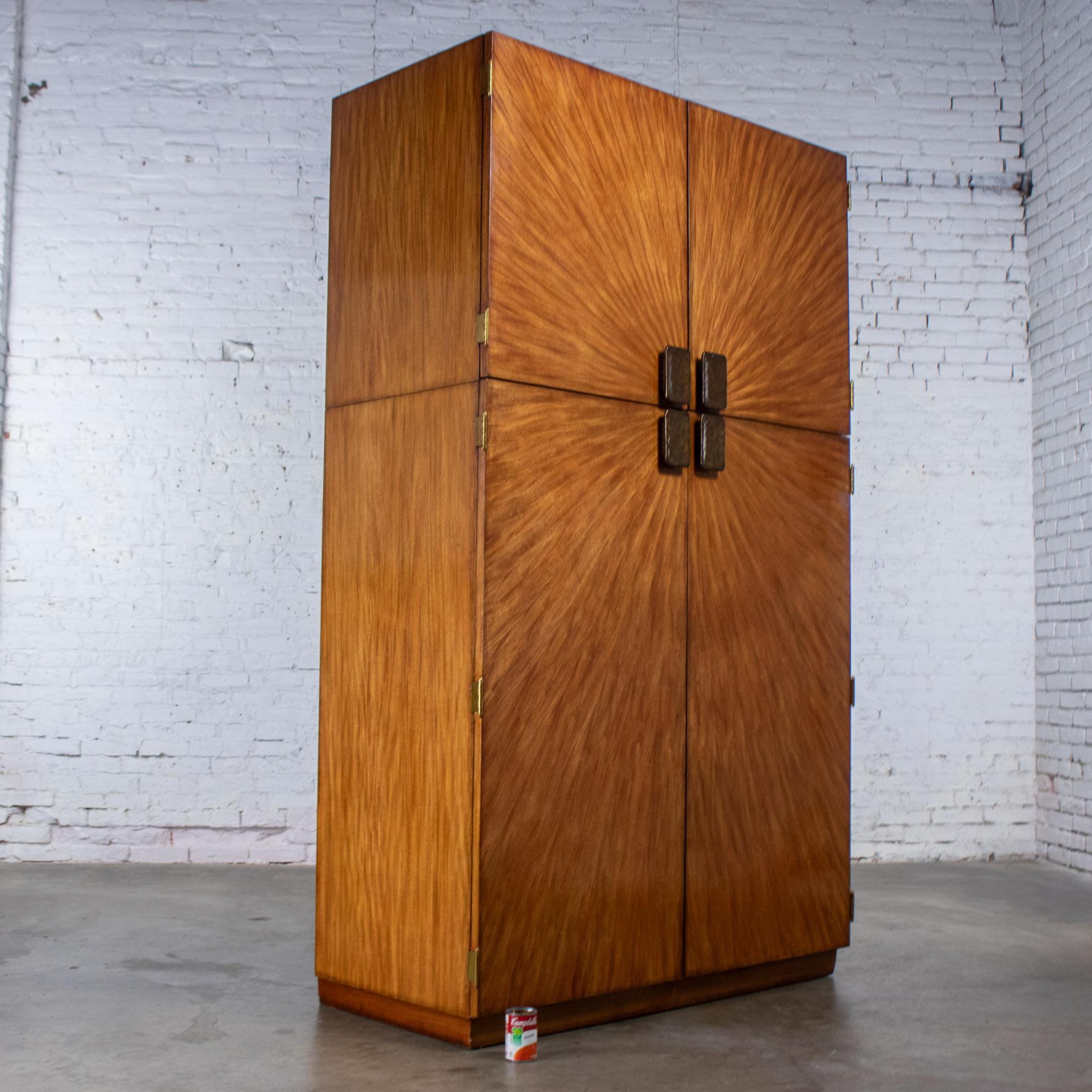 Hello there!!! My, what a HANDSOME HENREDON cabinet!!! Folks, there are plenty of cabinets in this world BUT every now and then (And NOT very often!) you come across an EXTRORDINARY vintage Henredon piece like this and it simply takes your breath away!!!! WOW!!! This is a STUNNING Entertainment Arbus Armoire 6000 Series by Henredon Furniture composed of two pieces, an upper and lower section with each of these sections comprised of beautiful book matched burl wood frames bearing a SPECTACULAR starburst pattern illuminating from behind the lovely cast bronze handles that meet in the upper & lower corners of each of the four doors. The doors open to reveal an inside storage space with two removeable & adjustable wood shelves in the center of each section and two fixed wood shelves, one created by the cabinet connection and the other in the lower section above four drawers with carved handle pulls. So, technically you have four shelves to use for storage!! The cabinet features upper and lower audio/video ventilated knockouts (that have never been knocked out,) and has two small circular convenient cord cut outs on the lower left corner of each section AND it comes with electrical supply cords. If you use it as an entertainment center or cabinet simply take out the removeable shelves and you have the perfect place for a large television, computer or monitor, gaming components, & other electronic supplies. Or use it with one or both wood shelves and create plenty of organized storage space for games, movies, books, or even a turntable and some records & vinyl!! Maybe you choose to place it in your bedroom or dressing area utilized as an armoire or wardrobe and fill it with clothing, shoes, and accessories. This cabinet is SUPER versatile!!! It stands BOLD & BEAUTIFULLY upon a slightly recessed base and exudes an incredible Modern to Art Deco Revival presence sure to make a transformative statement in whatever room it occupies!!!! And just a reminder to look at the measurements because this piece is monumental in both style and size!!!