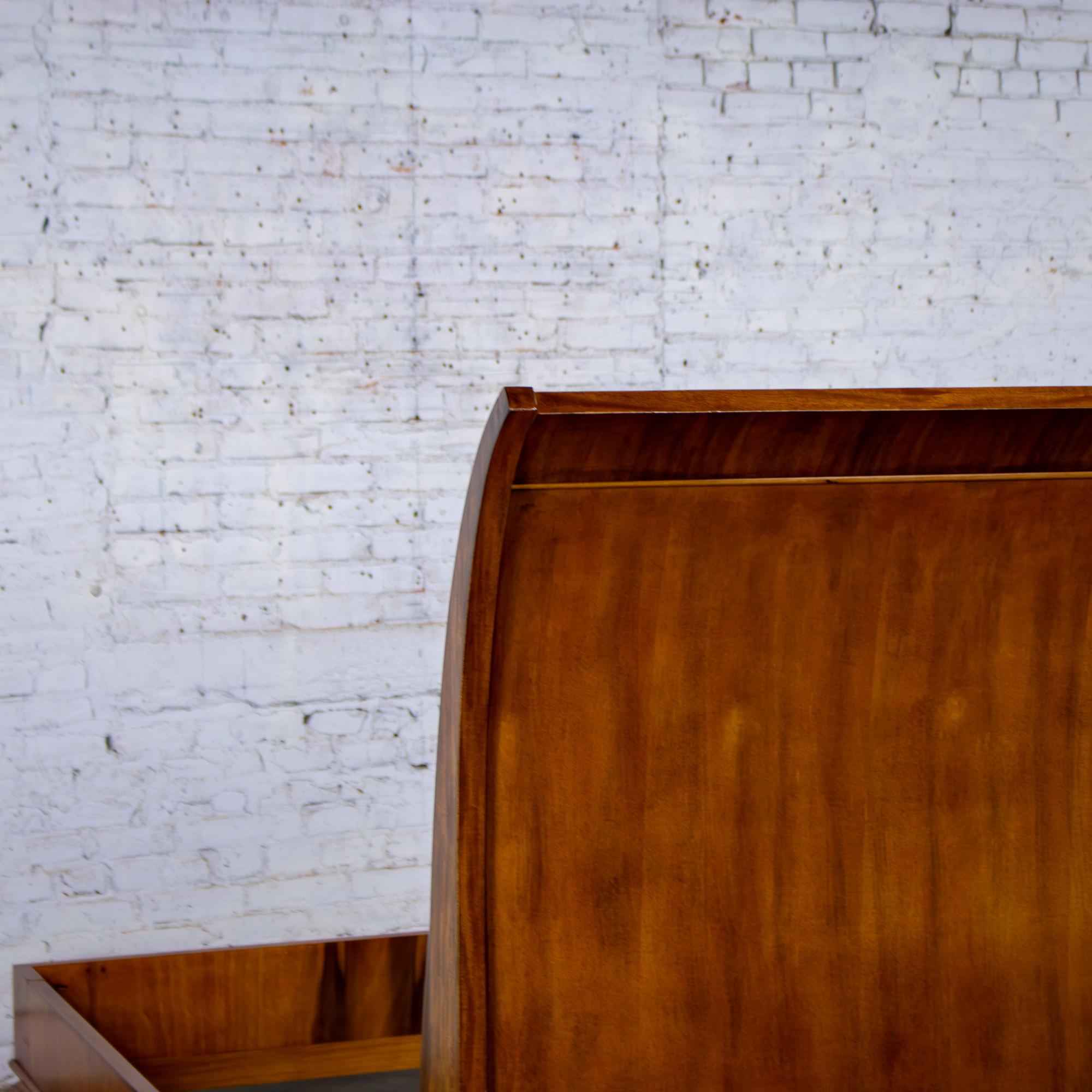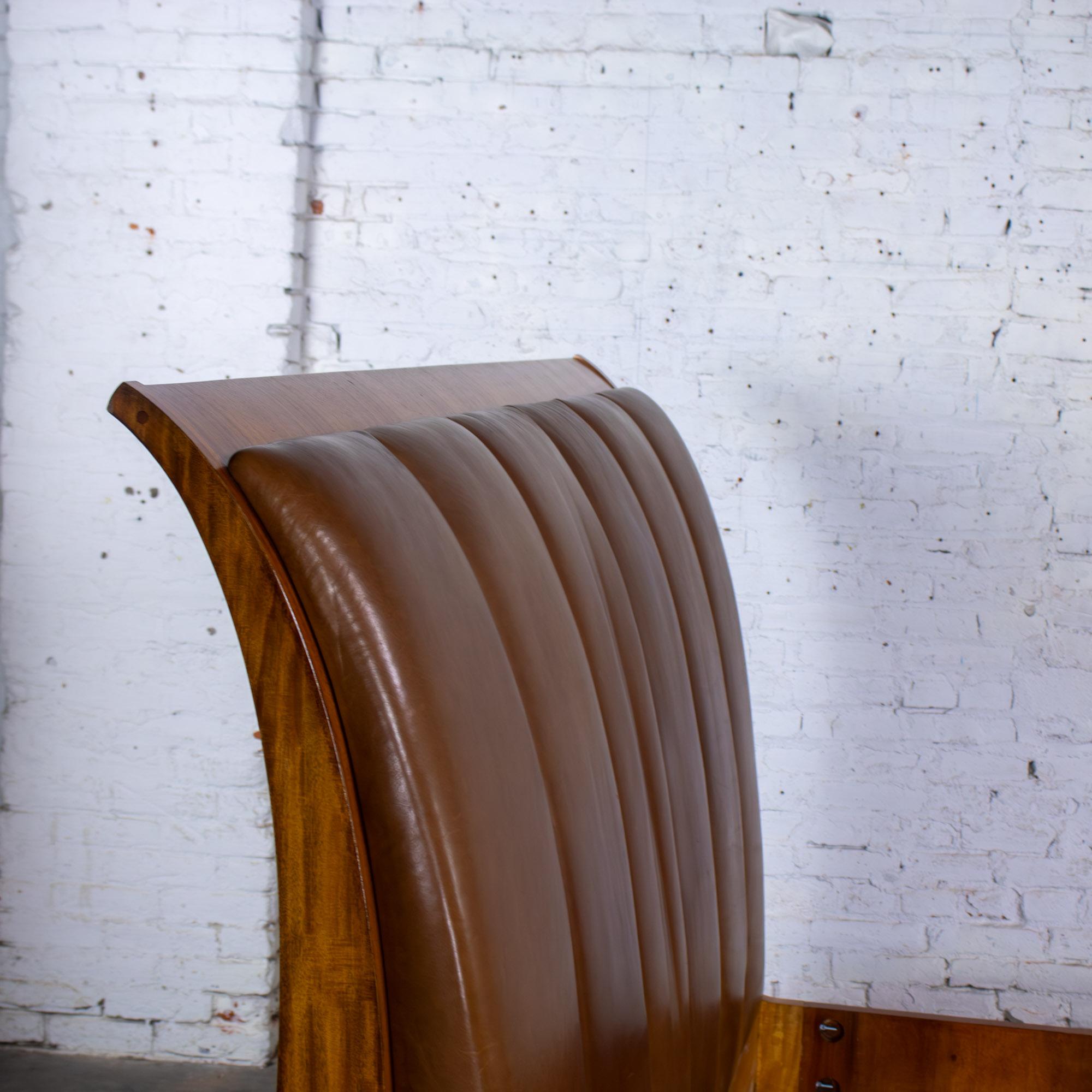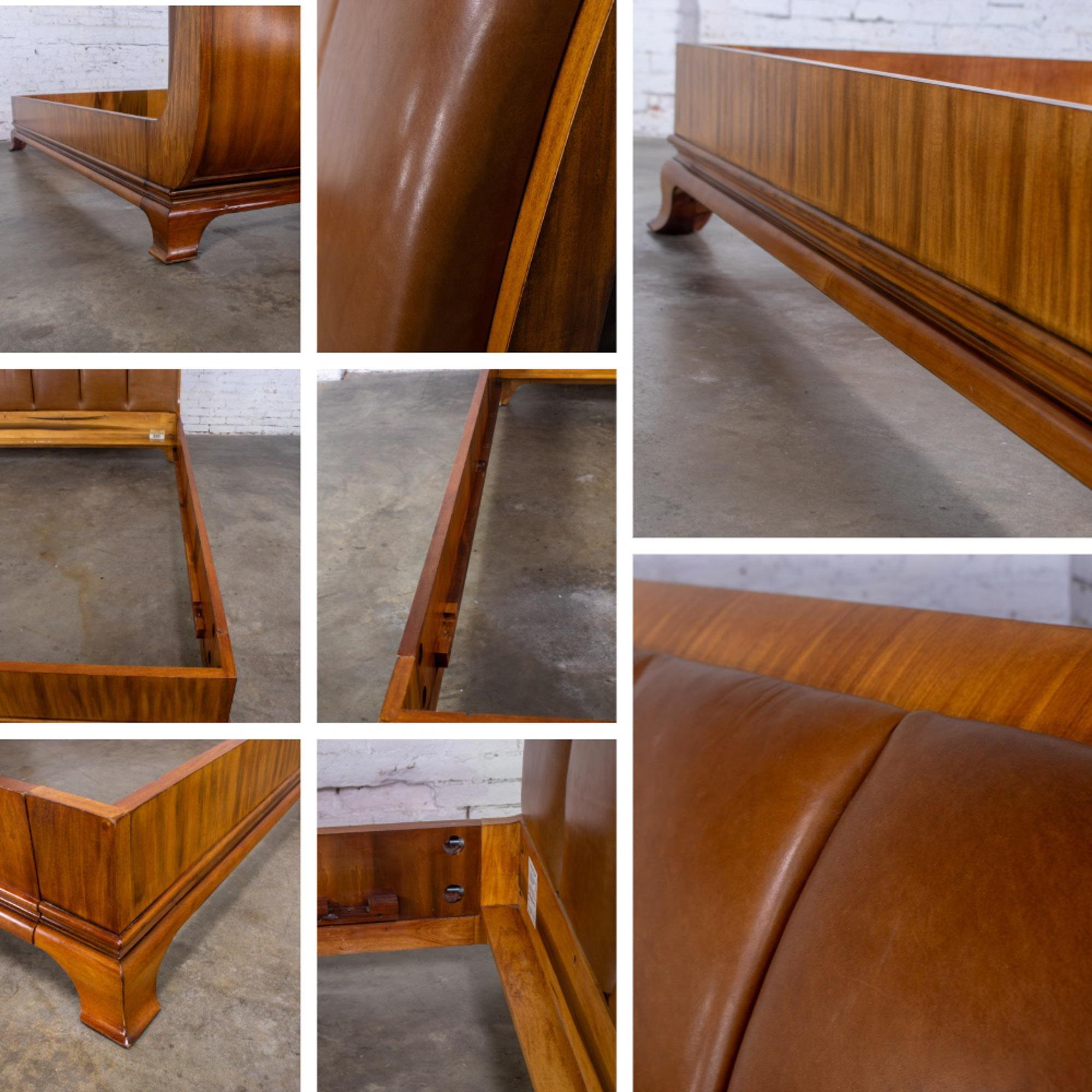 This Henredon Arbus king sized bed absolutely…. SLAYS!!! Quite literally!!! LOL… This is a GORGEOUS king sized sleigh bed by Henredon Arbus 6000 Series composed of a beautiful book matched burl wood low-profile frame featuring a curved headboard handsomely upholstered in a fantastic channeled chocolate leather. And the attractive-ness doesn’t end with the front of the bed!! This is an all-over beauty!!! The footboard, side rails, & back of the headboard are exquisitely finished bearing a stunning wood grain so, it will float fabulously in any space or conveniently divide your sleeping area from your sitting room… a fantastic option for studio apartments or open concept rooms. Just drop in your own king-sized mattress and you are ready to comfortably snooze in SUPREME style!!! So, you may notice in the photographs that it has a stubborn crease in one of the leather panels. Something leaned against it for a while and it isn’t responding to our usual methods so, we photographed it for listing purposes but we are still working on getting that crease out! It stands BOLD & BEAUTIFULLY upon four slightly splayed feet and exudes an incredible Neoclassic Revival presence sure to make a transformative statement to your bedroom or floating in whatever room it occupies!!!! Your night of slumber just became next-level SPECTACULAR!!!!