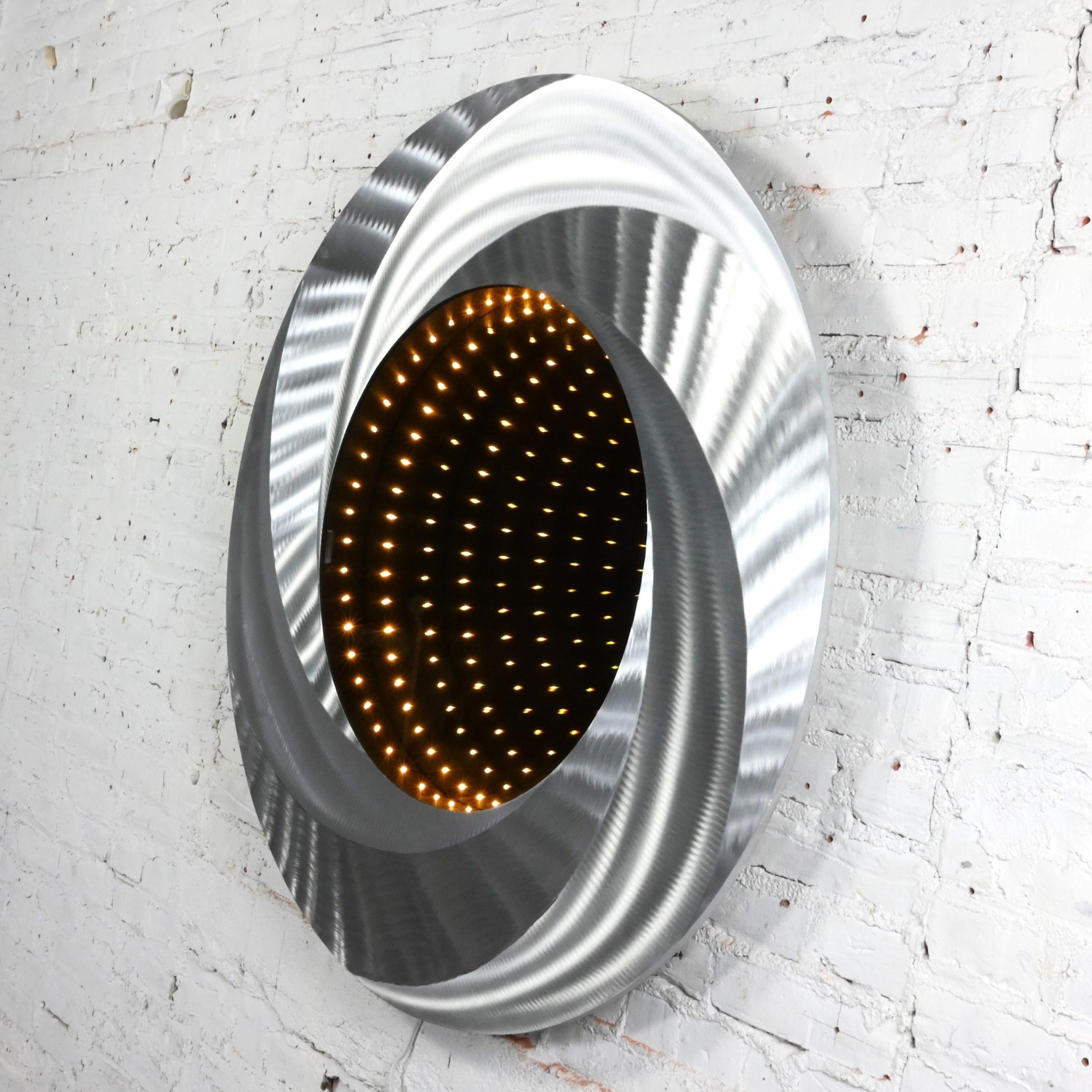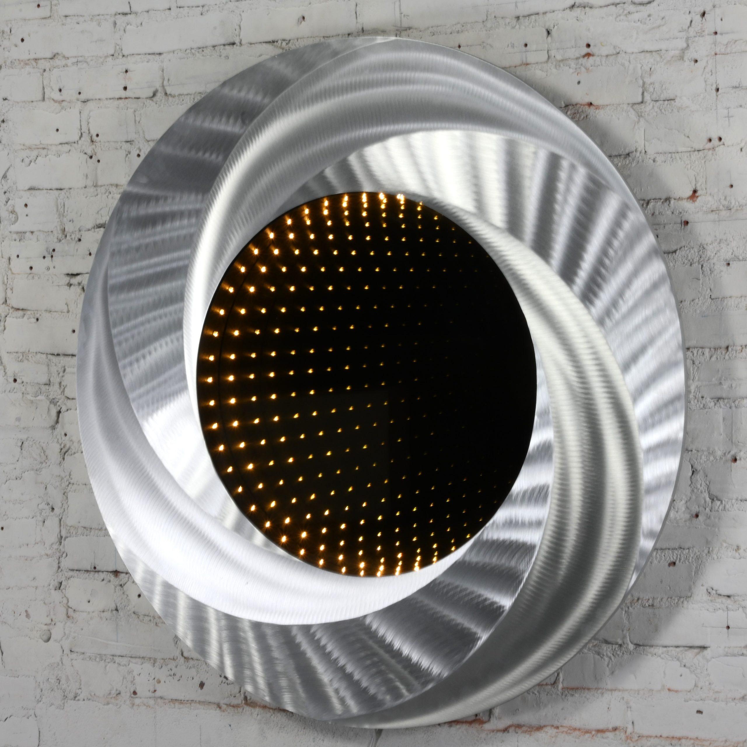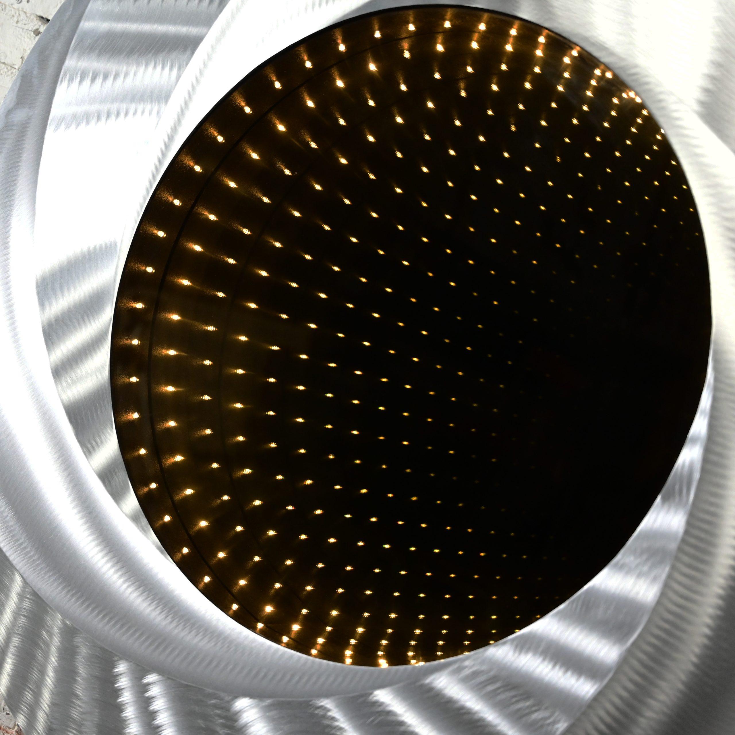 “TO INFINITY….. and BEYOND!!!!!!” Buzz Lightyear couldn’t have said it better!!! This is an intoxicating Late 20th to Early 21st Century Modern Infinity vortex wall mirror round with a brushed aluminum frame and infinity lights that seem to tunnel into your wall into the depths of the distant beyond, the effect is certainly quite captivating!! The brushed aluminum frame swirls around the round center mirror creating depth, texture, and intensity. It is mounted upon an MDF wood substrate ready to ascend upon a wall in any room that needs a bit of eternal, ever-lasting beauty. It will be exquisite almost anywhere, but, because of its phenomenal lighting feature, it would be particularly lovely used as a vanity mirror, in your bedroom, your dressing area, or in a bathroom over a pedestal sink. Talk about versatility!! Infinity mirrors use LEDs to create an illusion of depth and space in a room. The effect is both mesmerizing and calming, and they can make any room feel larger than it is. So, if your space is a bit limited, this is exactly what your wall needs!!! The definition of infinity is … “the concept of something that is unlimited, endless, or without bound.” Well, there you have it… Everything this mirror has!! Unlimited possibilities, Endless beauty, and an alluring style with NO BOUNDS. So…What’s the hesitation??? Don’t let this brushed aluminum infinity vortex wall mirror get lost in space…. Make it YOURS!!!!!