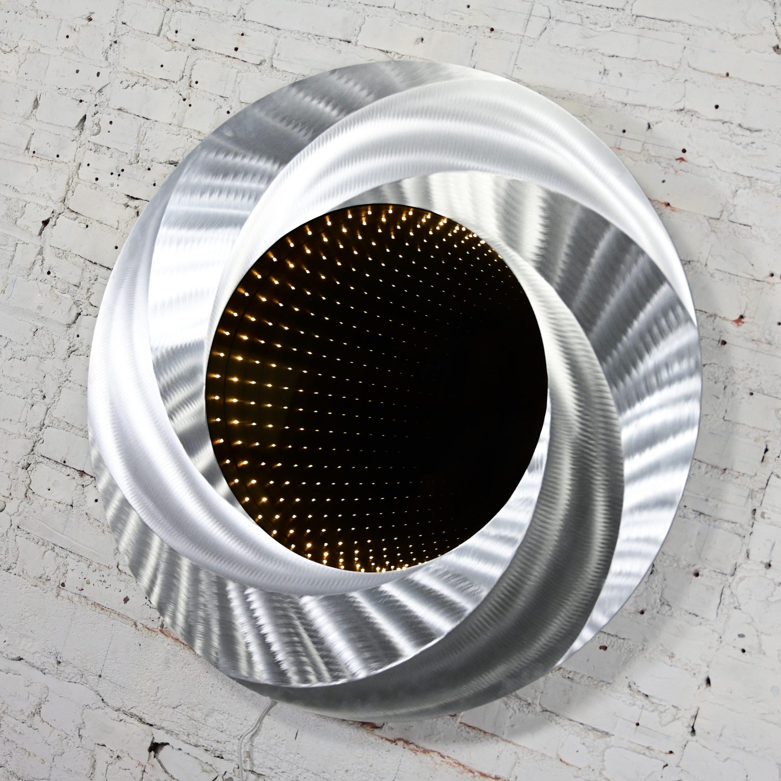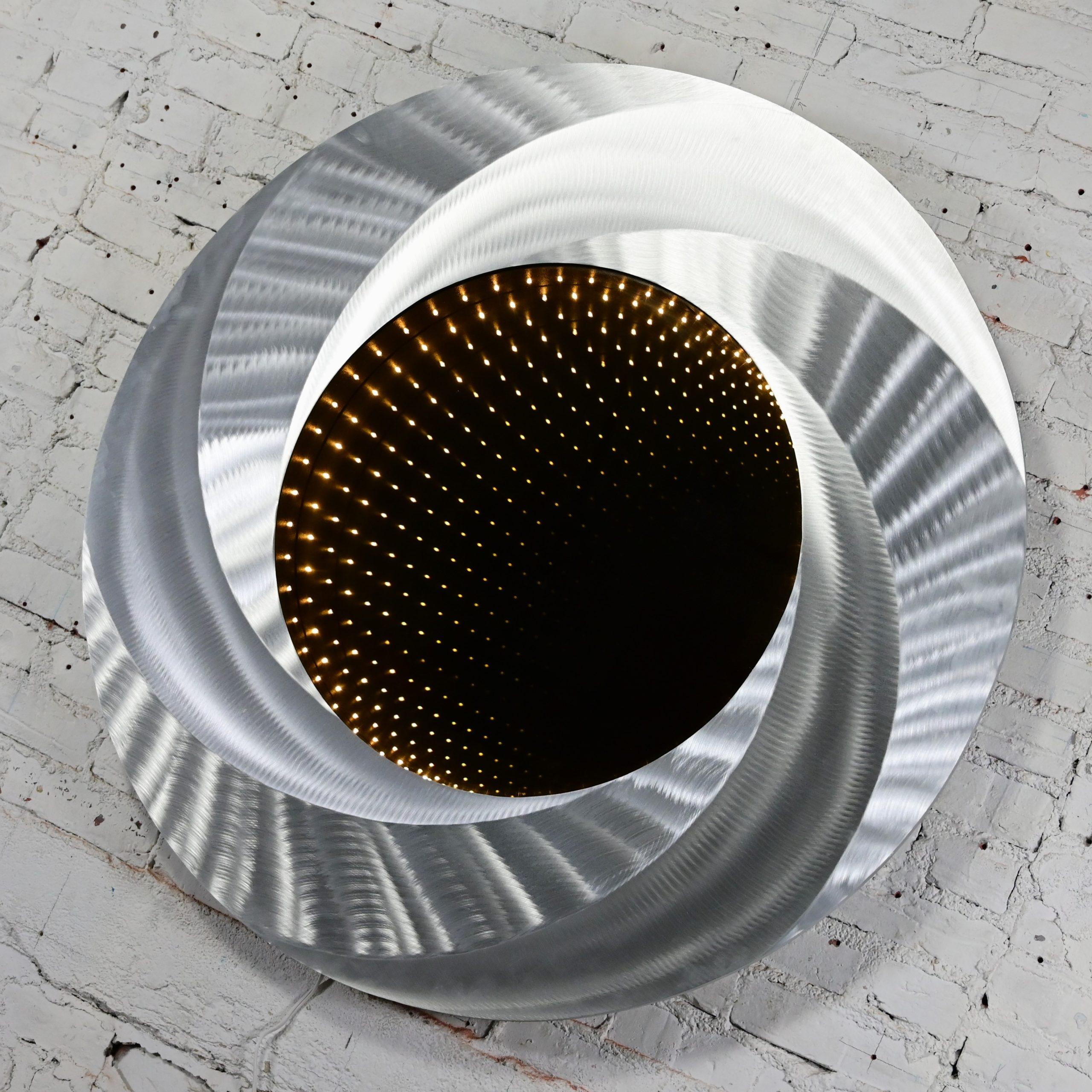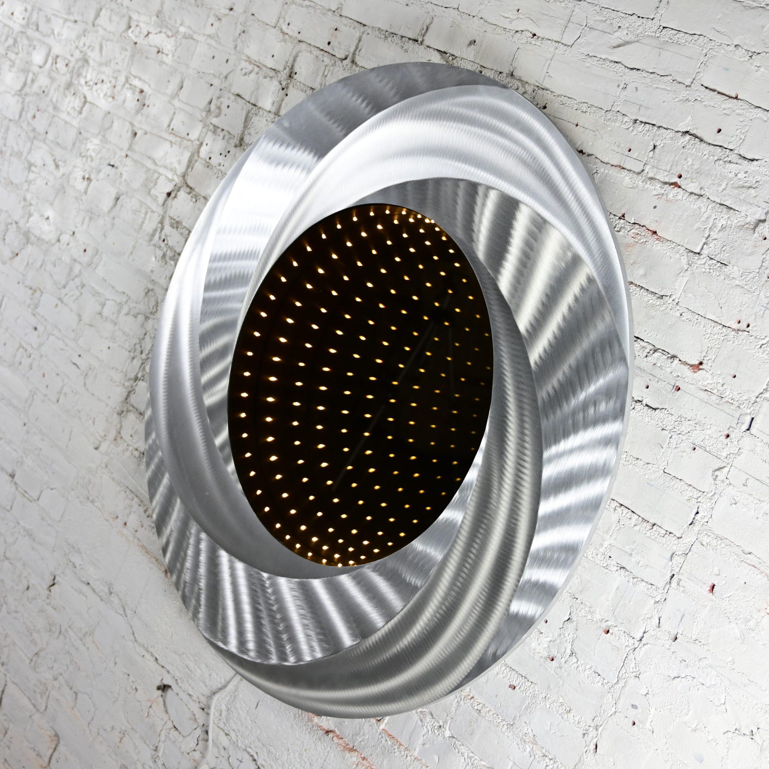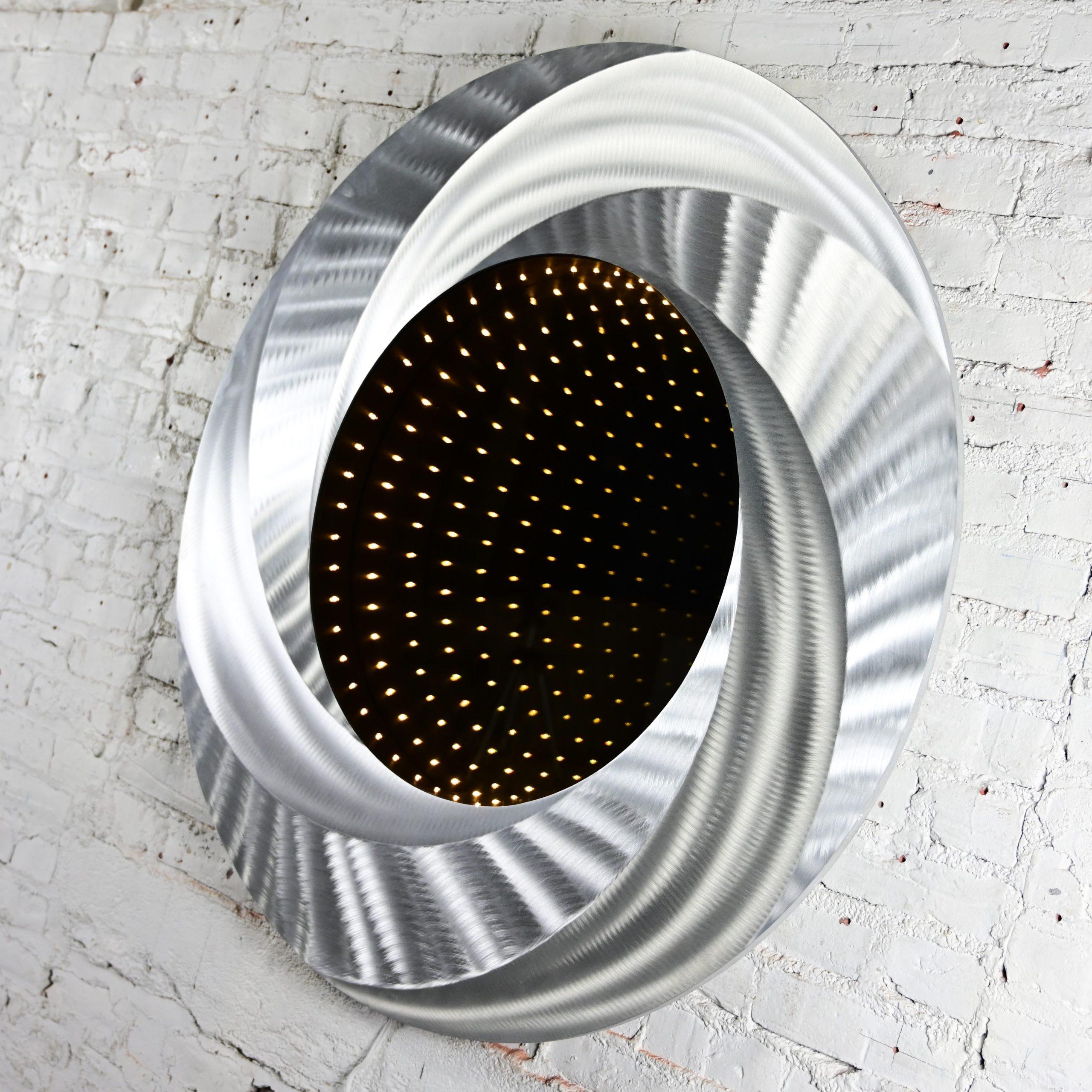 “TO INFINITY….. and BEYOND!!!!!!” Buzz Lightyear couldn’t have said it better!!! This is an intoxicating Late 20th to Early 21st Century Modern Infinity vortex wall mirror round with a brushed aluminum frame and infinity lights that seem to tunnel into your wall into the depths of the distant beyond, the effect is certainly quite captivating!! The brushed aluminum frame swirls around the round center mirror creating depth, texture, and intensity. It is mounted upon an MDF wood substrate ready to ascend upon a wall in any room that needs a bit of eternal, ever-lasting beauty. It will be exquisite almost anywhere, but, because of its phenomenal lighting feature, it would be particularly lovely used as a vanity mirror, in your bedroom, your dressing area, or in a bathroom over a pedestal sink. Talk about versatility!! Infinity mirrors use LEDs to create an illusion of depth and space in a room. The effect is both mesmerizing and calming, and they can make any room feel larger than it is. So, if your space is a bit limited, this is exactly what your wall needs!!! The definition of infinity is … “the concept of something that is unlimited, endless, or without bound.” Well, there you have it… Everything this mirror has!! Unlimited possibilities, Endless beauty, and an alluring style with NO BOUNDS. So…What’s the hesitation??? Don’t let this brushed aluminum infinity vortex wall mirror get lost in space…. Make it YOURS!!!!!