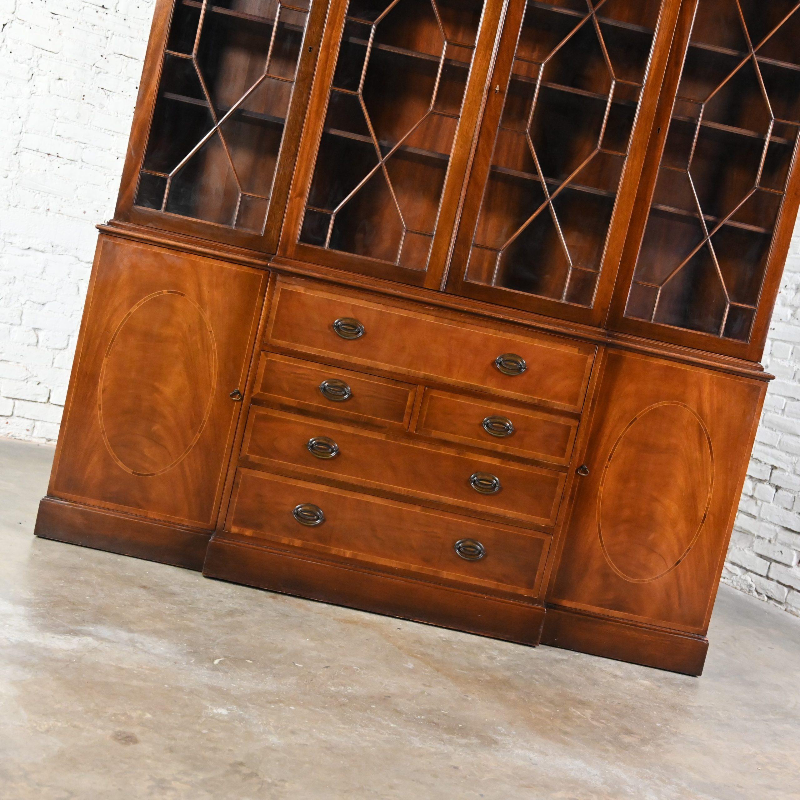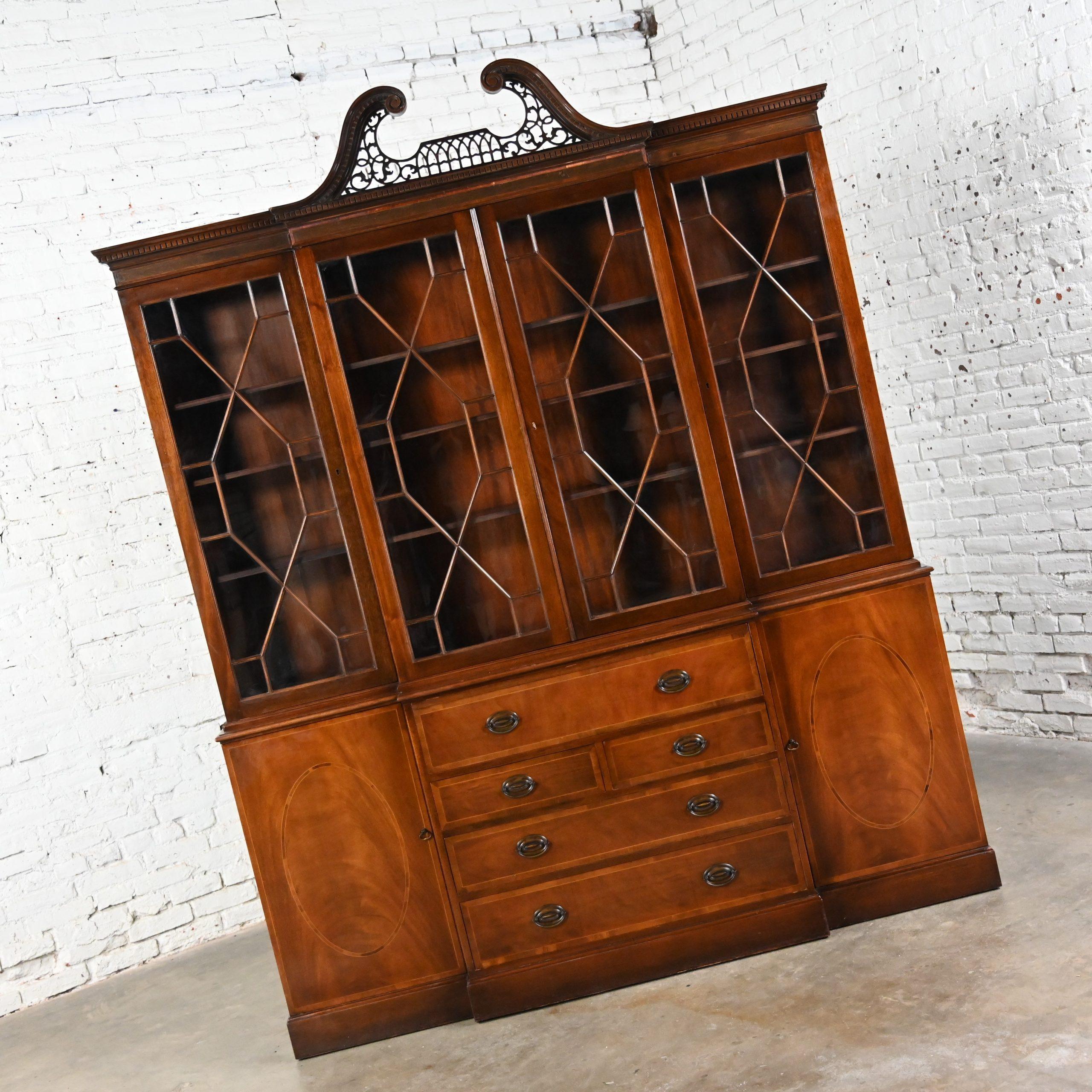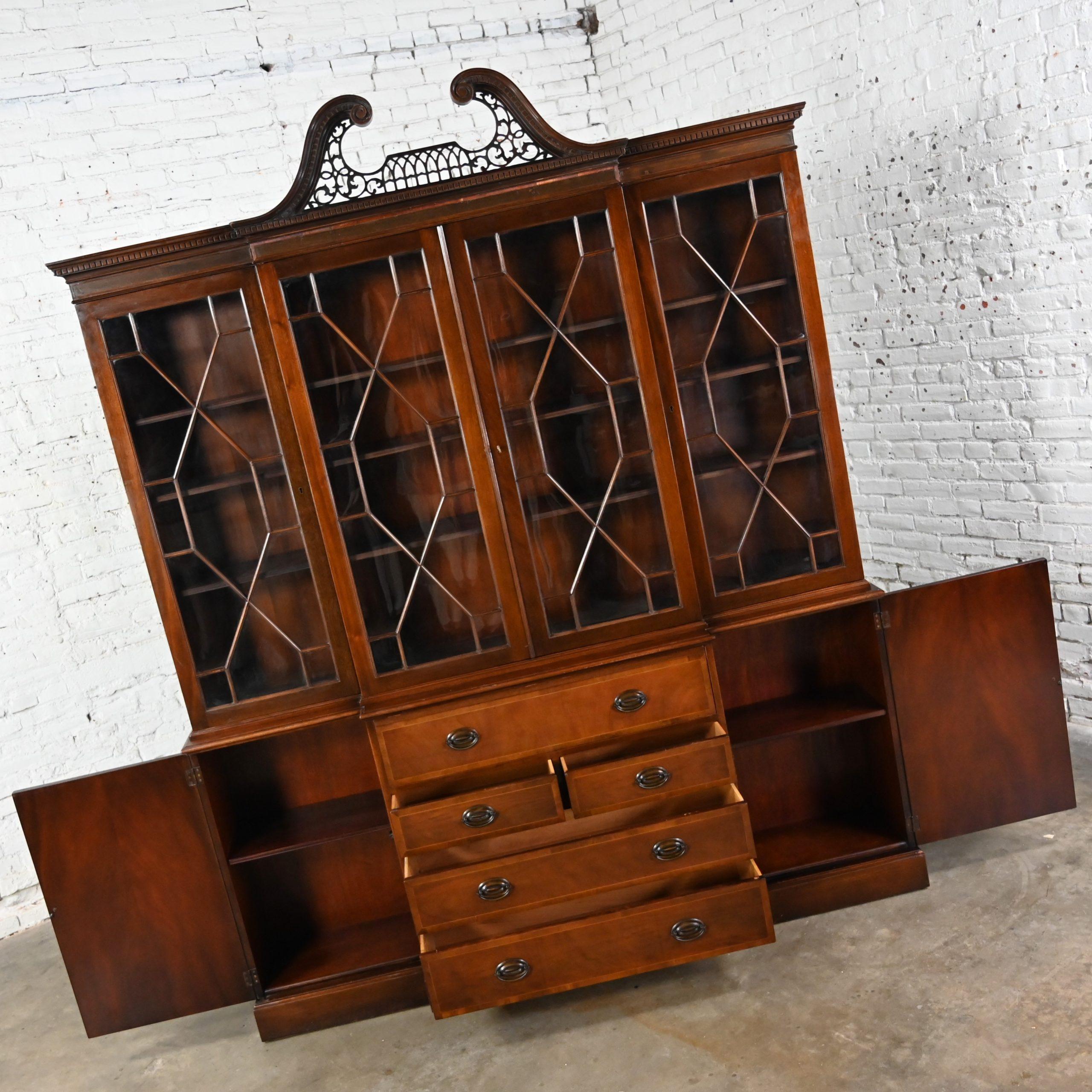 BIG, BEAUTIFUL, and the BEST of BAKER FURNITURE!!!! This is a massive and quite marvelous mahogany and walnut Chinese Chippendale China cabinet or bookcase with a breakfront & drop-down secretary in the top center of the lower buffet by Baker Furniture. The center section of the whole cabinet bumps out a bit in front of the two sides. For those that may not know, that’s what the “breakfront” feature is… The sides are recessed a bit behind the center section. Let’s discuss the top section of the cabinet first. The top is divided into three separate sections with three height adjustable wood shelves in each section. It features double doors in the center and two side doors with a skeleton key that works on all three top door openings. All the door fronts possess glass mullion doors with true divided lites. GORGROUS!! The center top of the cabinet is crowned with a gorgeous, pierced pediment detail and below, dental crown molding runs along the top edge all the way around. The entire top section rests upon the lower buffet. At first glance (when closed,) the lower cabinet appears to have four stacked drawers in the center BUT… it’s an illusion!! The top “drawer front” is actually a drop down door feature for the secretary desk. That door (when dropped and pulled out) doubles as the desktop which bears a beautiful brown leather surface with gold embossed edges and a built-in desk organizer with four slots and six smaller drawers for mail, office supplies, and storage. Directly below the secretary desk are three large drawers with brass Hepplewhite shield & bale pulls and an inlaid veneer border around each door edge. It has two side doors with burlwood door fronts and an inlaid oval in the veneer and drop pulls on each door. Behind each door is a non-adjustable wood shelf and although it is not height adjustable, it can be removed if you prefer. This colossal cabinet is technically in two separate pieces which is convenient for moving and shipping purposes. However, the buffet top is not finished, and it is not intended for use as two pieces. It is not only impressive in size but in versatility, purpose, and Chinese Chippendale magnificence!! Some call it Georgian while others call it Traditional but no matter, we call it FABULOUS!!! It is a beautifully crafted, highly functional piece of vintage furniture and it is going to be incredible in your family room or living room full of art & decor, in your dining area filled with fine China or vintage dishware, or in the study holding books, literature, and the ideal space to utilize the secretary. Possibilities are as endless as your imagination.