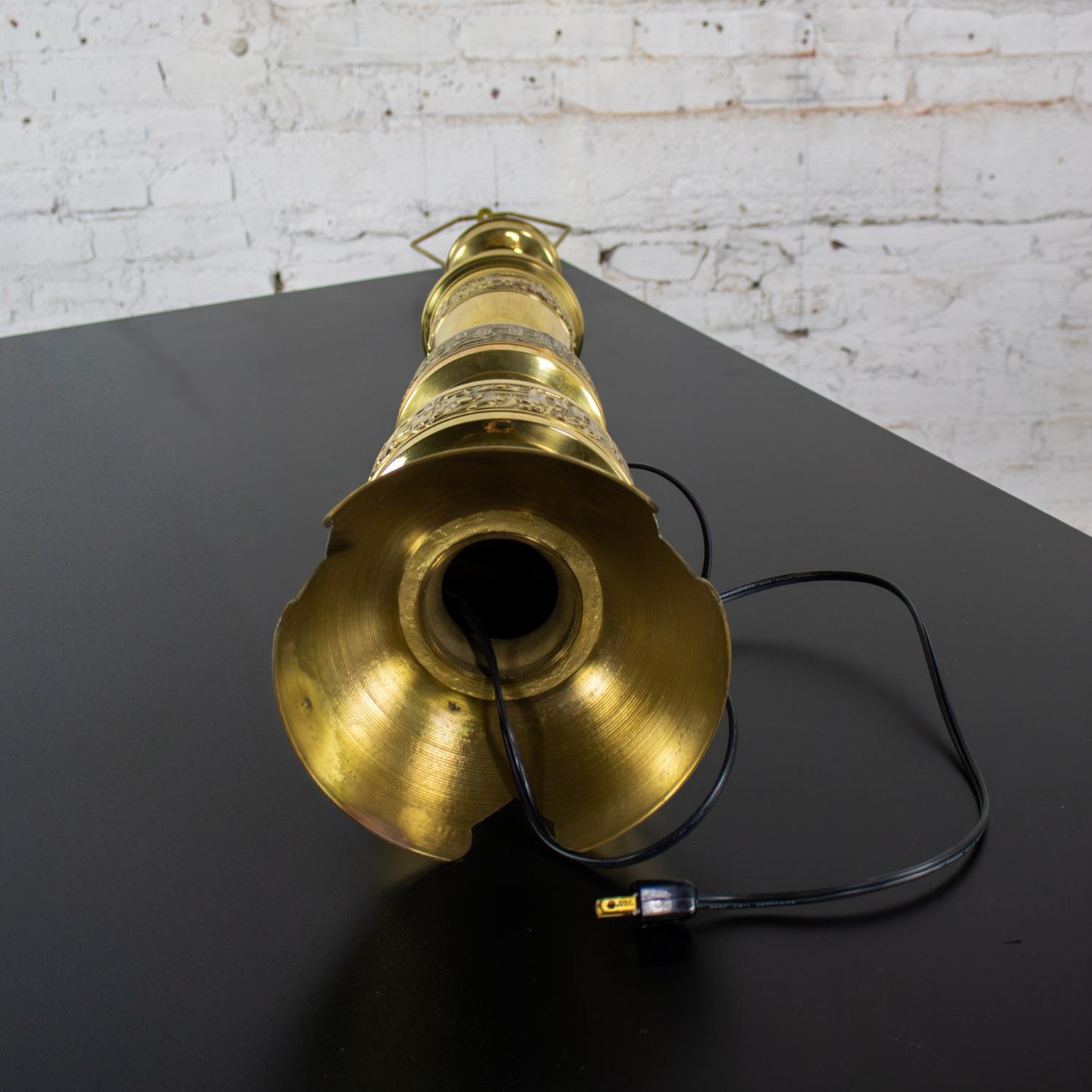 This lamp is BURSTING with Beautiful Cast Brass SASS!!!!!! WOW!!! This marvelous table lamp is corded & composed of a gorgeous cast brass body embellished with cast Asian details, a push switch on the socket, a dome style base, and it’s original off-white Damask silk-like soft fabric shade also bearing beautiful decorative Asian scenes! The three bulbous pieces that create the body are each separate pieces all held by a center shaft… very indicative of James Mont or Don Loper styles however, this one is not marked. But, no matter as it has such a magnificent presence and exhibits a Chinoiserie & Hollywood Regency style that will bring a Mid-20th Century elegance and charm to any room. Place it on a nightstand in your bedroom, on a sofa table in your living or family room, or maybe on a desk in your study and prepare yourself to be in awe of its awesome ambiance! This is EXACTLY the lamp you’ve been looking for! So, don’t let it go!!! Just do it… make it YOURS!!!