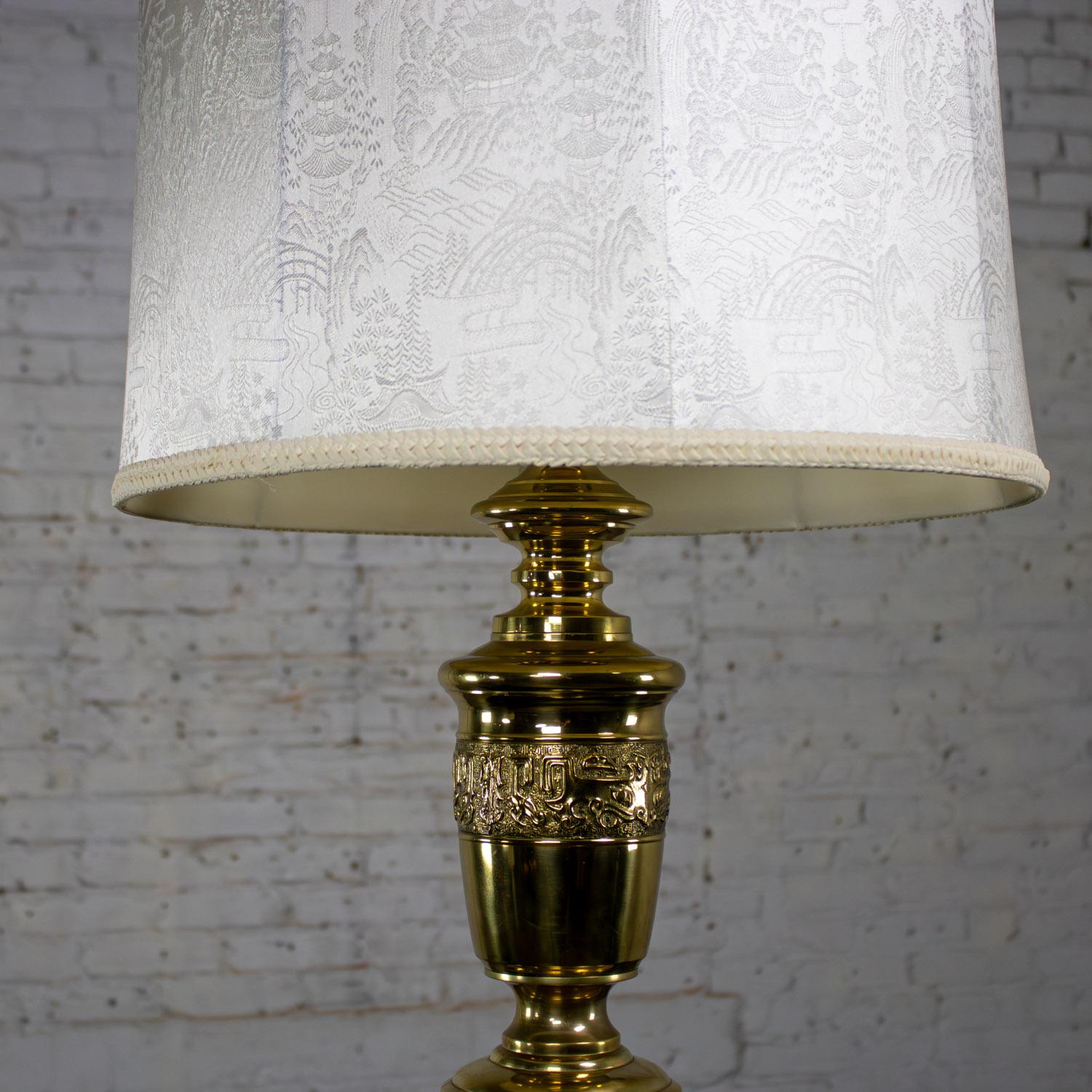 Mid-20th Century Chinoiserie Hollywood Regency Table Lamp Cast Brass w/Damask Fabric Shade