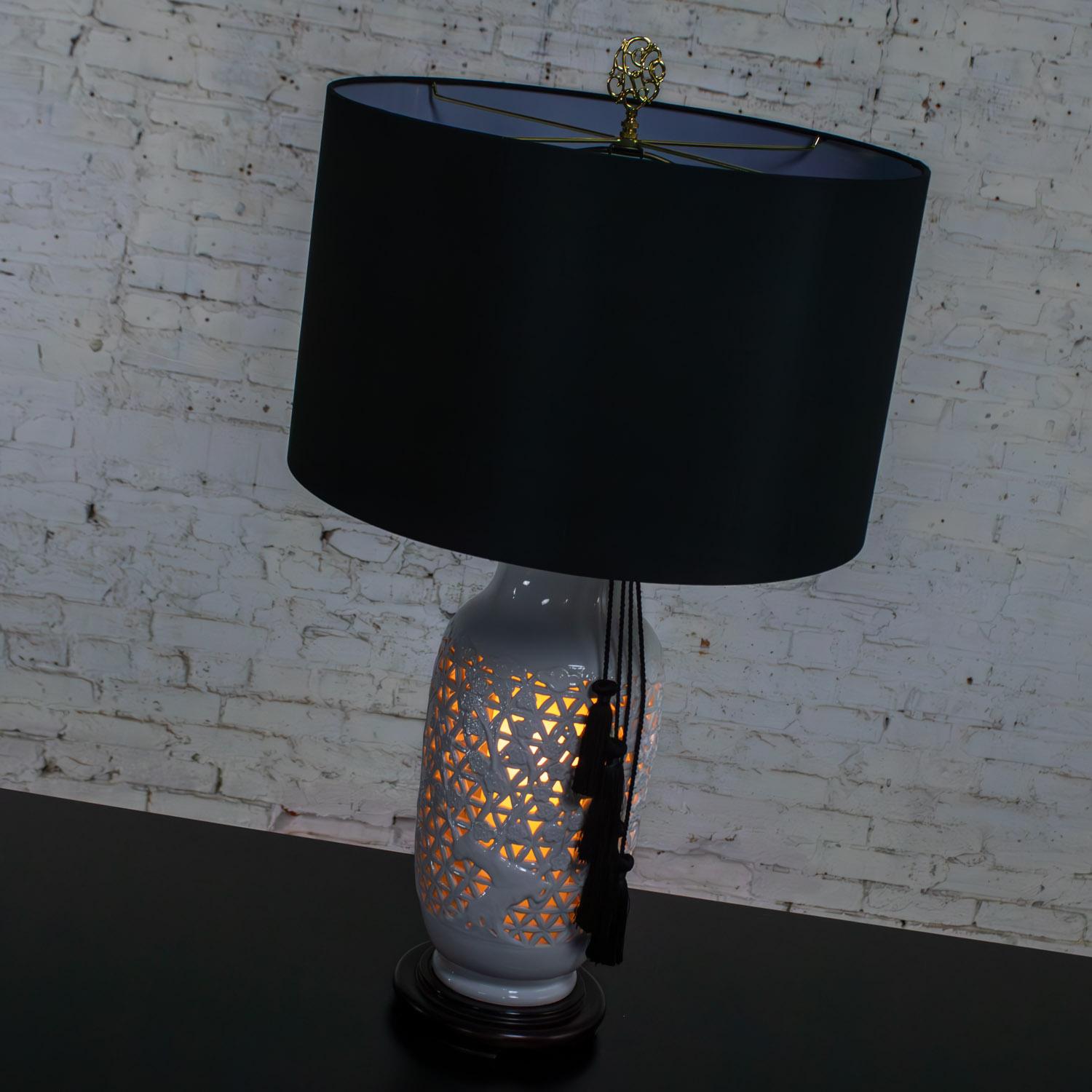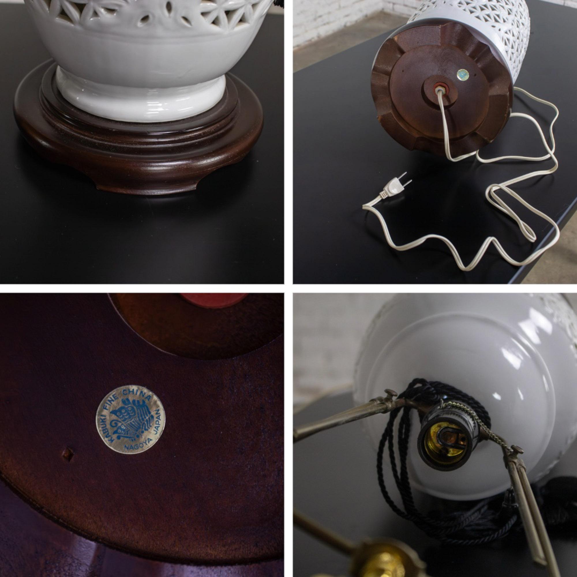 Impeccable Mid-20th Century Chinoiserie white pierced porcelain Blanc De Chine table lamp by Kabuki Fine China in Nagoya Japan, shade not included (unless you want the damaged white one let us know). Beautiful condition, keeping in mind that this is vintage and not new so will have signs of use and wear even if it has been refinished or restored. No outstanding flaws detected. Please see photos, zoom in for details, and see long description as they are part of the condition report. We attempt to portray any imperfections. Circa, Mid-20th Century.