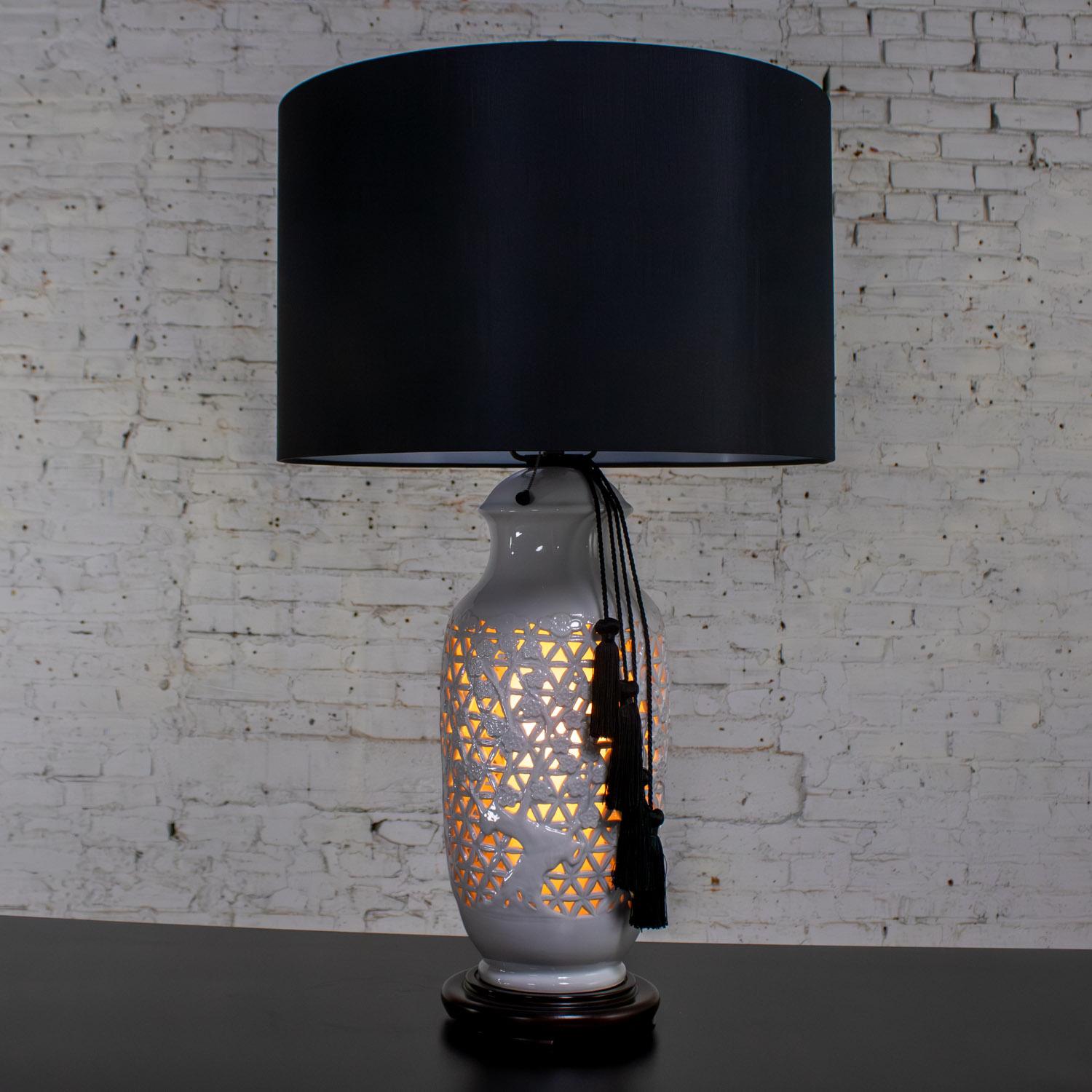 “You have to find what sparks a light in you so that you, in your own way, can illuminate the world.” -Oprah Winfrey. Well friends, consider yourself SPARKED!!! This is an absolutely STUNNING table lamp composed of a lovely white pierced porcelain Blanc De Chine body with a domed top bearing beautiful floral details, possibly cherry blossoms within the intricate pierced details, and a deep brown disc shaped wood base. And, although we have some photographs of it wearing a black drum shade & its white original damaged shade, they are not included in the purchase (unless you want the damaged one!). That gives you LIMITMESS shade purchasing options!!! Did you know… “Blanc de Chine” translates to “white from China” and refers to a type of white Chinese porcelain originally made in Dehua, a town in China’s southeast coast. The popularity of Blanc de Chine influenced potters from other countries to develop their own hard white porcelains such as these from Kubuki Fine China in Nagoya Japan. Dehua still thrives as a porcelain town today!! COOL!! This marvelous table lamp bears a delicate beauty with a sophisticated aura and is sure to deliver just the right ambiance and brilliance to whatever room it is placed. It would be beautiful in your bedroom upon a nightstand, in a sitting room on an accent table, in the study on a desk, or in the living room on a fabulous lamp table. This is Chinoiserie style at its FINEST folks! Don’t lose that spark…. Make it YOURS!!!