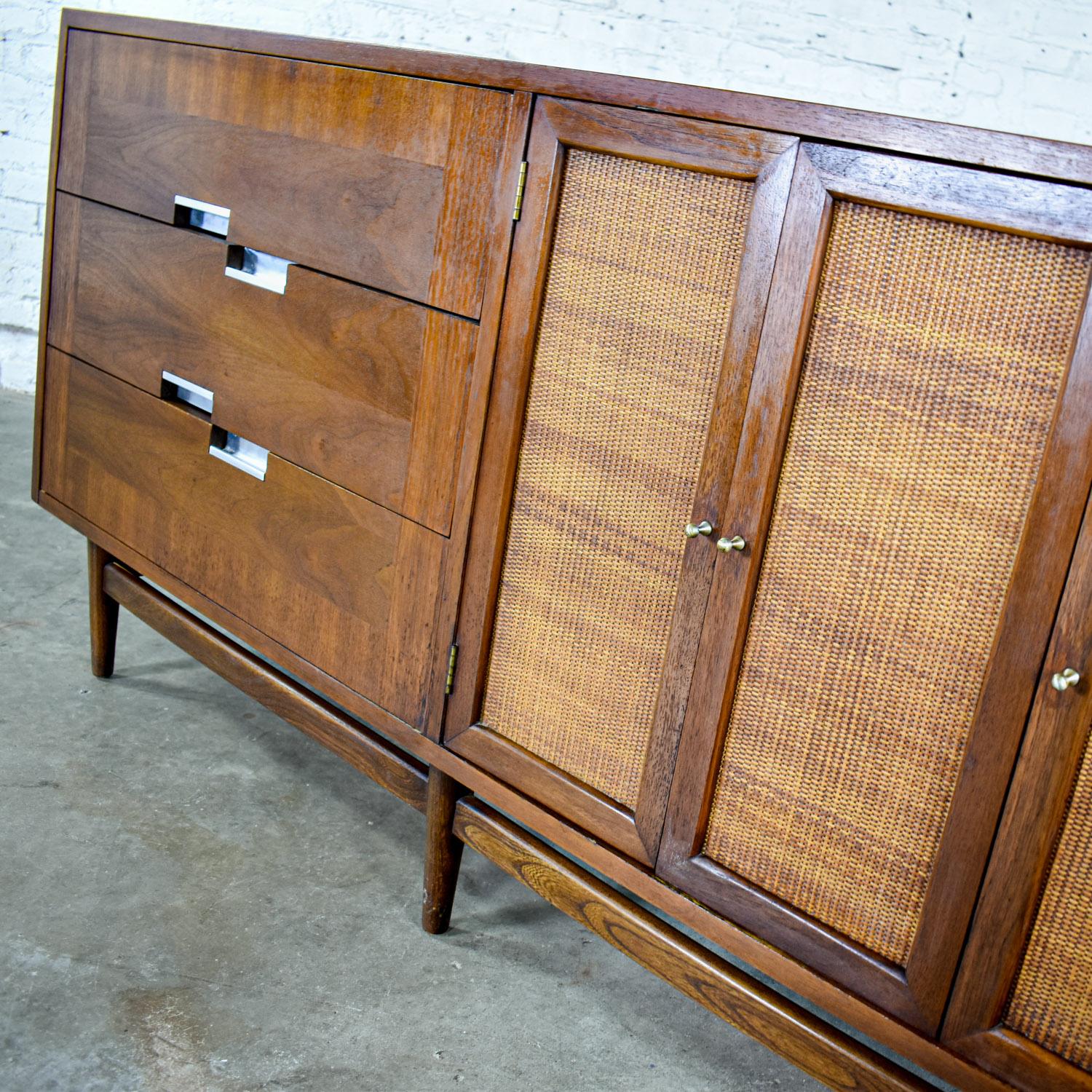Oh my! If you could ever say X marks the spot for a piece of furniture…you can say it with this PHENOMENAL dresser or buffet!!!! This incredible piece is from the Accord collection produced in the mid-20th century by American of Martinsville and designed by Merton Gershun. It is composed of a wonderful walnut frame with a bank of three drawers on one side and three doors on the other side with fantastic cane door fronts and marvelous little metal knob pulls. One door opens to the left and the other two bi-fold doors open to the right revealing three interior wood drawers. And, Note… the signature aluminum X’s or crosses in the top corners, the handsome recessed base with straight round tapered legs & horizontal stretchers… and just STOP IT with the astonishing asymmetric or staggered aluminum handles!!! OK… we have a dilemma/debate!! We came across the original 1957 catalog for the Accord Collection and in that catalog, they refer to the inlays and hardware as pewter-like metal… and we have always thought they were aluminum. Still kind of do. But we will throw that ball in your court as the debate around here was inconclusive and either way… they are GORGEOUS!!! Maybe you aren’t in need of a dresser at this time but still love the presence of this piece?? No Problem!!! It would serve beautifully in a dining area, living room, or study utilized as a buffet, credenza, or storage cabinet. It is a versatile, functional, high-quality piece with a reputable maker and it’s nothing short of MAGNIFICENT!!