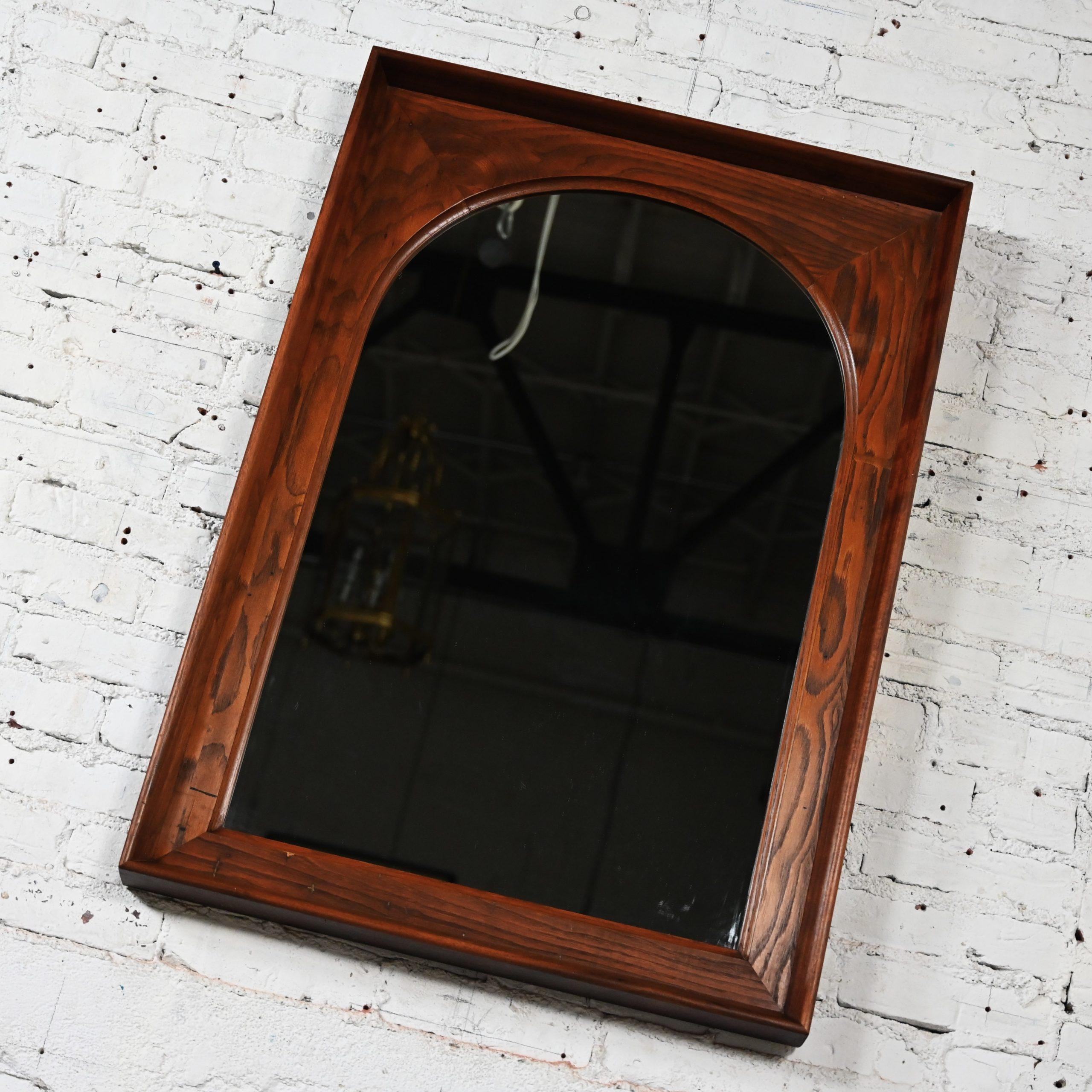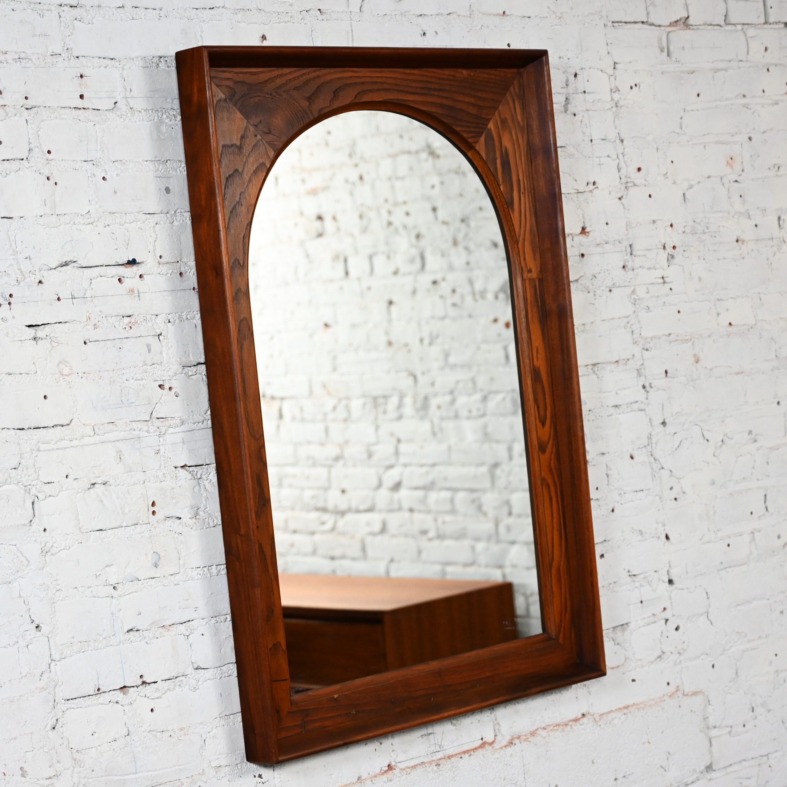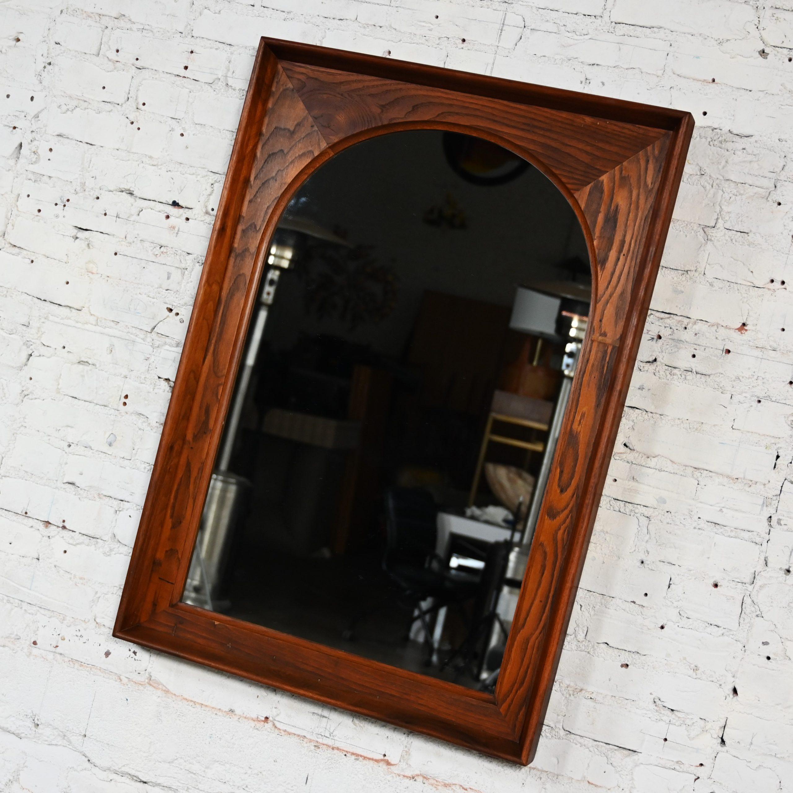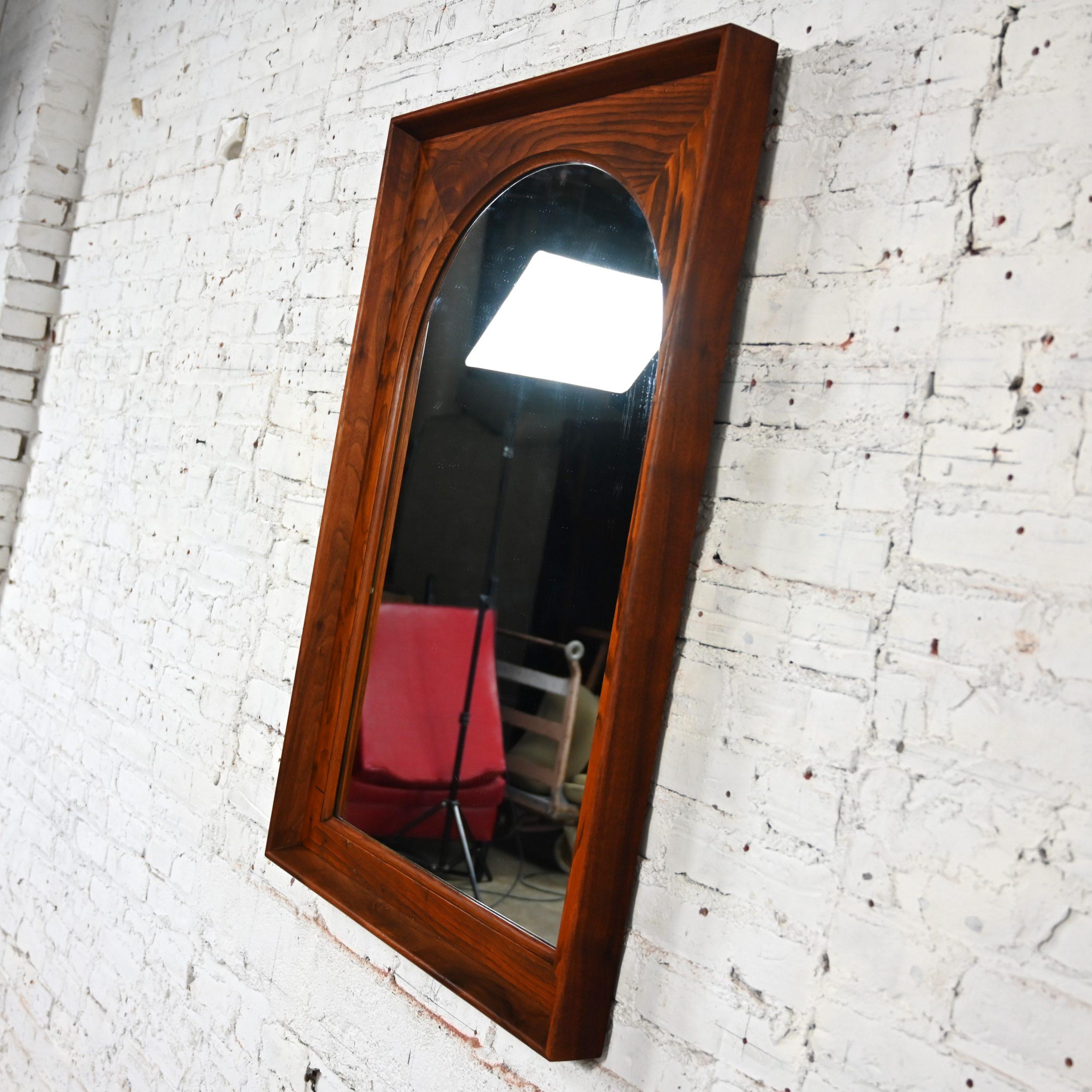 While there are plenty of mirrors in this world… occasionally you come across a vintage mirror with style that presides over the others…like this marvelous framed arch mirror by Dillingham Manufacturing Company. We searched high and low for a line or an artist to credit on this piece but sadly, to no avail… but no matter… it is incredible regardless!!! The mirror is arch shaped surrounded by a rectangular rustic pecky cypress backing trimmed with a walnut outer rim. Talk about GORGEOUS!!!! It would be wonderful in a dressing room, over a desk or vanity, in your bathroom over a pedestal sink, in a hall or entry way. It is full of versatility and bears a timeless style sure to make a profound statement in any room you choose! This is a classic beauty with a stunning Mid-Century Modern presence that you are sure to love for years to come.