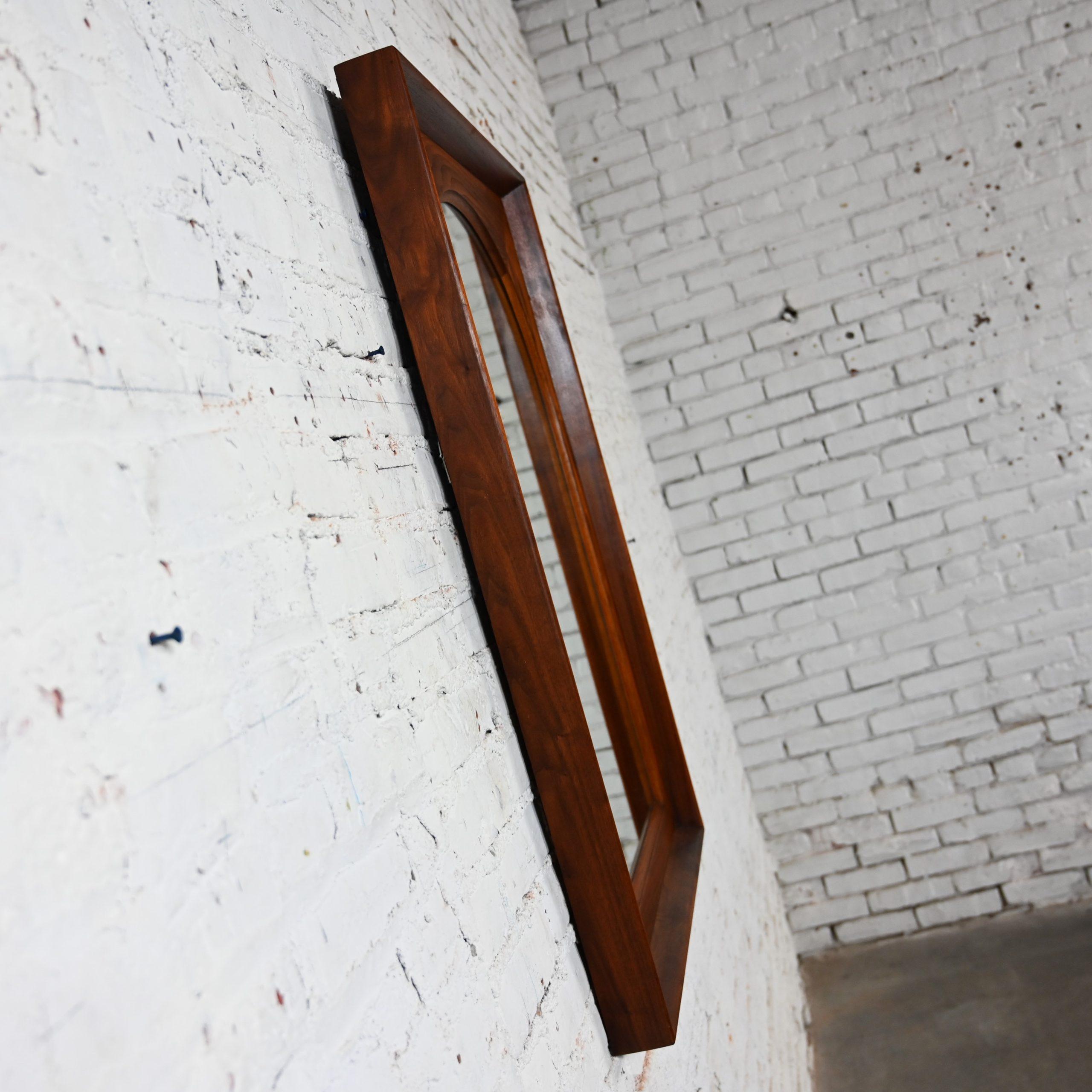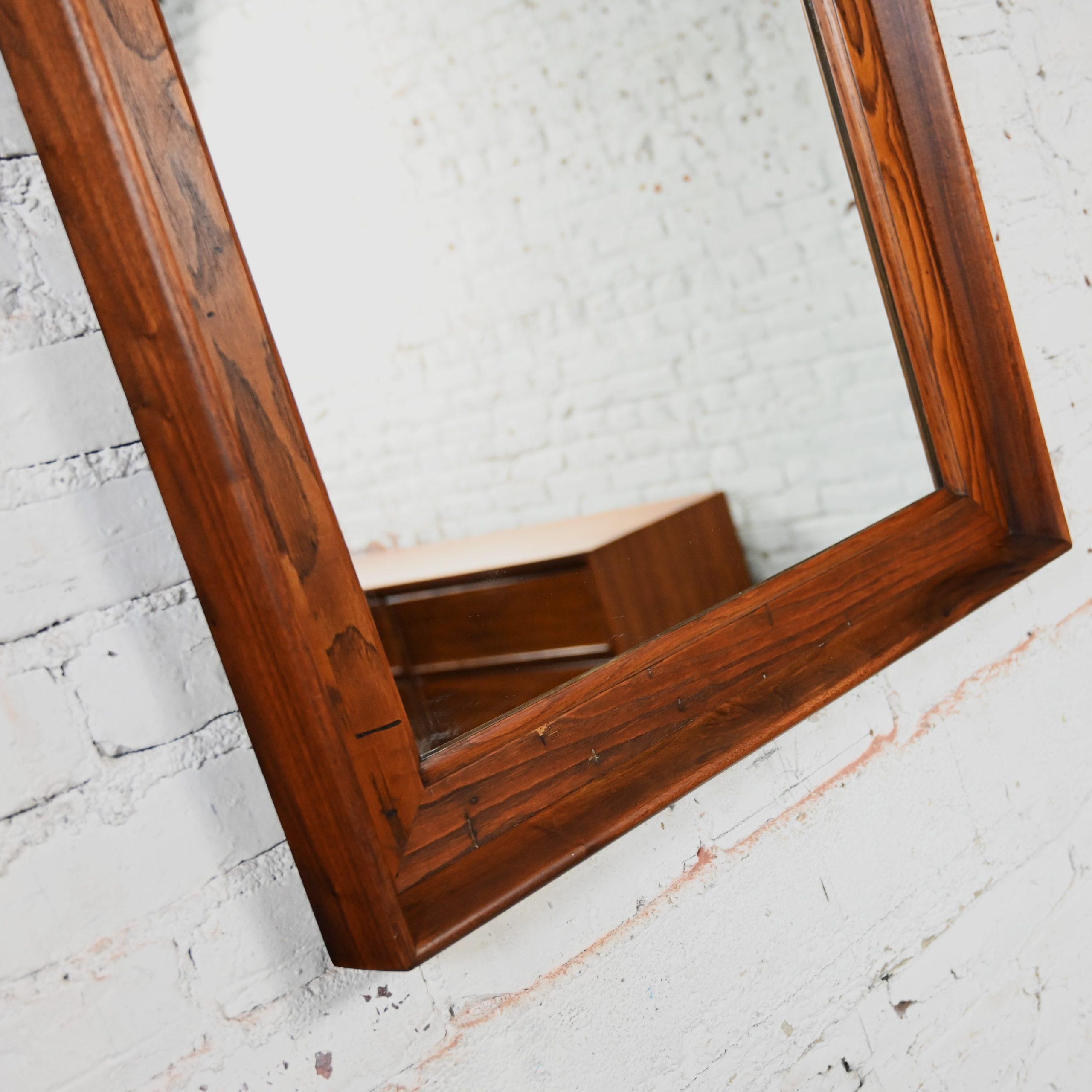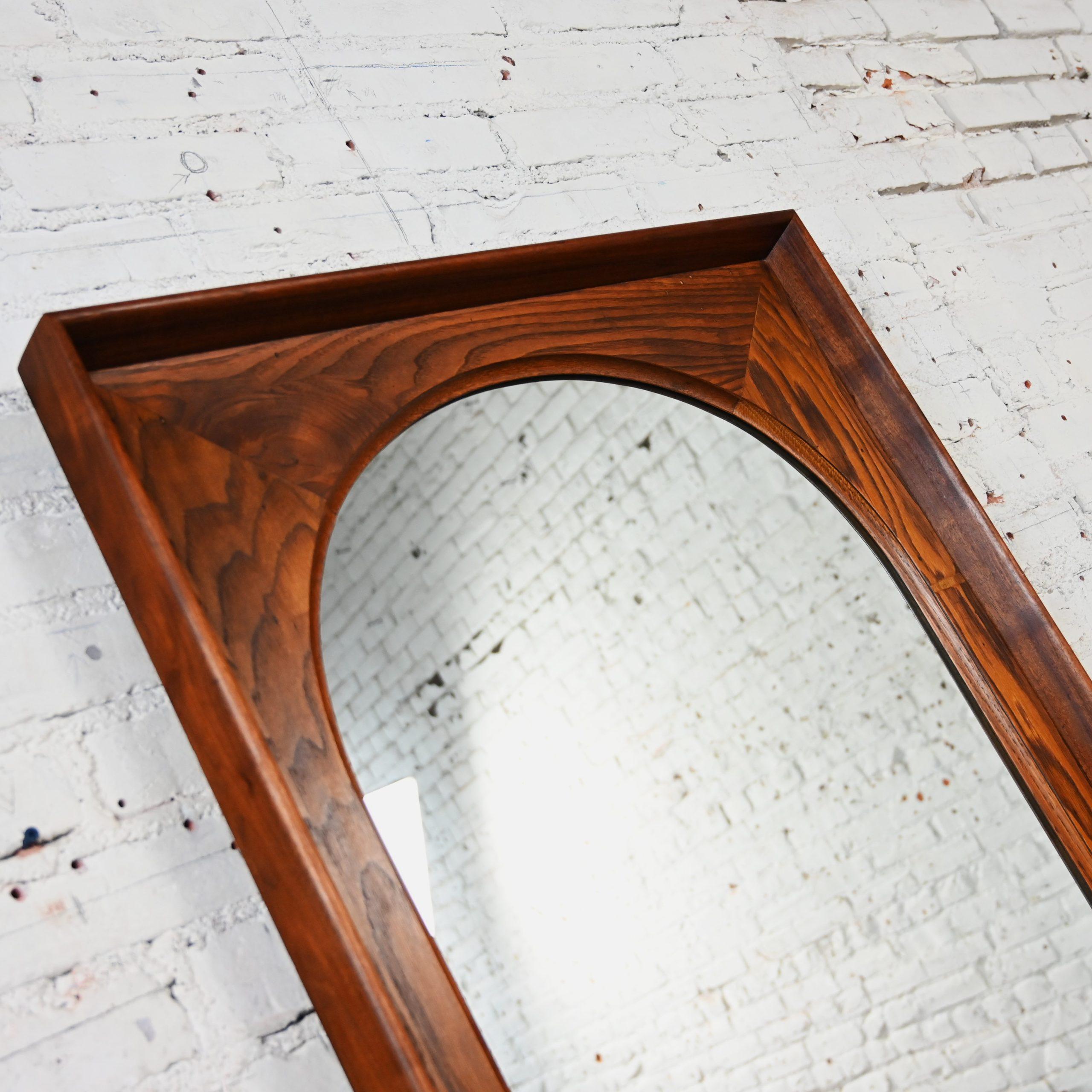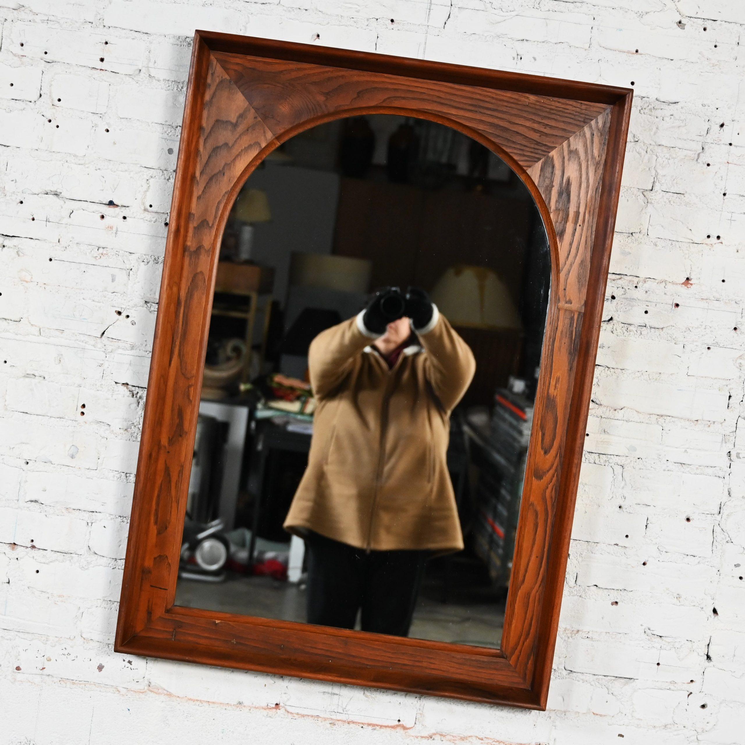 While there are plenty of mirrors in this world… occasionally you come across a vintage mirror with style that presides over the others…like this marvelous framed arch mirror by Dillingham Manufacturing Company. We searched high and low for a line or an artist to credit on this piece but sadly, to no avail… but no matter… it is incredible regardless!!! The mirror is arch shaped surrounded by a rectangular rustic pecky cypress backing trimmed with a walnut outer rim. Talk about GORGEOUS!!!! It would be wonderful in a dressing room, over a desk or vanity, in your bathroom over a pedestal sink, in a hall or entry way. It is full of versatility and bears a timeless style sure to make a profound statement in any room you choose! This is a classic beauty with a stunning Mid-Century Modern presence that you are sure to love for years to come.