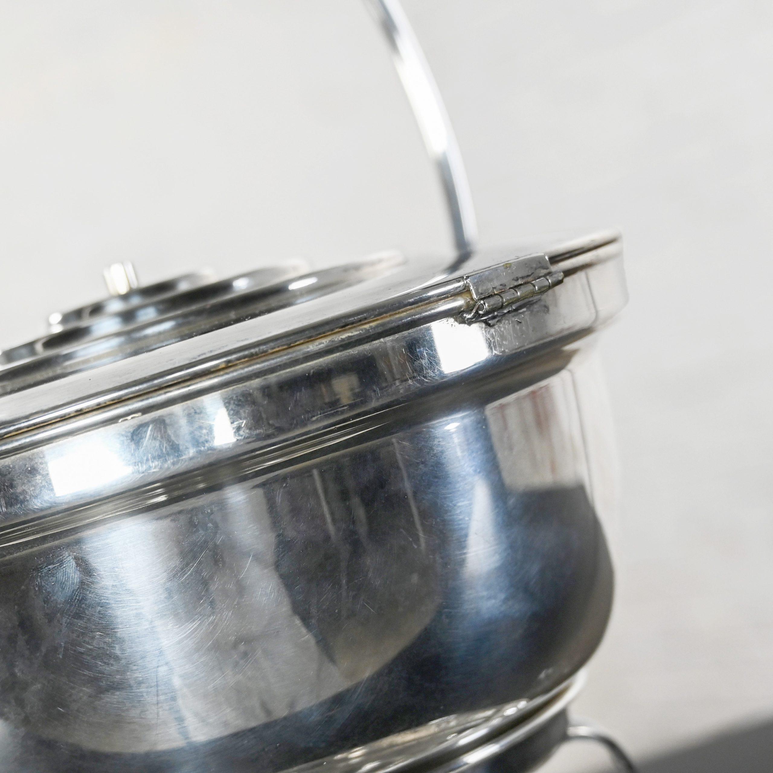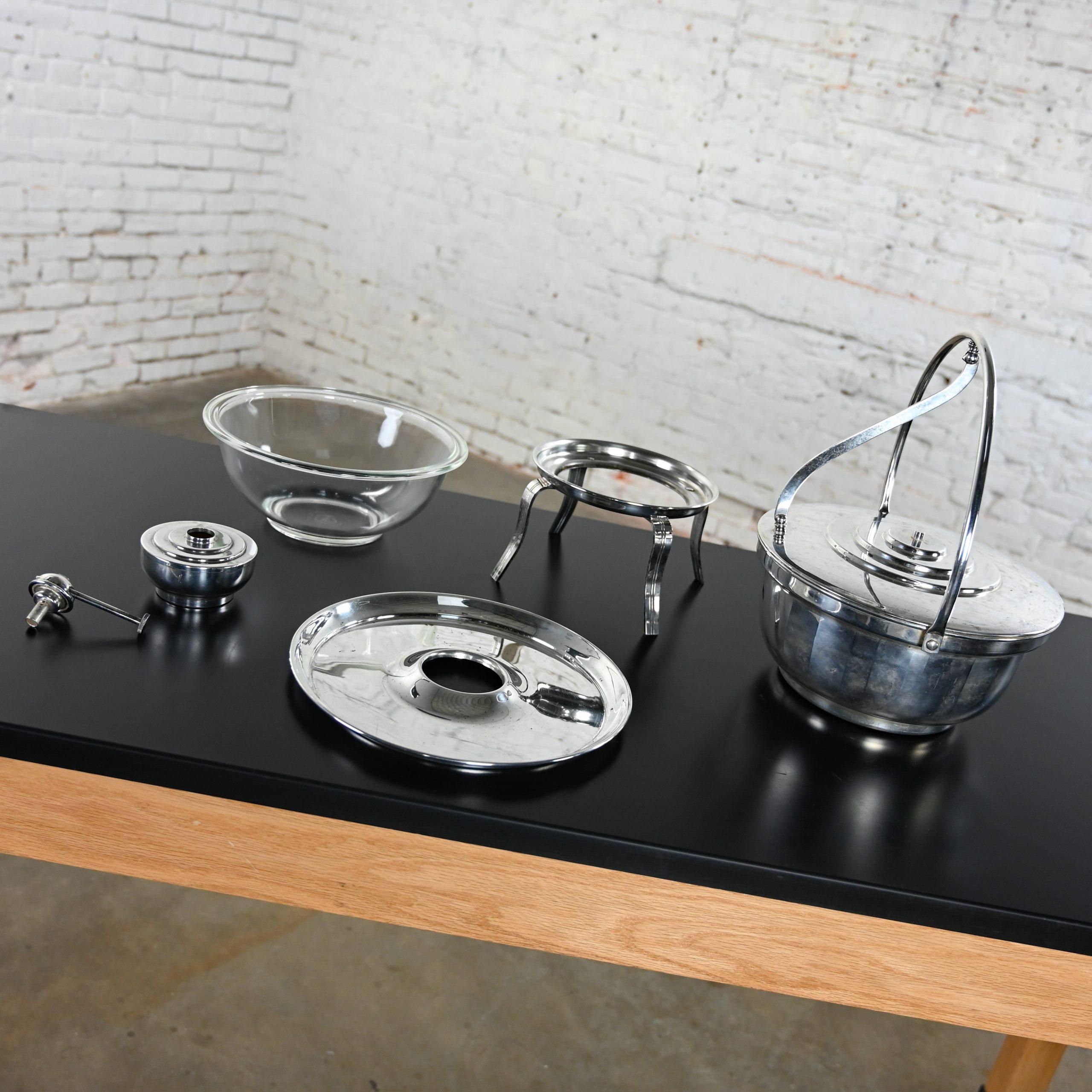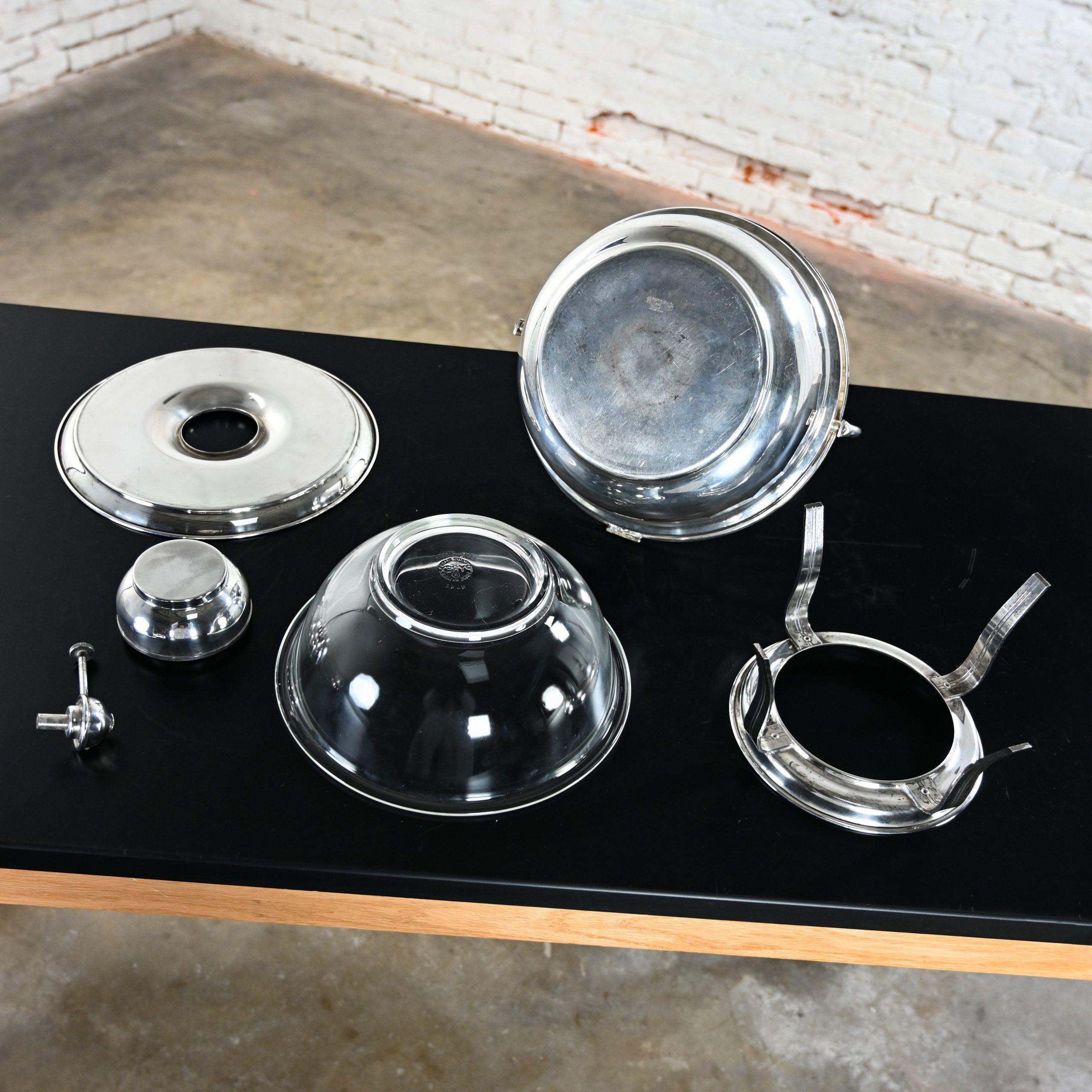 There are LOTS of boring ‘ol warmers, servers, and chafing dishes in this world. BUT, once in a blue moon you come across a unique, attractive, vintage, made in the USA chafing buffet set like THIS!!!! You heard that right!! This is a fabulous and functional vintage Art Deco Revival silver plated round chafing dish buffet set by English Silver Manufacturing Company comprised of 5 pieces including a round chafing pot with an attached handle with attached lid, a stand, a tray or base, round fuel burner, and round glass Pyrex bowl that sits inside the chafing pot. We researched high and low to find more information on English Silver Manufacturing Company and all we were able to retrieve is that they were active in the last half of the 20th Century… so not much, but no matter! This vintage buffet set is absolutely incredible!!! The silver plate has an all-over wonderful vintage patina appropriate with its age… that we particularly love, and it is super easy to use!! That’s right, this baby is FULLY functional. Simply pour liquid fuel in the burner, place it in the designated spot in the center of the tray, light the burner, place your goodies of choice in the user-friendly glass Pyrex bowl, and await your desired temperature. VOILA!! Warming made fashionable AND easy!!! And the lid has a convenient feature!! There is an S shaped lever attached to both the handle and lid designed to assist… when you lower the handle, you raise the lid… when you raise the handle, you lower the lid!! Isn’t that NICE!! Whether you are a collector of marvelous vintage cookware or love it as much as we do and intend to use it with your catering business, at parties, buffets, or family functions, it is SURE to impress everyone!! You simply MUST have this incredible vintage silver plated 5-piece chafing dish buffet set! Don’t hesitate to make it YOURS!!!