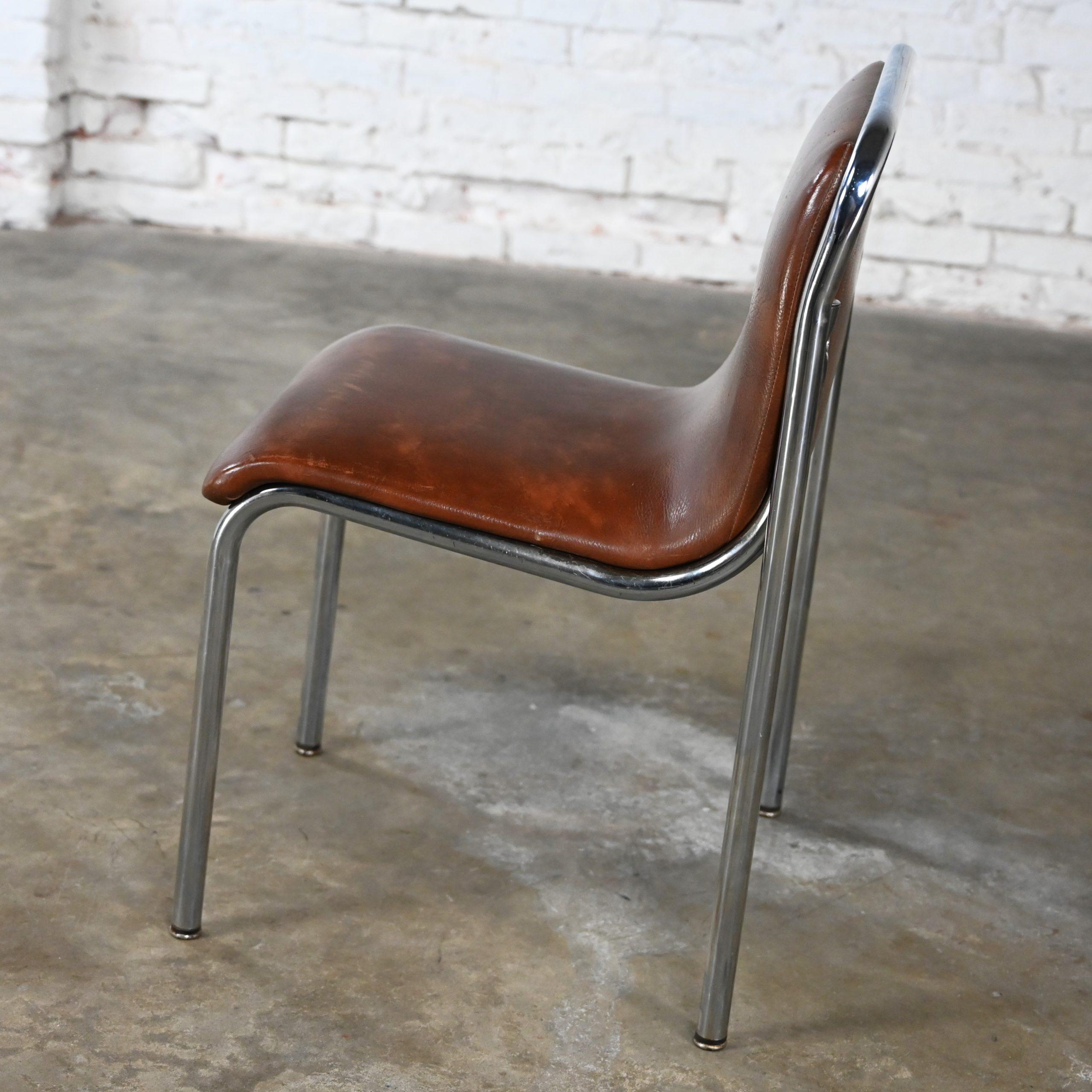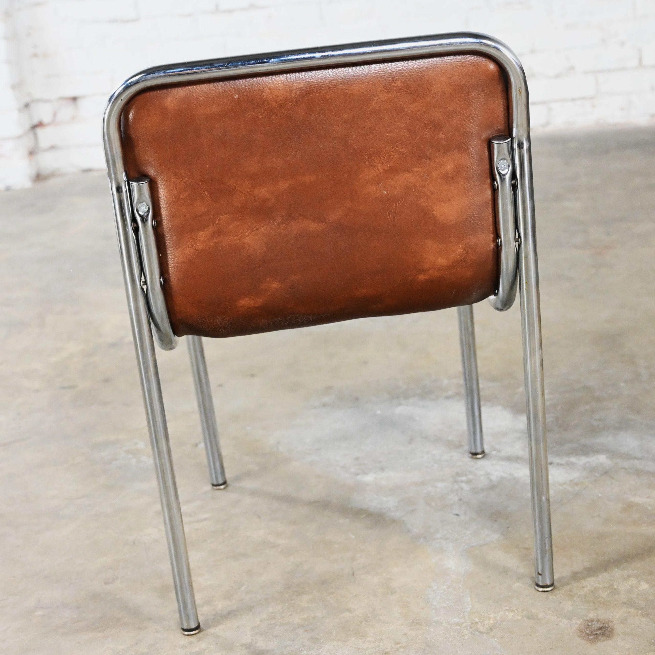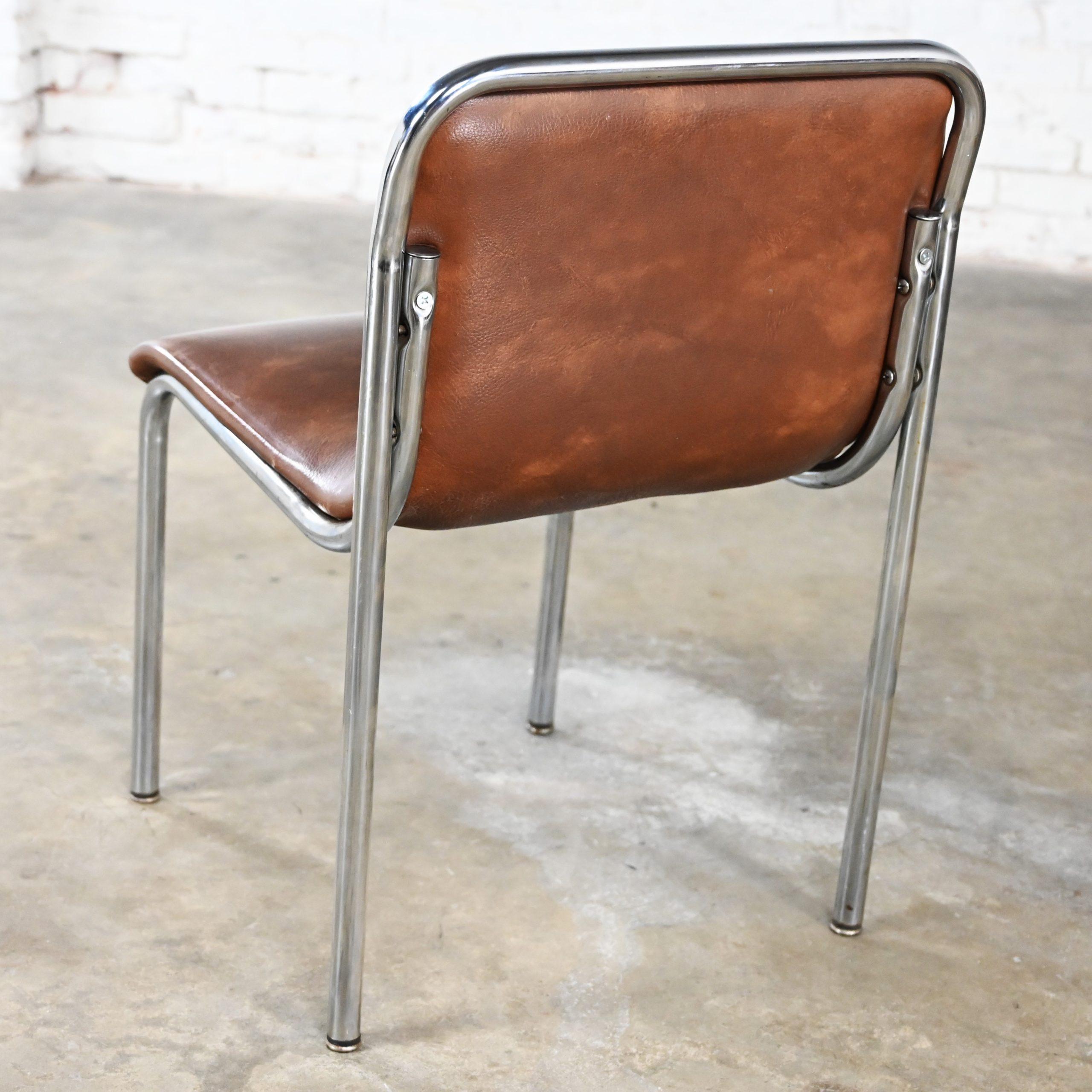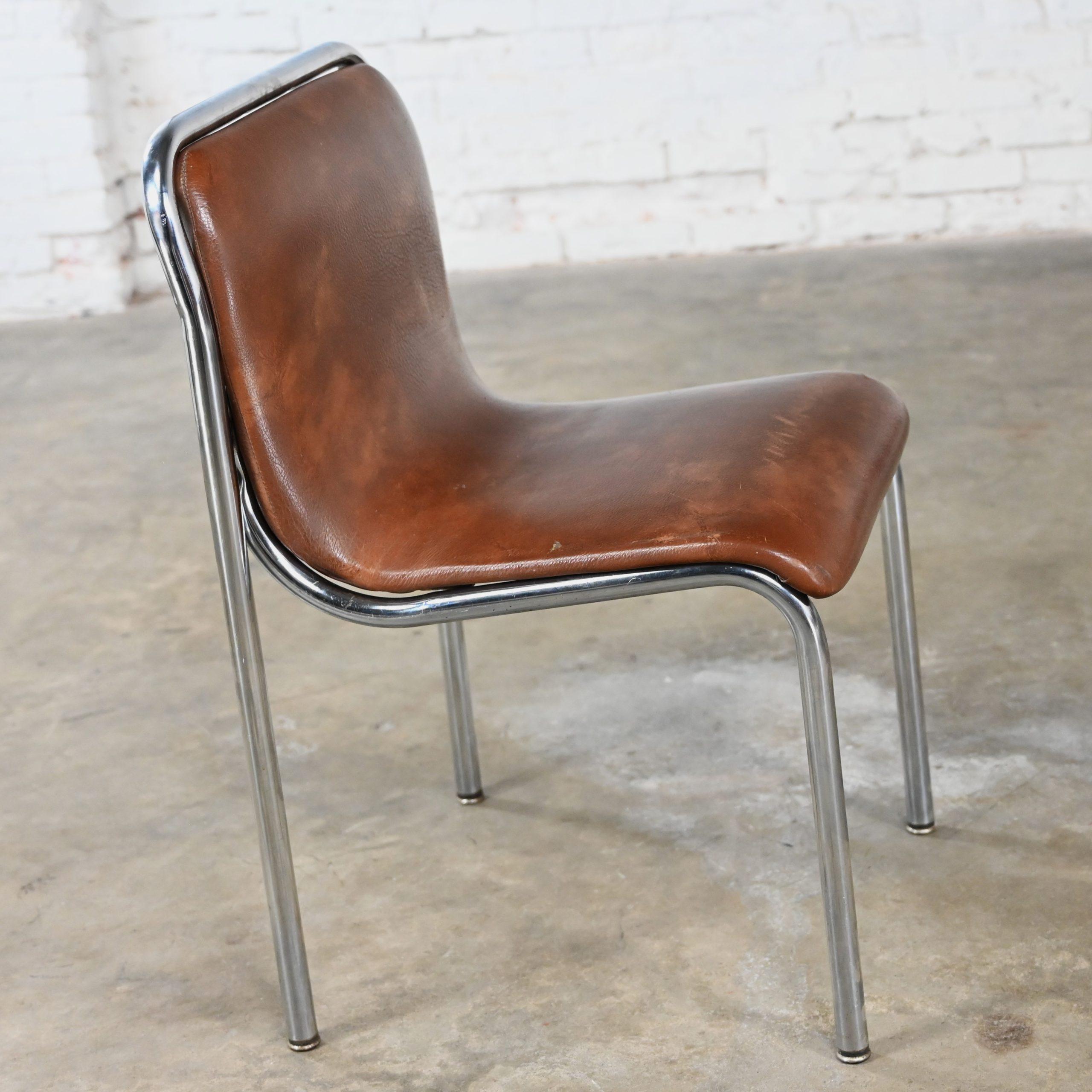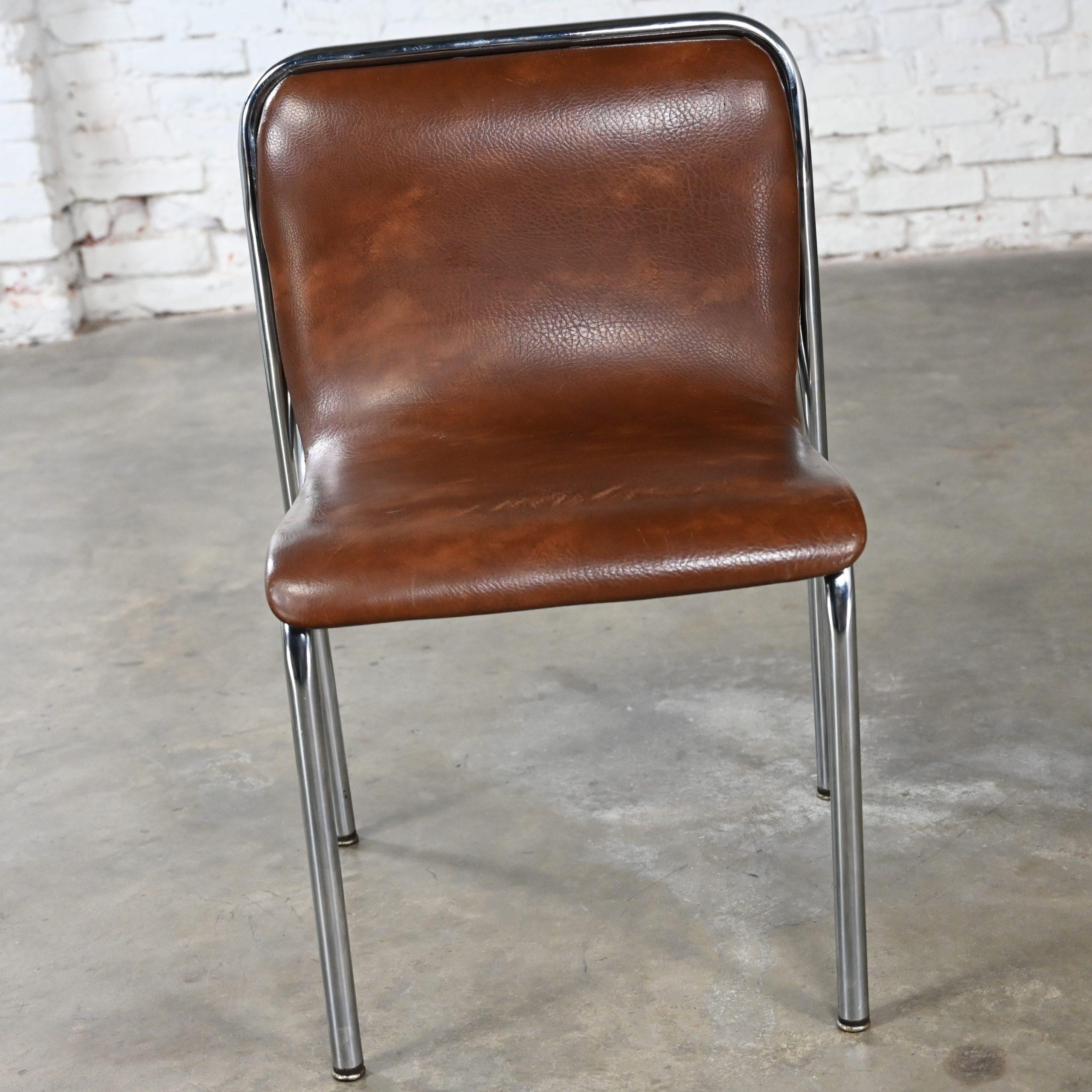 Get ready to be “Scooped” off your feet as you feast your eyes on these incredible scoop chairs!!! WOW!!!! These are INCREDIBLE scoop chairs by Jansko and we have 12 that we are selling separately. They are comprised of gorgeous chrome tube frames holding a curved scoop seat & back cushion which are wearing their original chocolate brown faux leather or vinyl. And though you can use them for a while eventually you will want to recover them. But think of the wonderful fabric options!!! They’re style borders from Bauhaus to Mid-Century Modern and they are nothing short of marvelous!!! Obviously, they are quite captivating to the eye but, talk about sturdy! So, you don’t have to sacrifice style for durability! They will be wonderful used as dining chairs, but they would be equally fabulous around an office or conference table, or at the family game table. Did your company show up unexpectedly? No problem! These are a great option for extra seating! And they’re conveniently stackable! When guests leave, stack them neatly away in the storage closet. Use one in a corner of your bedroom or dressing area, four at a smaller breakfast or game table, or eight or twelve at your dining table!! They would also be wonderful in an office waiting area, school or church function, or an entertaining event. And, if you’re in the market for a fabulous table that is large enough to accommodate these beauties, we have several listed here for sale that would host them perfectly! Check them out!! These scoop chairs have an attractive presence, substantial durability, AND they’re conveniently stackable! What more could you possibly want? Don’t hesitate… Make one, two, four, six, eight, or ALL 12 of them yours!!!