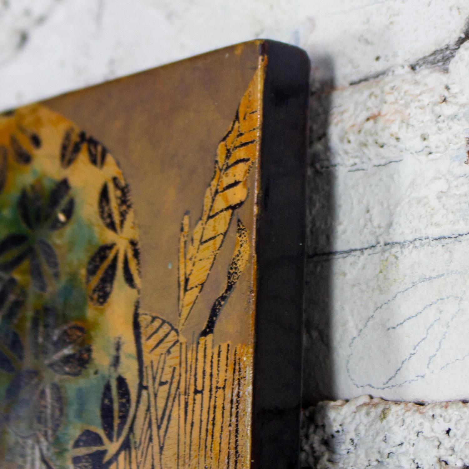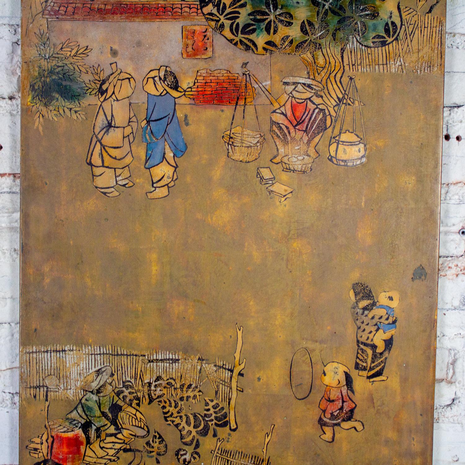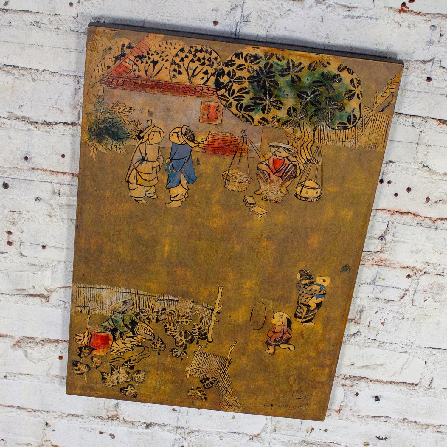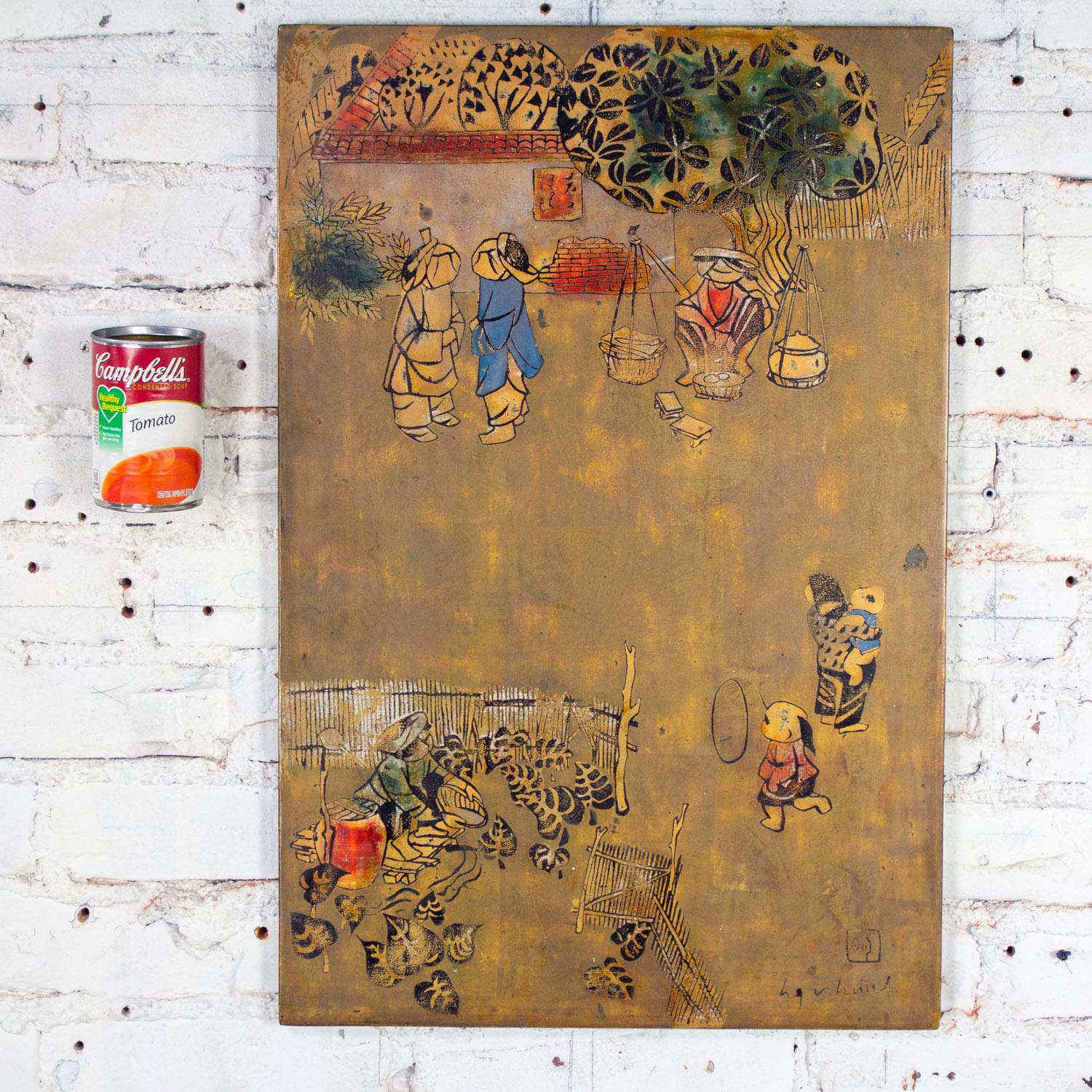 There are days it takes a Village… Am I right?? Well, folks… we may just have EXACTLY what you need!!!! Layers and Layers of LOVLINESS in this Village!!! This is a FABULOUS layered lacquer painting composed with gilt & polychrome on wood titled “Village Scene” signed by Vietnamese Master Lacquer Artist Nguyen Van Minh and it also bears his logo on the back of the painting. It features a traditional Vietnamese village scene with adults and children going about their day in the simple life within their community. The setting features two people, deep in conversation (WHAT ARE THEY TALKING ABOUT!?!? I know… I’m pretty nosey!!) I bet the one guy wants to know where the other guy got that awesome blue coat!! That’s my guess!! LOL… Meanwhile, another man sits nearby under a mature, blooming tree awaiting a customer that may need a good foot wash, heel scrub, or pedicure. Sounds good to me!! It looks like it may be a warm dry day, sand or dirt fills the ground space… no grass in the courtyard, but there are some leaves blowing about. And, if you take a glance down to the lower left corner… a sweet lady appears to be offering a cold drink to a child playing outside her fenced yard. The child’s mother stands nearby… a baby perched upon her hip gazing with awe at the foot washing station… probably LONGING to sit down for that pedicure!! I hear ya lady!! Behind the patrons sits a small house or building with a ruby red roof and a peek of brick showing through the cracked outer stone wall and a wonderful line of tall, towering trees fades off in the distance. How serene!!! This painting was masterfully created over time with precise technique involving layers & layers of lacquer, intricate hand painting, fading, gilt, & polychrome on a wonderful wood canvas. It exhibits fantastic colors of brown, gold, green, blue, black & red & it’s about 24H x 16W. It is going to be marvelous on ANY wall waiting for an incredible example of Vietnamese artistry & a unique conversation piece.