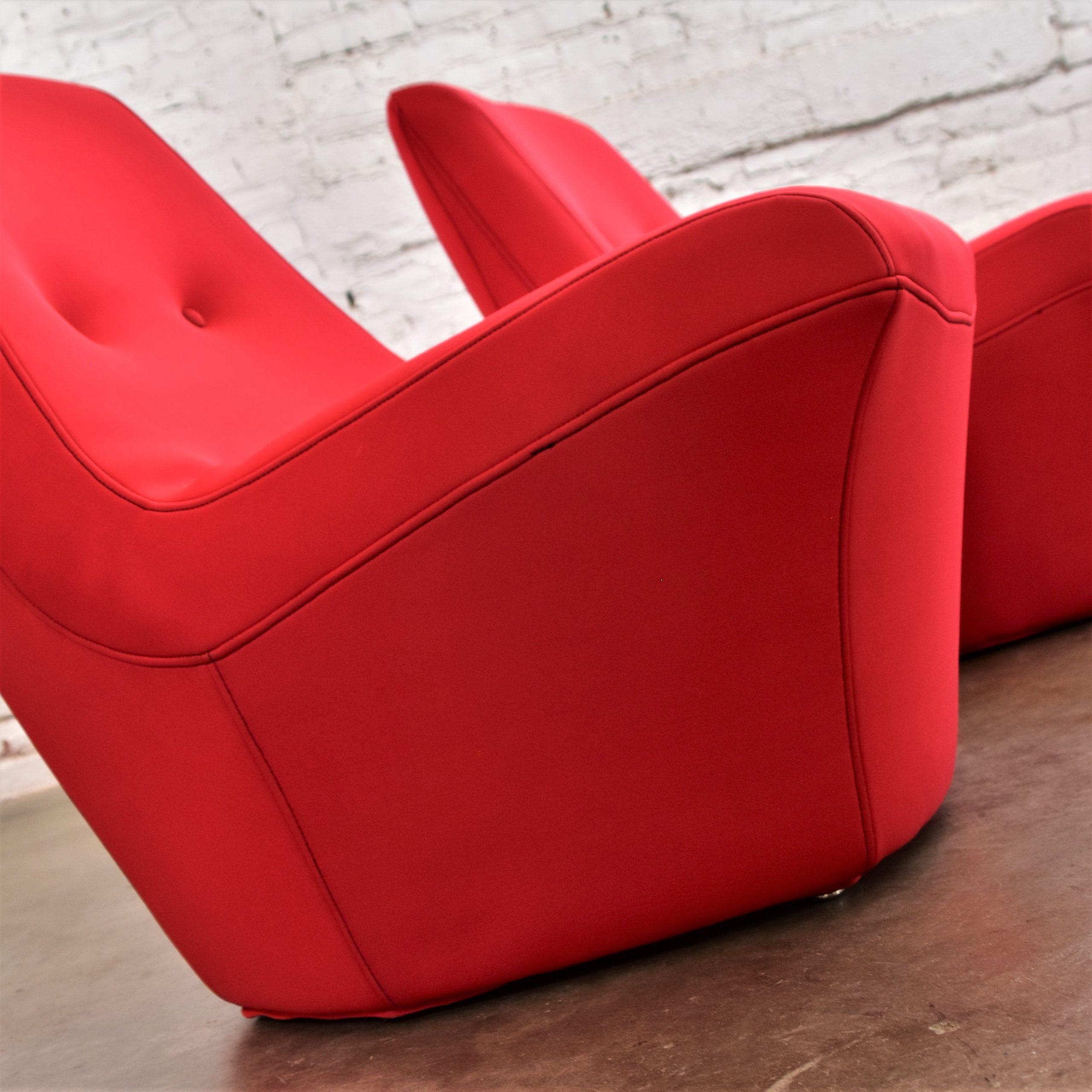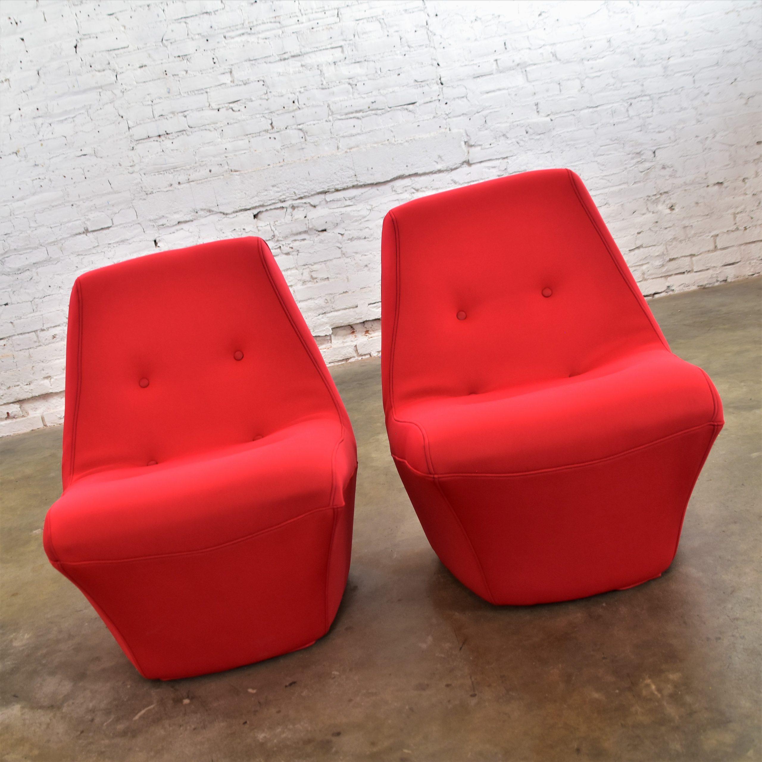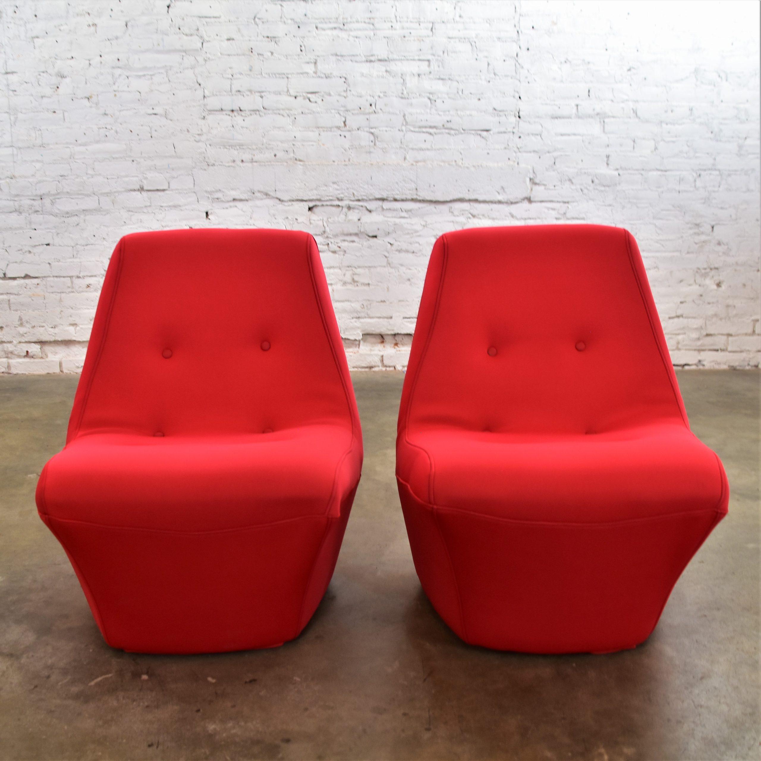 Does it really get any cooler than Mod style slipper chairs with RED wet suit fabric??? We think NOT!!!! We are in LOVE with this pair of awesome mid-century modern bright red slipper chairs by Founders Furniture. These scoop style chairs are beautifully reupholstered in a neoprene bonded sponge waterproof wet suit fabric from Big Z Fabric…AND it’s 3 MM thick with buttons! SO COOL… The scoop design allows for a deep sitting experience that is comfortable and oh-so-full-of-style! They would be wonderful in your living room across from your sofa, in a family or game room, or in a sitting room with a table between. We have several listed here for sale that would pair with these chairs nicely… check them out! This pair of vintage Founders Furniture bright red slipper chairs is sure to brighten any room you place them, and they’re sure to make a BOLD mid-century modern statement!!