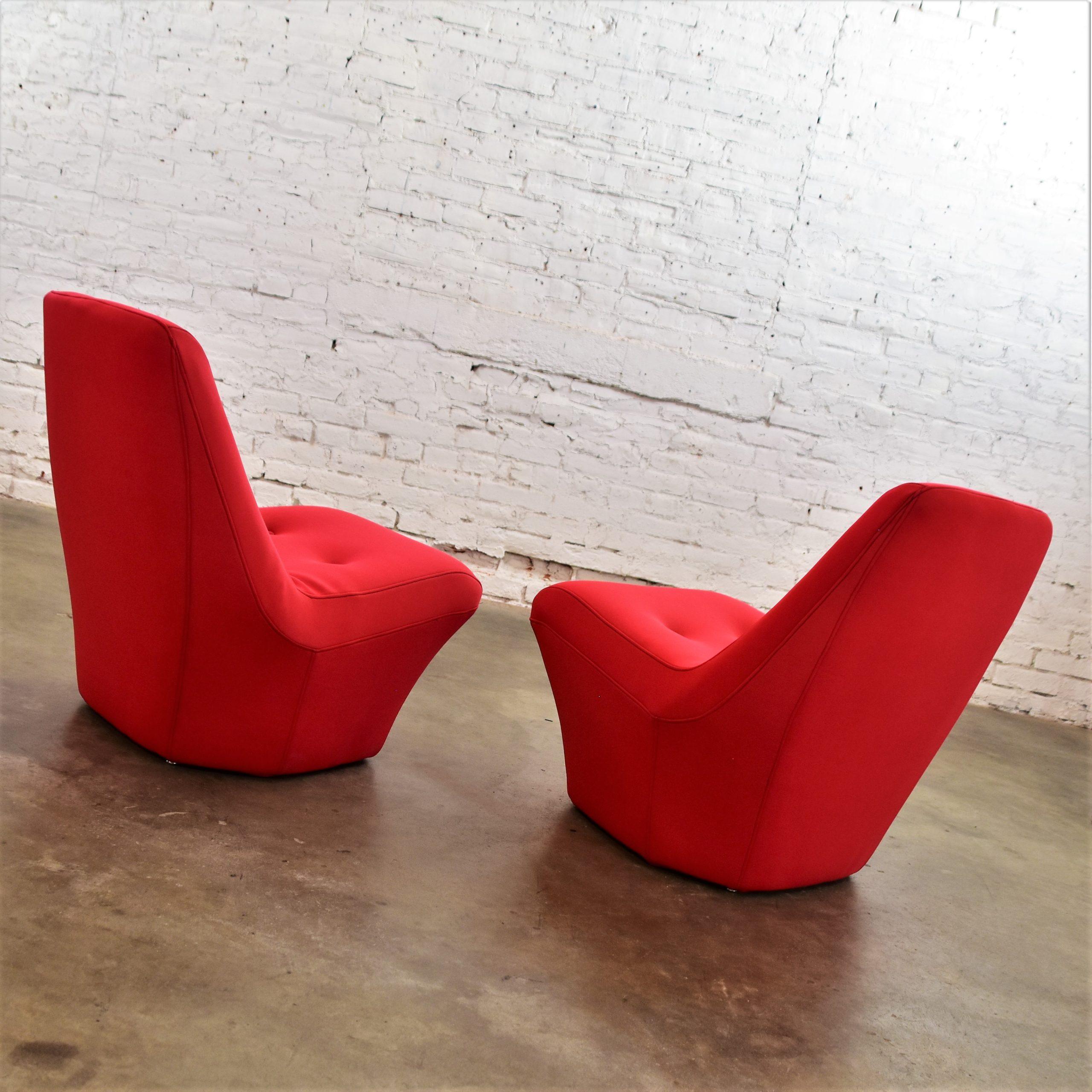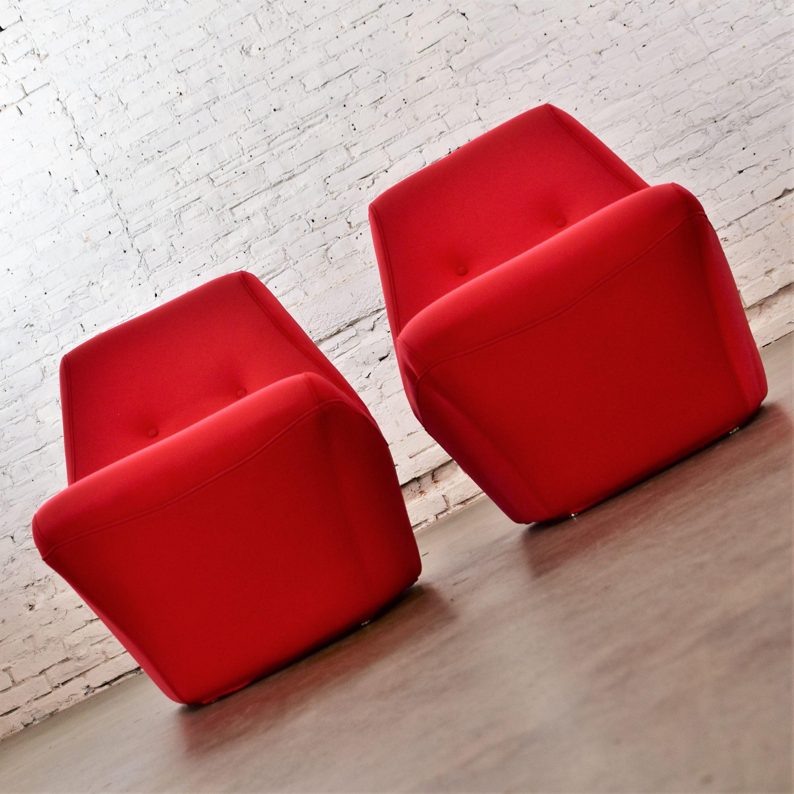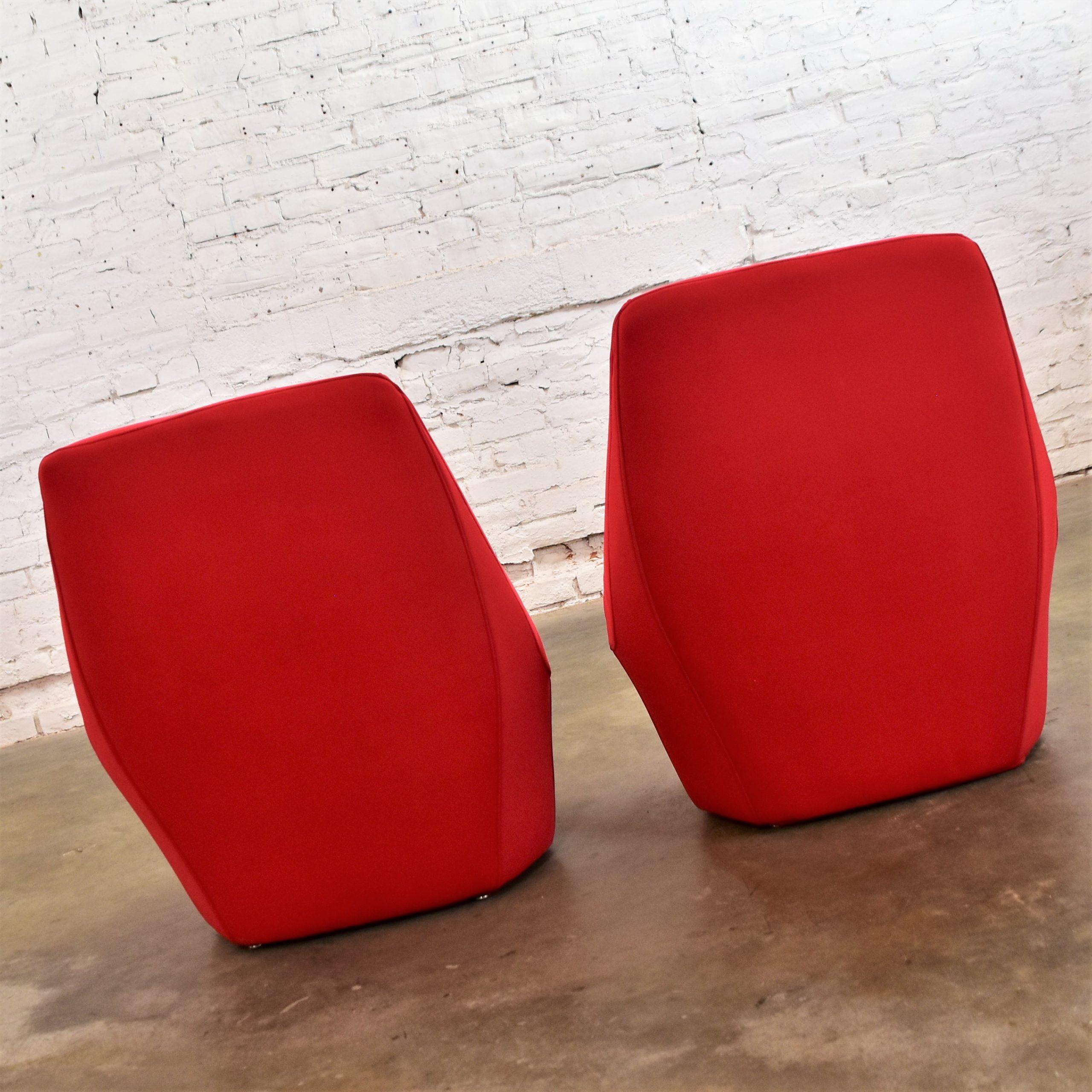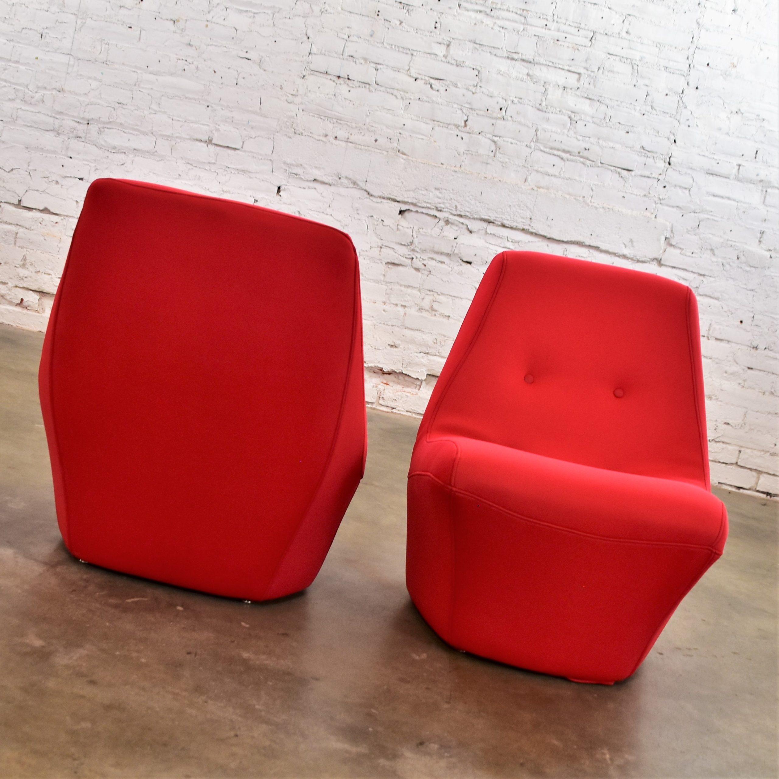Does it really get any cooler than Mod style slipper chairs with RED wet suit fabric??? We think NOT!!!! We are in LOVE with this pair of awesome mid-century modern bright red slipper chairs by Founders Furniture. These scoop style chairs are beautifully reupholstered in a neoprene bonded sponge waterproof wet suit fabric from Big Z Fabric…AND it’s 3 MM thick with buttons! SO COOL… The scoop design allows for a deep sitting experience that is comfortable and oh-so-full-of-style! They would be wonderful in your living room across from your sofa, in a family or game room, or in a sitting room with a table between. We have several listed here for sale that would pair with these chairs nicely… check them out! This pair of vintage Founders Furniture bright red slipper chairs is sure to brighten any room you place them, and they’re sure to make a BOLD mid-century modern statement!!